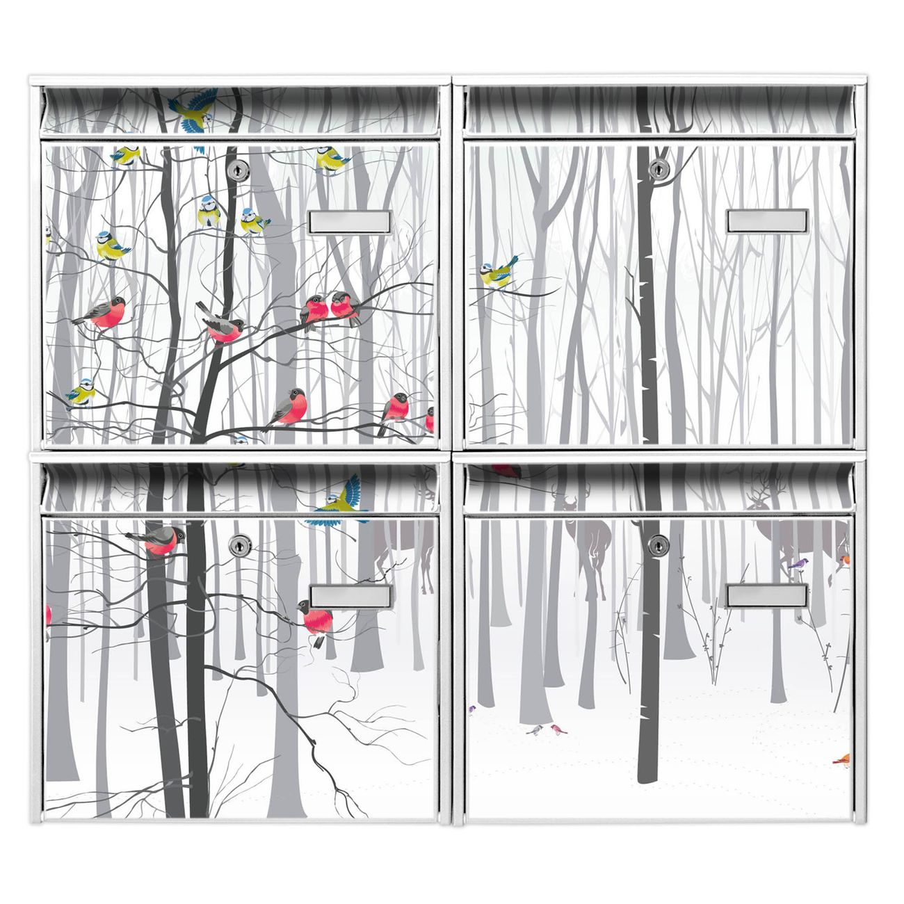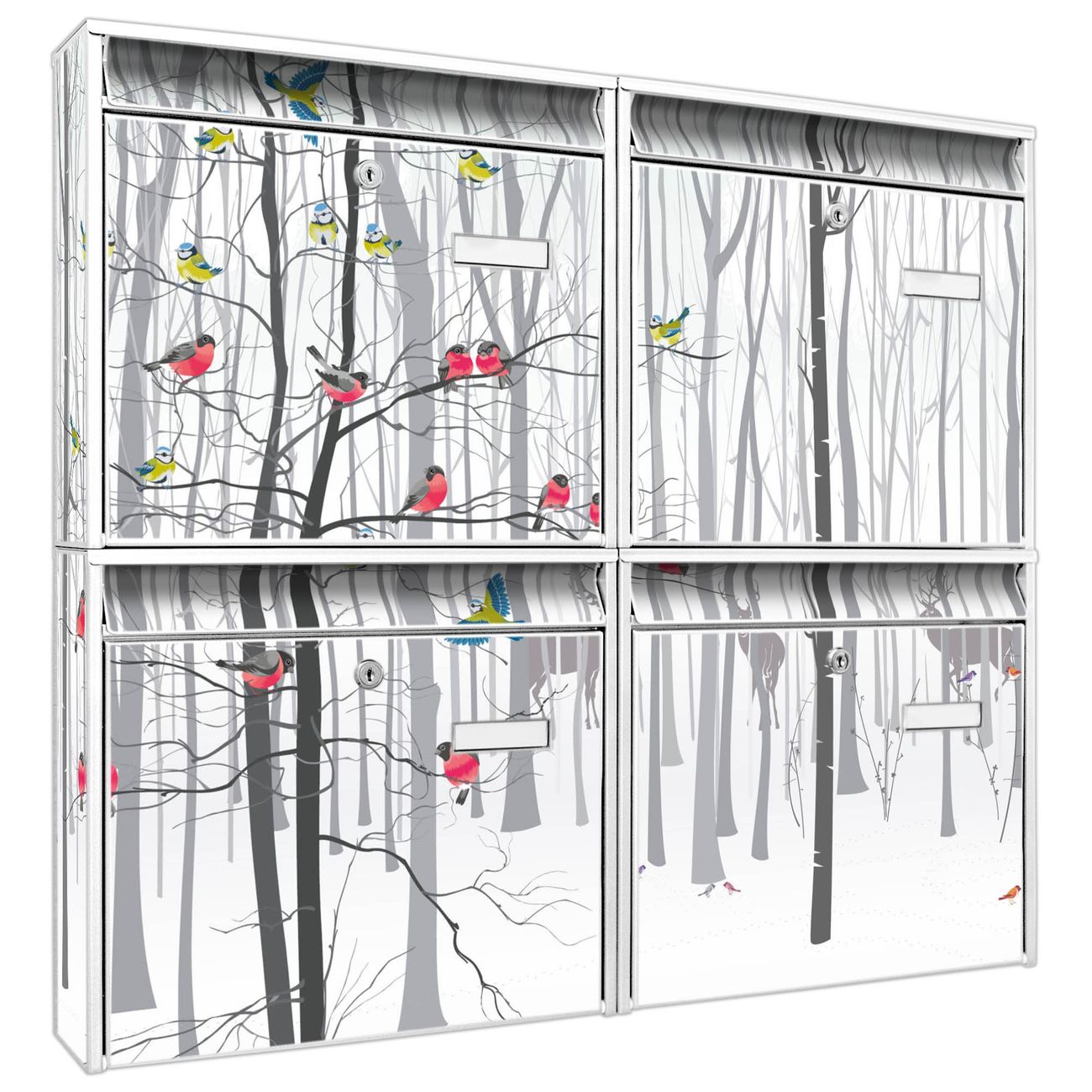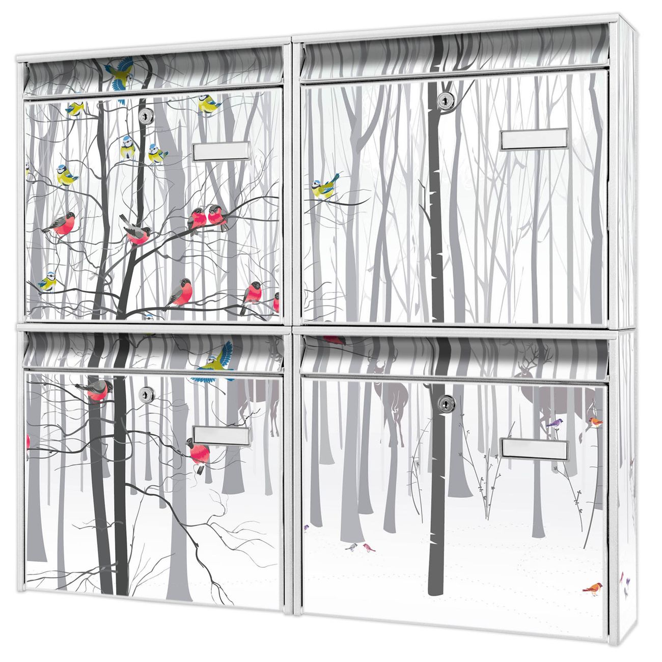 FUNKTION: Die Burg-Wächter Briefkastenanlage mit Motiv Winterwald bietet Ihnen ausreichend Fassungsvermögen um auch A4 und C4 Sendungen zu empfangen. Das integrierte Namensschild lässt sich individuell beschriften. Wählen Sie aus den Grundfarben weiß, silber und schwarz. DESIGN: Die 4 Briefkästen haben ein ansprechendes und zeitloses Design, ohne dabei auf Funktionalität zu verzichten. Das Material ist sehr stabil, wetterfest und rostfrei. Durch das Motiv Winterwald werden die Postkästen zu einem Blickfang. DETAILS: Die Postkästen bestehen aus verzinktem Stahl der zusätzlich mit Klarlack versiegelt wurde. Die Kästen sind gesamt 64,5cm hoch, 72,5cm breit und 10cm tief. Das Motiv besteht aus einer wetter- und UV-festen Folie, die Ihren Briefkasten zusätzlich vor Kratzern schützt. Die Postkästen werden mit Montagematerial, je einem Namensschild und je zwei Schlüsseln geliefert. NUTZEN: Das Briefkastenset eignet sich für die Wandmontage, die Größe bietet genügend Platz für Sendungen aller Art. Das zeitlose Design sowie die stabile Bauart bieten Ihnen einen treuen Begleiter für Ihre Post. BANJADO:
