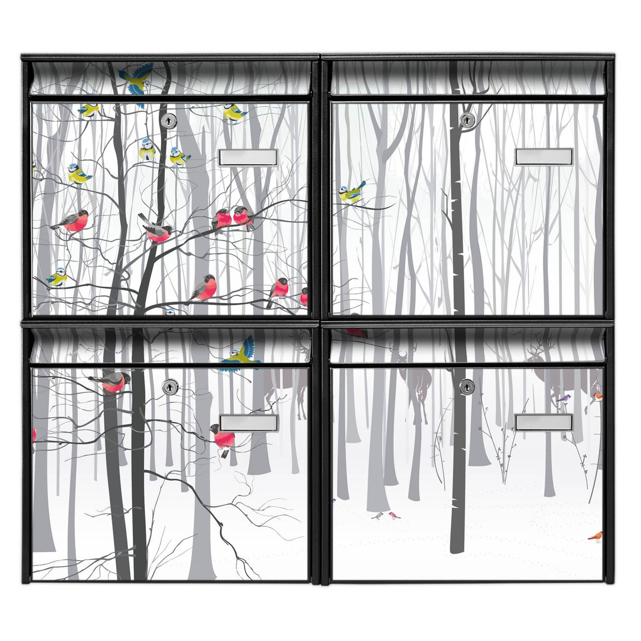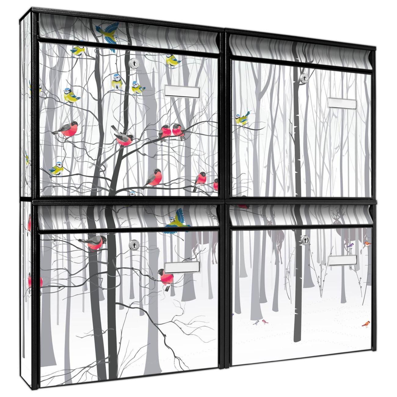 FUNKTION: Die Burg-Wächter Briefkastenanlage mit Motiv Winterwald bietet Ihnen ausreichend Fassungsvermögen um auch A4 und C4 Sendungen zu empfangen. Das integrierte Namensschild lässt sich individuell beschriften. Wählen Sie aus den Grundfarben weiß, silber und schwarz. DESIGN: Die 4 Briefkästen haben ein ansprechendes und zeitloses Design, ohne dabei auf Funktionalität zu verzichten. Das Material ist sehr stabil, wetterfest und rostfrei. Durch das Motiv Winterwald werden die Postkästen zu einem Blickfang. DETAILS: Die Postkästen bestehen aus verzinktem Stahl der zusätzlich mit Klarlack versiegelt wurde. Die Kästen sind gesamt 64,5cm hoch, 72,5cm breit und 10cm tief. Das Motiv besteht aus einer wetter- und UV-festen Folie, die Ihren Briefkasten zusätzlich vor Kratzern schützt. Die Postkästen werden mit Montagematerial, je einem Namensschild und je zwei Schlüsseln geliefert. NUTZEN: Das Briefkastenset eignet sich für die Wandmontage, die Größe bietet genügend Platz für Sendungen aller Art. Das zeitlose Design sowie die stabile Bauart bieten Ihnen einen treuen Begleiter für Ihre Post. BANJADO: