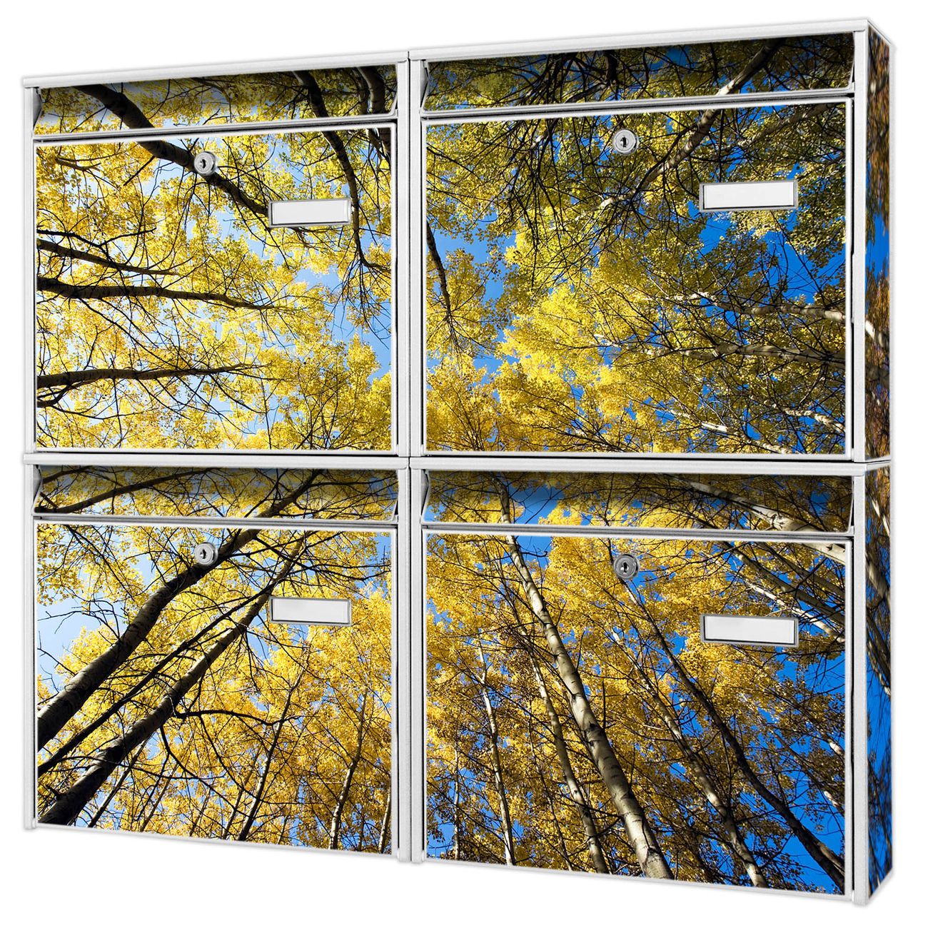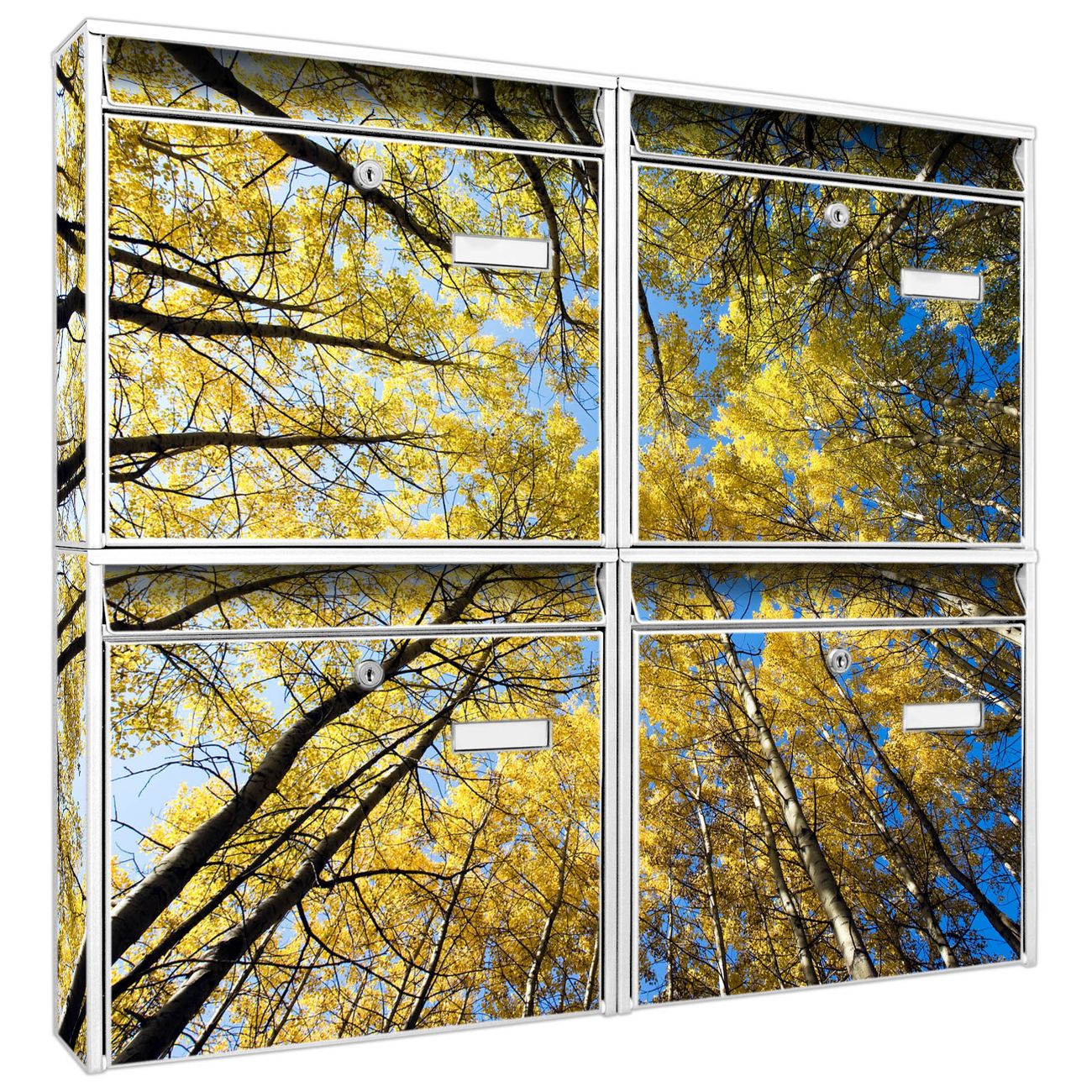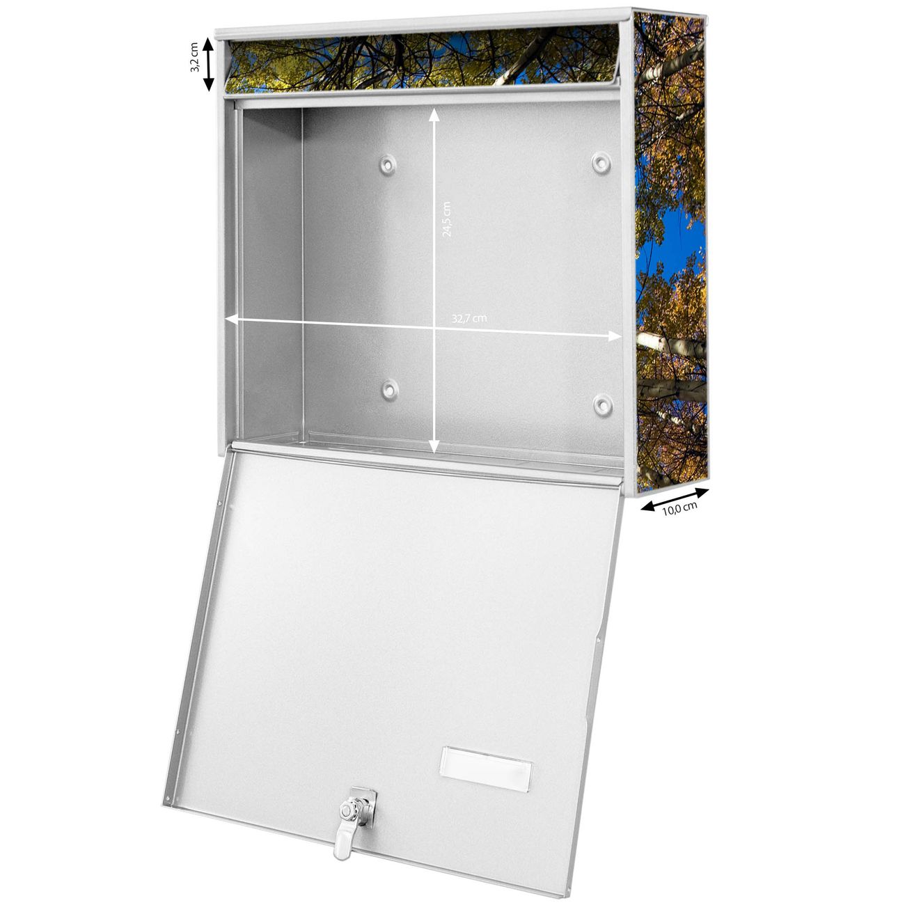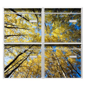 FUNKTION: Die Burg-Wächter Briefkastenanlage mit Motiv Wipfel bietet Ihnen ausreichend Fassungsvermögen um auch A4 und C4 Sendungen zu empfangen. Das integrierte Namensschild lässt sich individuell beschriften. Wählen Sie aus den Grundfarben weiß, silber und schwarz. DESIGN: Die 4 Briefkästen haben ein ansprechendes und zeitloses Design, ohne dabei auf Funktionalität zu verzichten. Das Material ist sehr stabil, wetterfest und rostfrei. Durch das Motiv Wipfel werden die Postkästen zu einem Blickfang. DETAILS: Die Postkästen bestehen aus verzinktem Stahl der zusätzlich mit Klarlack versiegelt wurde. Die Kästen sind gesamt 64,5cm hoch, 72,5cm breit und 10cm tief. Das Motiv besteht aus einer wetter- und UV-festen Folie, die Ihren Briefkasten zusätzlich vor Kratzern schützt. Die Postkästen werden mit Montagematerial, je einem Namensschild und je zwei Schlüsseln geliefert. NUTZEN: Das Briefkastenset eignet sich für die Wandmontage, die Größe bietet genügend Platz für Sendungen aller Art. Das zeitlose Design sowie die stabile Bauart bieten Ihnen einen treuen Begleiter für Ihre Post. BANJADO: