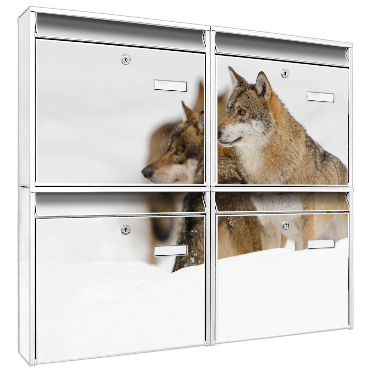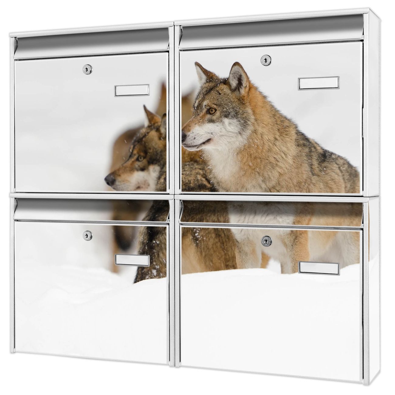 FUNKTION: Die Burg-Wächter Briefkastenanlage mit Motiv Wölfe bietet Ihnen ausreichend Fassungsvermögen um auch A4 und C4 Sendungen zu empfangen. Das integrierte Namensschild lässt sich individuell beschriften. Wählen Sie aus den Grundfarben weiß, silber und schwarz. DESIGN: Die 4 Briefkästen haben ein ansprechendes und zeitloses Design, ohne dabei auf Funktionalität zu verzichten. Das Material ist sehr stabil, wetterfest und rostfrei. Durch das Motiv Wölfe werden die Postkästen zu einem Blickfang. DETAILS: Die Postkästen bestehen aus verzinktem Stahl der zusätzlich mit Klarlack versiegelt wurde. Die Kästen sind gesamt 64,5cm hoch, 72,5cm breit und 10cm tief. Das Motiv besteht aus einer wetter- und UV-festen Folie, die Ihren Briefkasten zusätzlich vor Kratzern schützt. Die Postkästen werden mit Montagematerial, je einem Namensschild und je zwei Schlüsseln geliefert. NUTZEN: Das Briefkastenset eignet sich für die Wandmontage, die Größe bietet genügend Platz für Sendungen aller Art. Das zeitlose Design sowie die stabile Bauart bieten Ihnen einen treuen Begleiter für Ihre Post. BANJADO:
