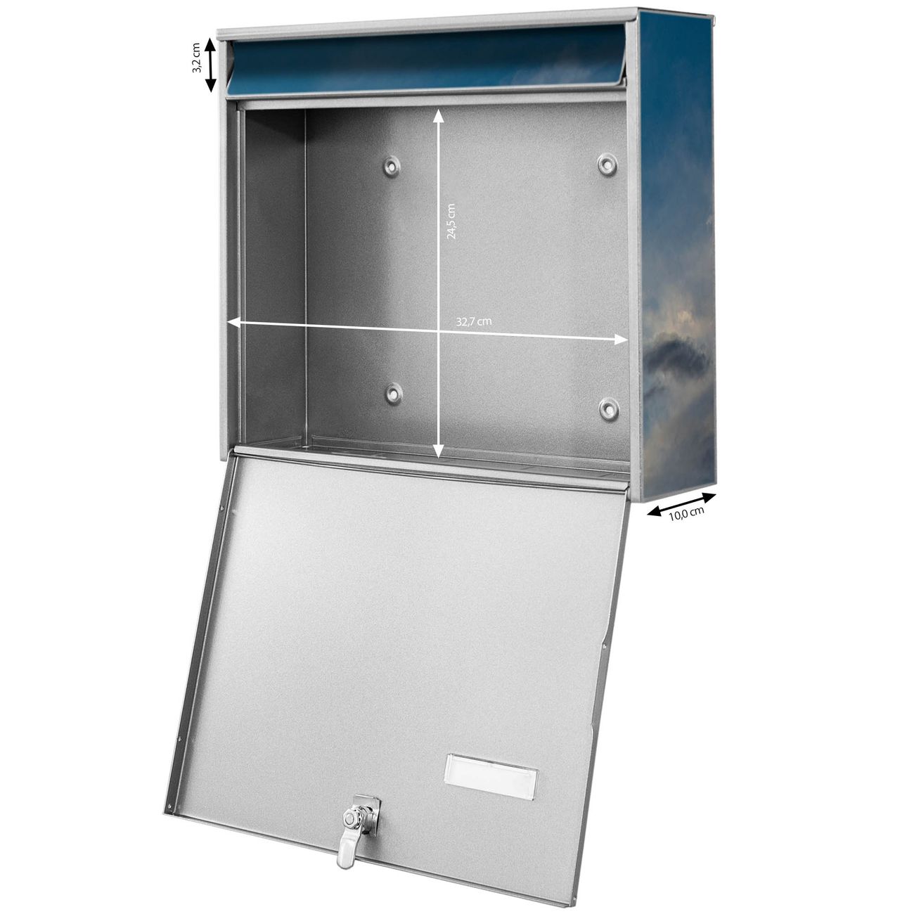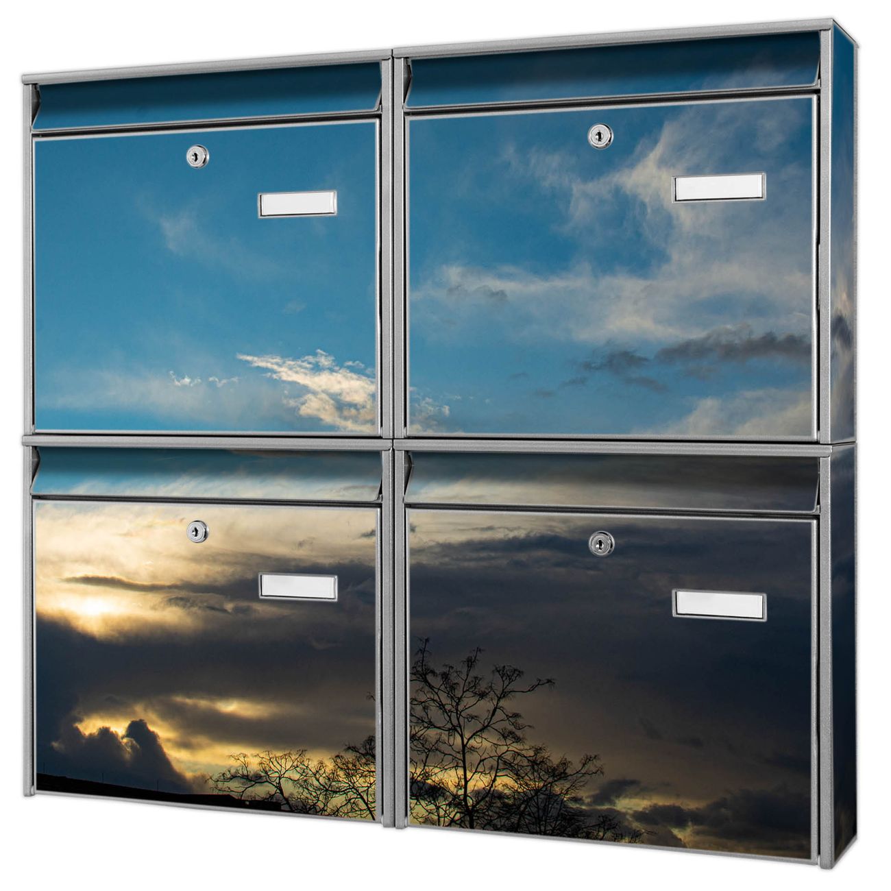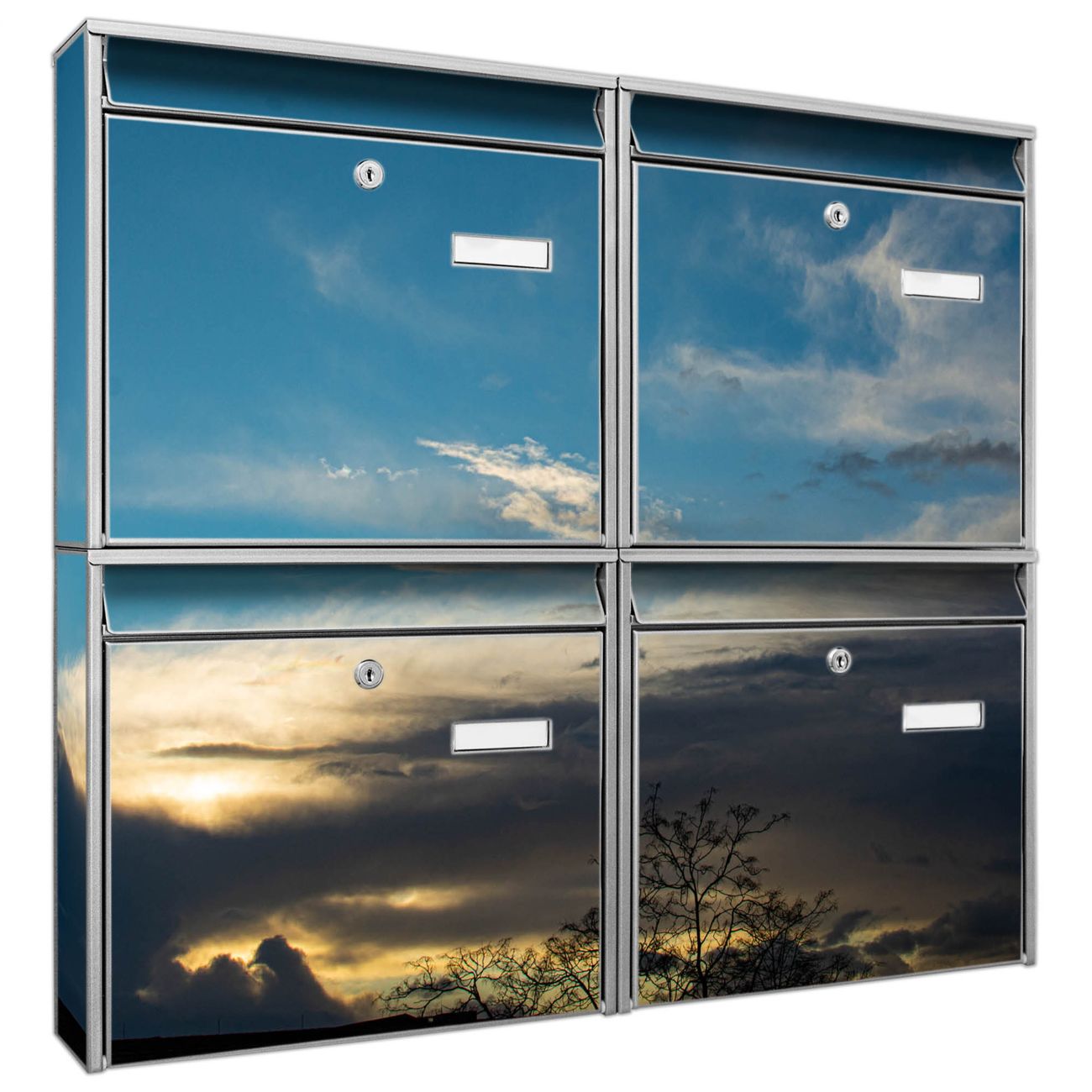 FUNKTION: Die Burg-Wächter Briefkastenanlage mit Motiv Wolken 7 bietet Ihnen ausreichend Fassungsvermögen um auch A4 und C4 Sendungen zu empfangen. Das integrierte Namensschild lässt sich individuell beschriften. Wählen Sie aus den Grundfarben weiß, silber und schwarz. DESIGN: Die 4 Briefkästen haben ein ansprechendes und zeitloses Design, ohne dabei auf Funktionalität zu verzichten. Das Material ist sehr stabil, wetterfest und rostfrei. Durch das Motiv Wolken 7 werden die Postkästen zu einem Blickfang. DETAILS: Die Postkästen bestehen aus verzinktem Stahl der zusätzlich mit Klarlack versiegelt wurde. Die Kästen sind gesamt 64,5cm hoch, 72,5cm breit und 10cm tief. Das Motiv besteht aus einer wetter- und UV-festen Folie, die Ihren Briefkasten zusätzlich vor Kratzern schützt. Die Postkästen werden mit Montagematerial, je einem Namensschild und je zwei Schlüsseln geliefert. NUTZEN: Das Briefkastenset eignet sich für die Wandmontage, die Größe bietet genügend Platz für Sendungen aller Art. Das zeitlose Design sowie die stabile Bauart bieten Ihnen einen treuen Begleiter für Ihre Post. BANJADO: