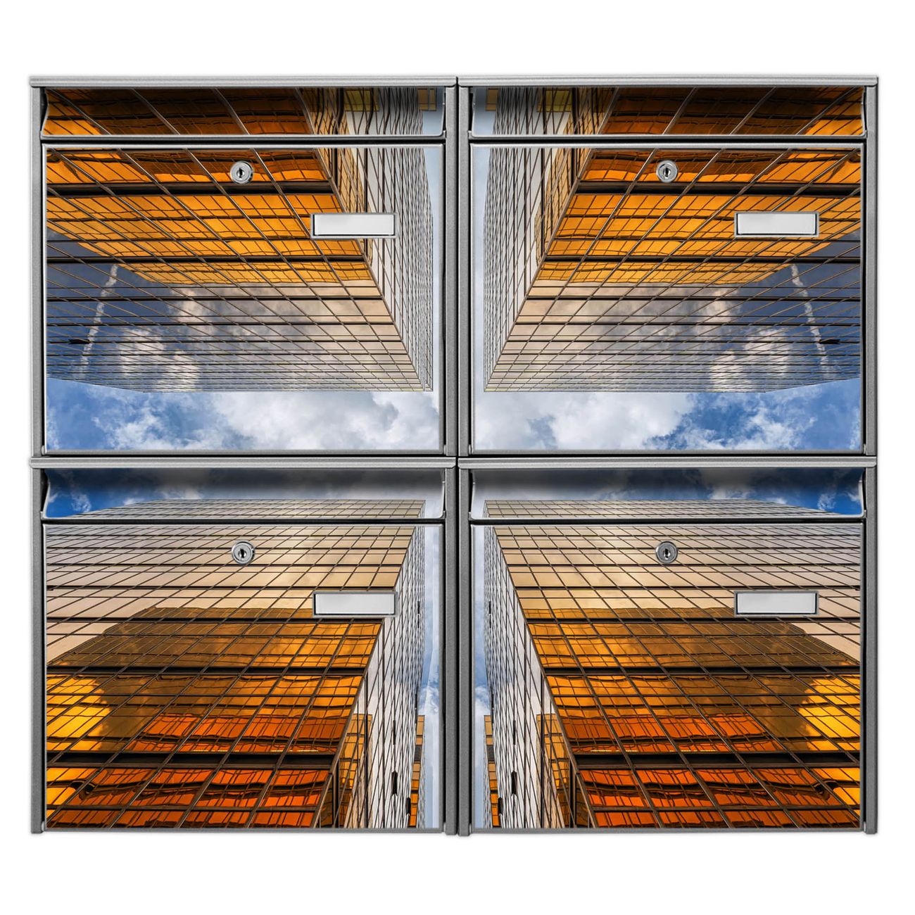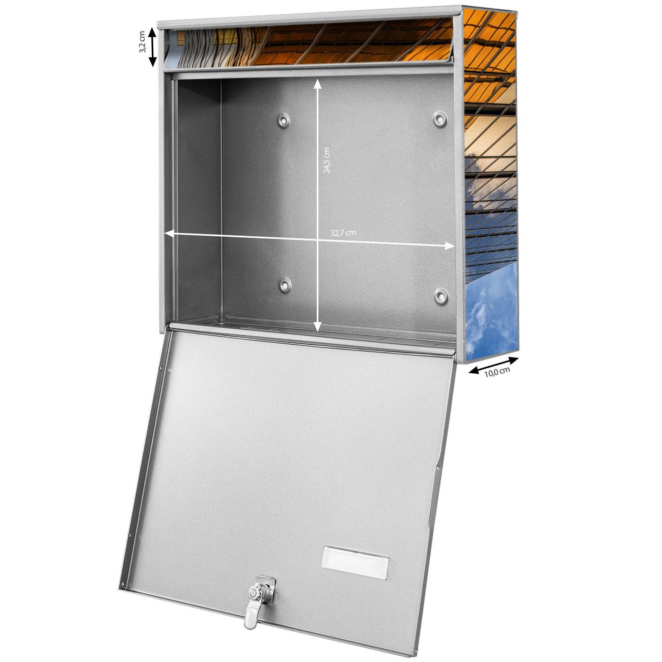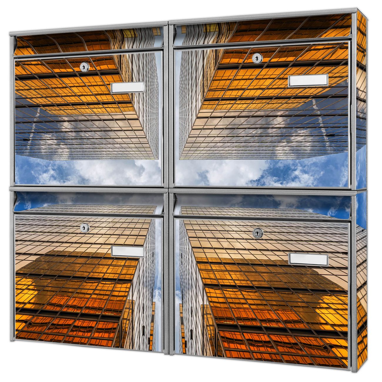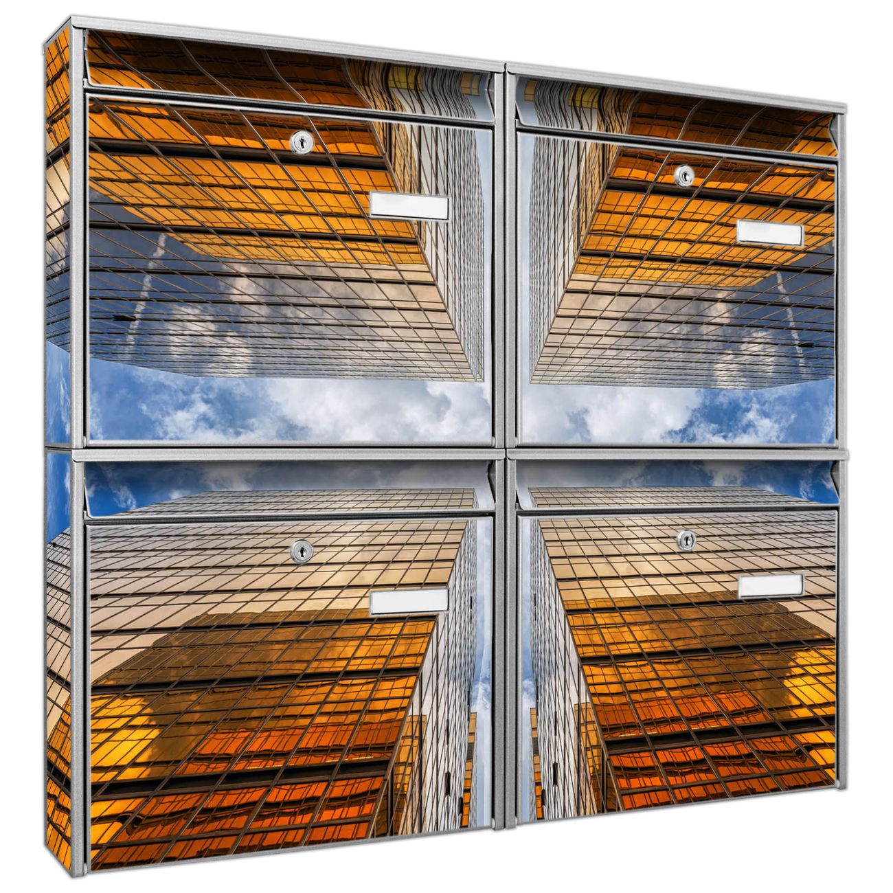 FUNKTION: Die Burg-Wächter Briefkastenanlage mit Motiv Wolkenkratzer 2 bietet Ihnen ausreichend Fassungsvermögen um auch A4 und C4 Sendungen zu empfangen. Das integrierte Namensschild lässt sich individuell beschriften. Wählen Sie aus den Grundfarben weiß, silber und schwarz. DESIGN: Die 4 Briefkästen haben ein ansprechendes und zeitloses Design, ohne dabei auf Funktionalität zu verzichten. Das Material ist sehr stabil, wetterfest und rostfrei. Durch das Motiv Wolkenkratzer 2 werden die Postkästen zu einem Blickfang. DETAILS: Die Postkästen bestehen aus verzinktem Stahl der zusätzlich mit Klarlack versiegelt wurde. Die Kästen sind gesamt 64,5cm hoch, 72,5cm breit und 10cm tief. Das Motiv besteht aus einer wetter- und UV-festen Folie, die Ihren Briefkasten zusätzlich vor Kratzern schützt. Die Postkästen werden mit Montagematerial, je einem Namensschild und je zwei Schlüsseln geliefert. NUTZEN: Das Briefkastenset eignet sich für die Wandmontage, die Größe bietet genügend Platz für Sendungen aller Art. Das zeitlose Design sowie die stabile Bauart bieten Ihnen einen treuen Begleiter für Ihre Post. BANJADO: