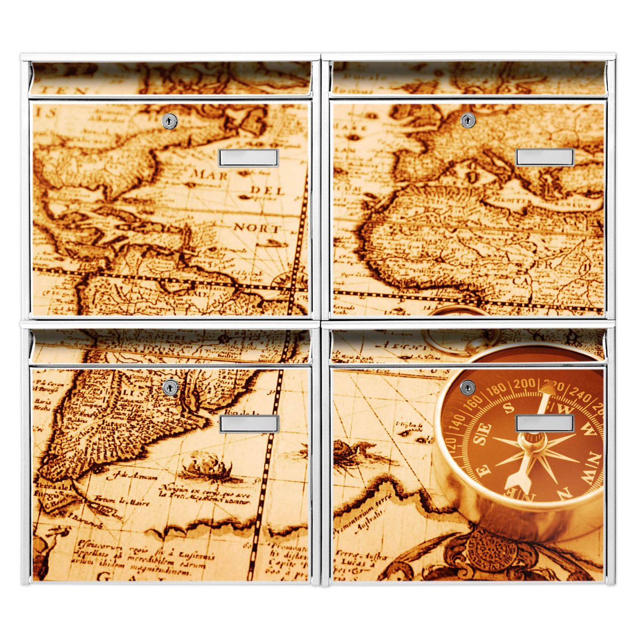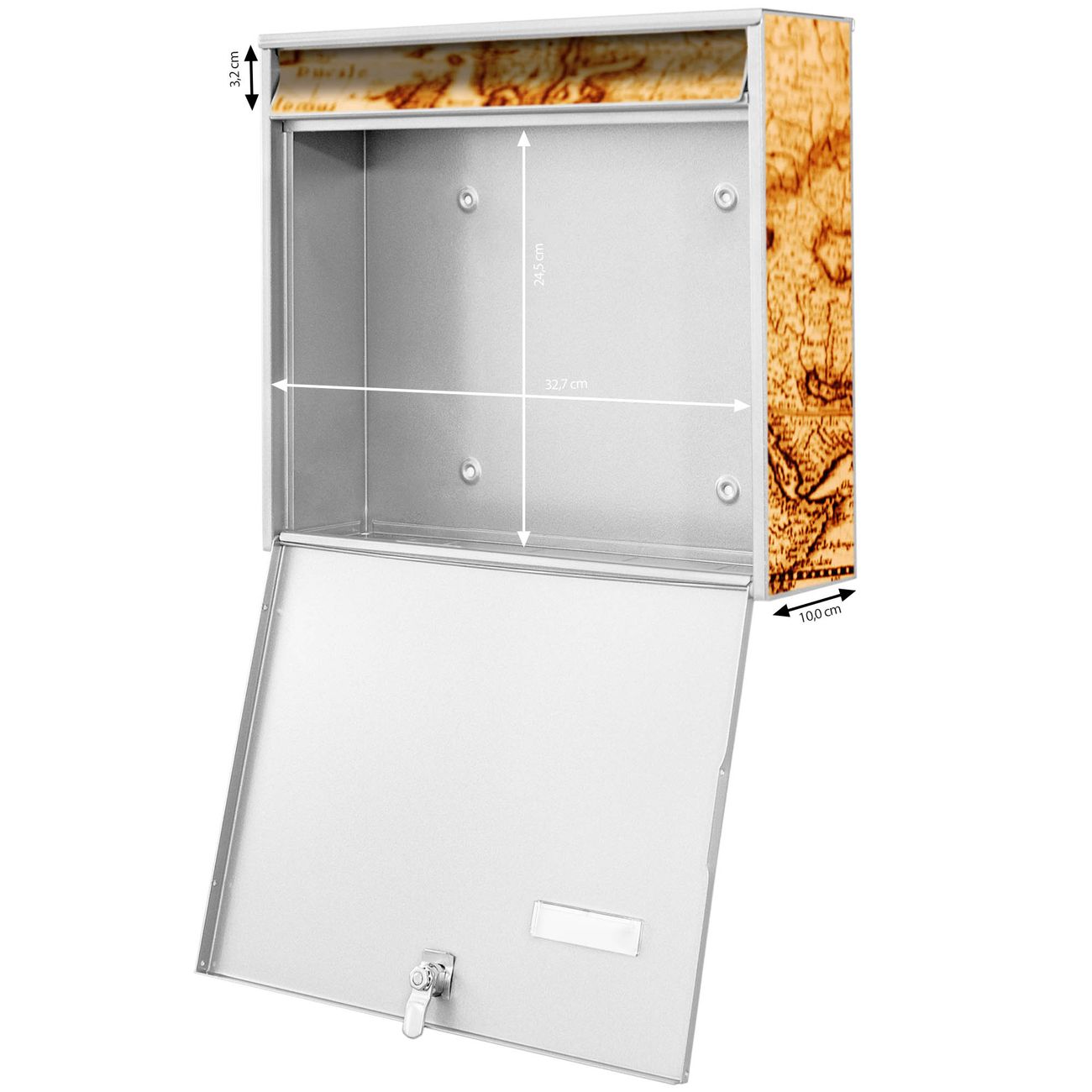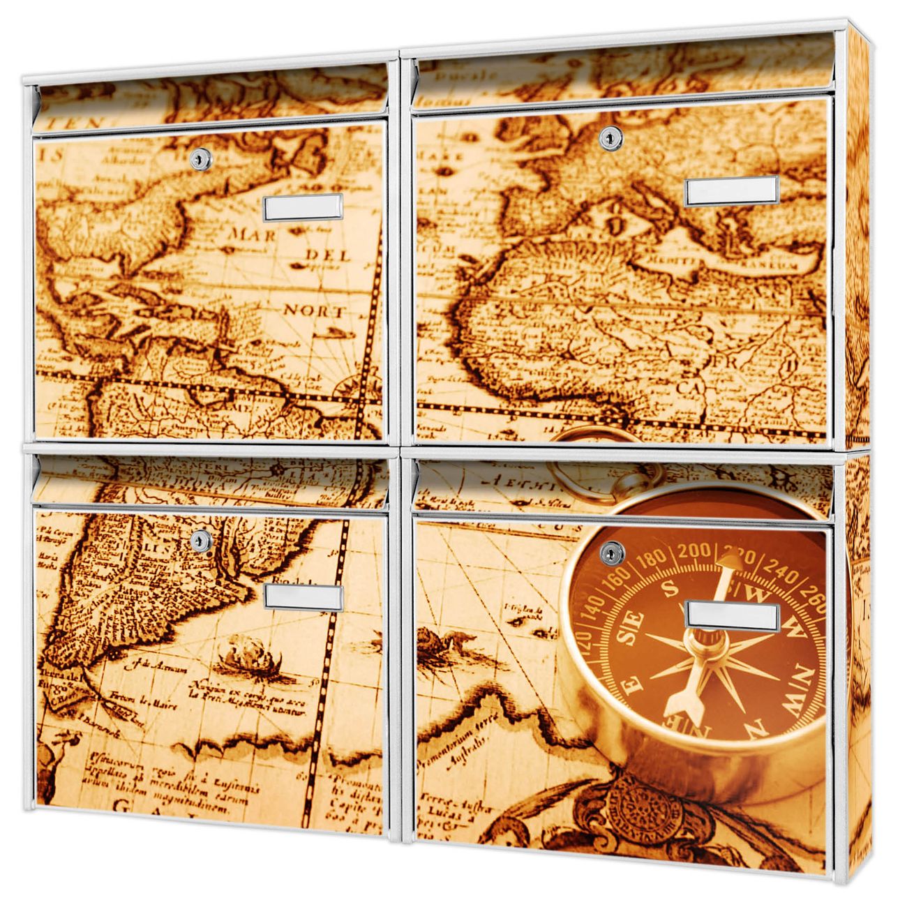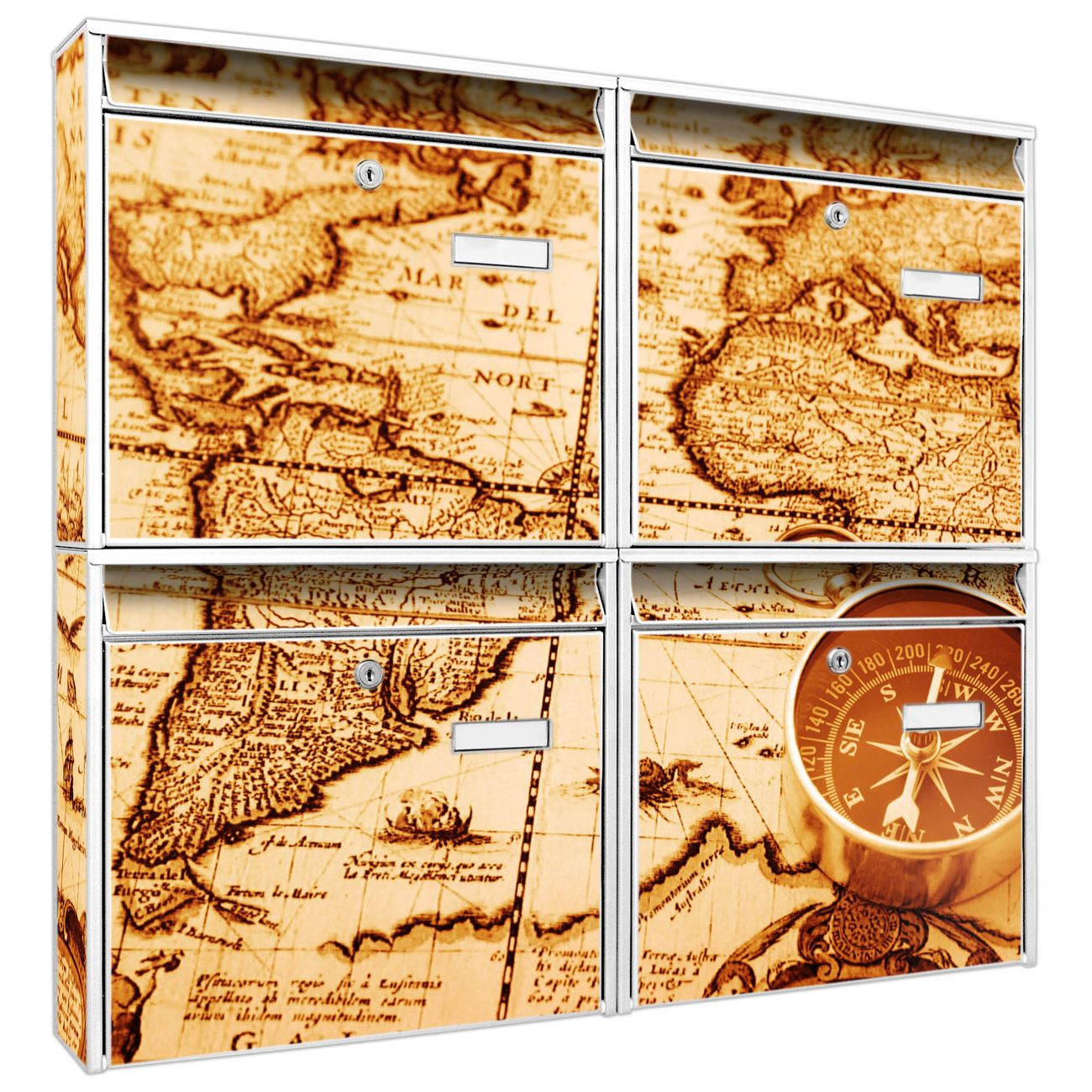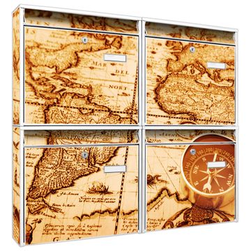 FUNKTION: Die Burg-Wächter Briefkastenanlage mit Motiv World Map bietet Ihnen ausreichend Fassungsvermögen um auch A4 und C4 Sendungen zu empfangen. Das integrierte Namensschild lässt sich individuell beschriften. Wählen Sie aus den Grundfarben weiß, silber und schwarz. DESIGN: Die 4 Briefkästen haben ein ansprechendes und zeitloses Design, ohne dabei auf Funktionalität zu verzichten. Das Material ist sehr stabil, wetterfest und rostfrei. Durch das Motiv World Map werden die Postkästen zu einem Blickfang. DETAILS: Die Postkästen bestehen aus verzinktem Stahl der zusätzlich mit Klarlack versiegelt wurde. Die Kästen sind gesamt 64,5cm hoch, 72,5cm breit und 10cm tief. Das Motiv besteht aus einer wetter- und UV-festen Folie, die Ihren Briefkasten zusätzlich vor Kratzern schützt. Die Postkästen werden mit Montagematerial, je einem Namensschild und je zwei Schlüsseln geliefert. NUTZEN: Das Briefkastenset eignet sich für die Wandmontage, die Größe bietet genügend Platz für Sendungen aller Art. Das zeitlose Design sowie die stabile Bauart bieten Ihnen einen treuen Begleiter für Ihre Post. BANJADO: