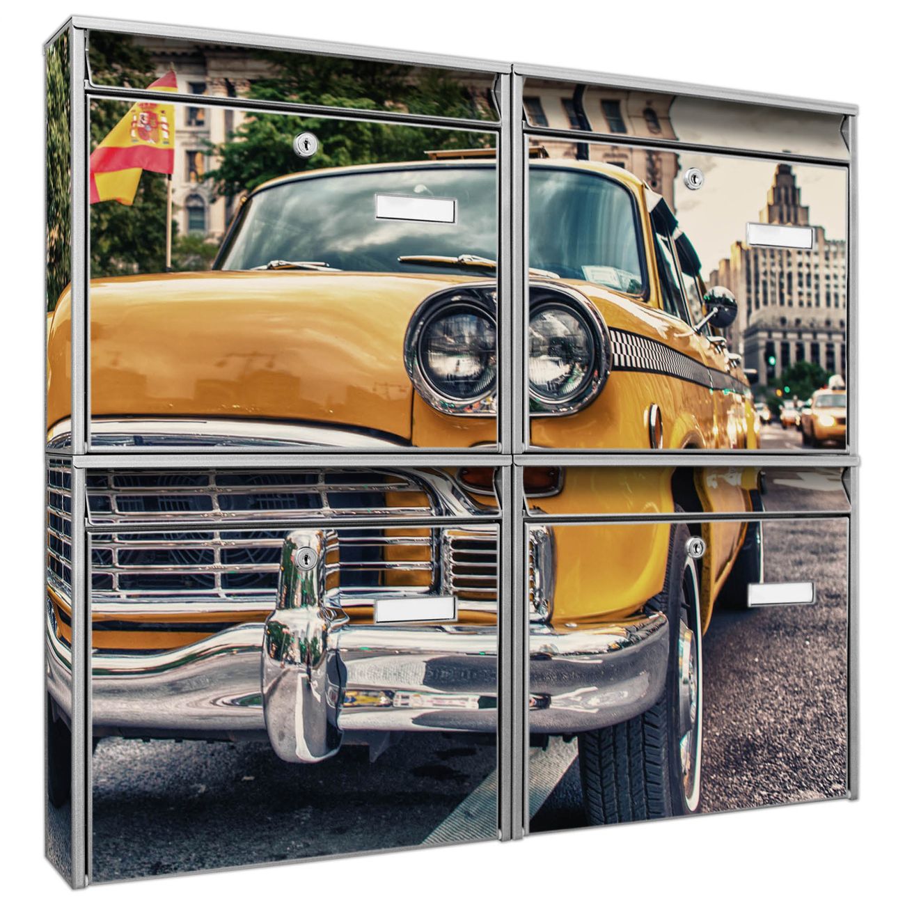 FUNKTION: Die Burg-Wächter Briefkastenanlage mit Motiv Yellow Cab bietet Ihnen ausreichend Fassungsvermögen um auch A4 und C4 Sendungen zu empfangen. Das integrierte Namensschild lässt sich individuell beschriften. Wählen Sie aus den Grundfarben weiß, silber und schwarz. DESIGN: Die 4 Briefkästen haben ein ansprechendes und zeitloses Design, ohne dabei auf Funktionalität zu verzichten. Das Material ist sehr stabil, wetterfest und rostfrei. Durch das Motiv Yellow Cab werden die Postkästen zu einem Blickfang. DETAILS: Die Postkästen bestehen aus verzinktem Stahl der zusätzlich mit Klarlack versiegelt wurde. Die Kästen sind gesamt 64,5cm hoch, 72,5cm breit und 10cm tief. Das Motiv besteht aus einer wetter- und UV-festen Folie, die Ihren Briefkasten zusätzlich vor Kratzern schützt. Die Postkästen werden mit Montagematerial, je einem Namensschild und je zwei Schlüsseln geliefert. NUTZEN: Das Briefkastenset eignet sich für die Wandmontage, die Größe bietet genügend Platz für Sendungen aller Art. Das zeitlose Design sowie die stabile Bauart bieten Ihnen einen treuen Begleiter für Ihre Post. BANJADO: