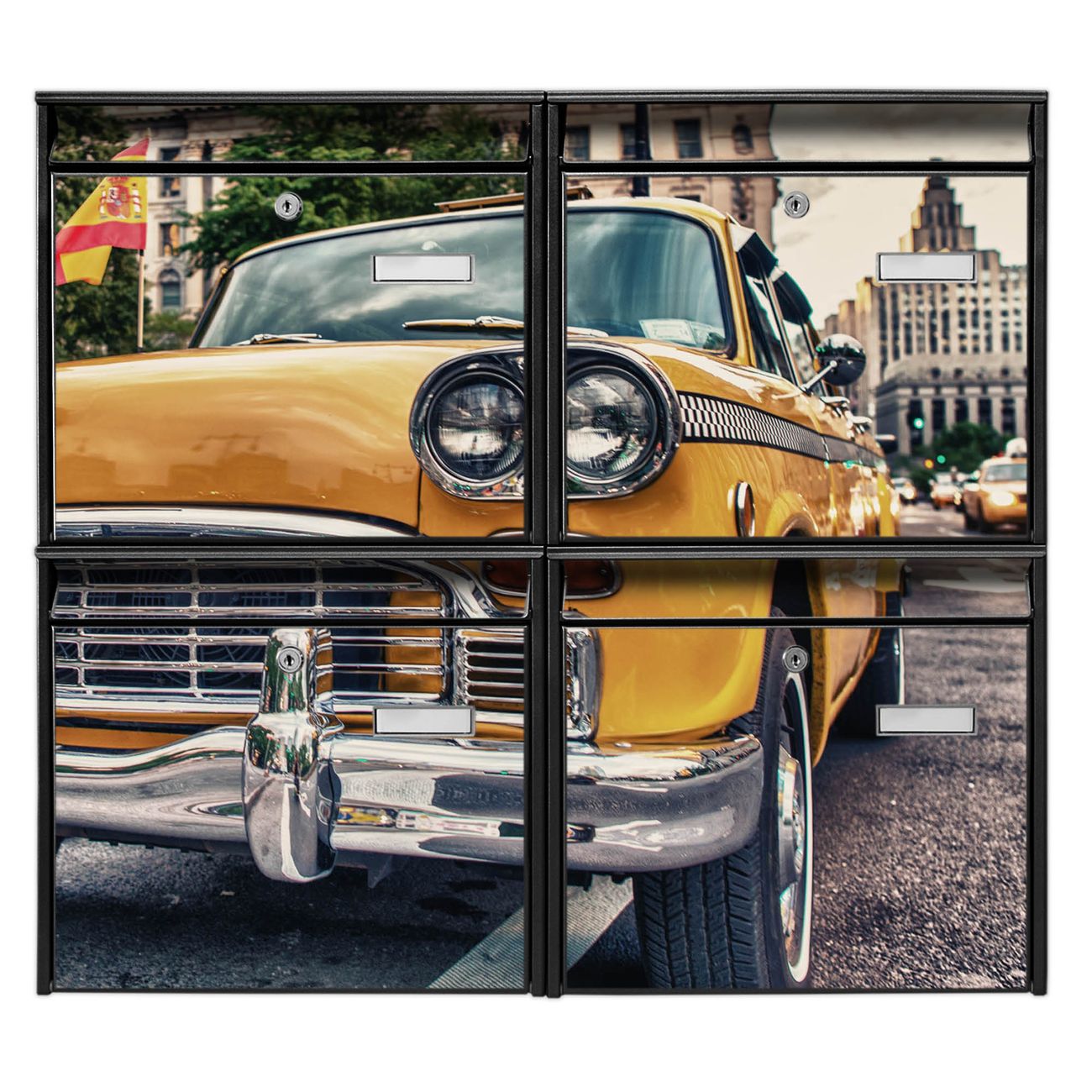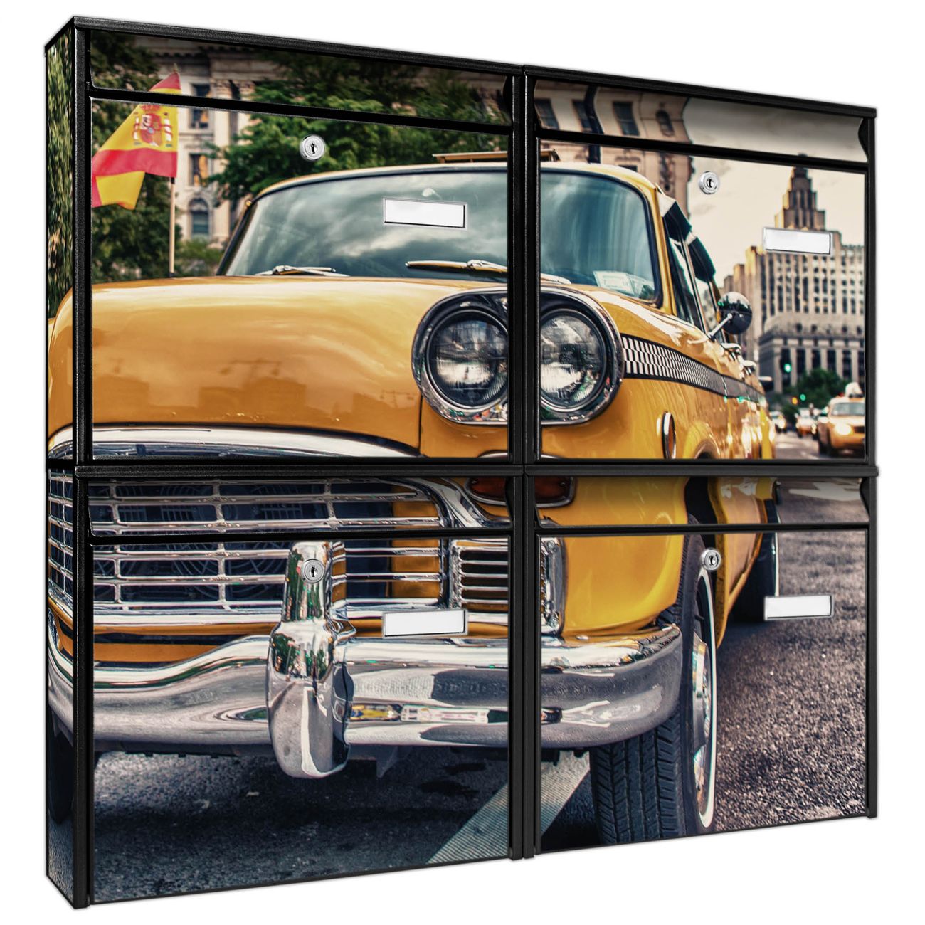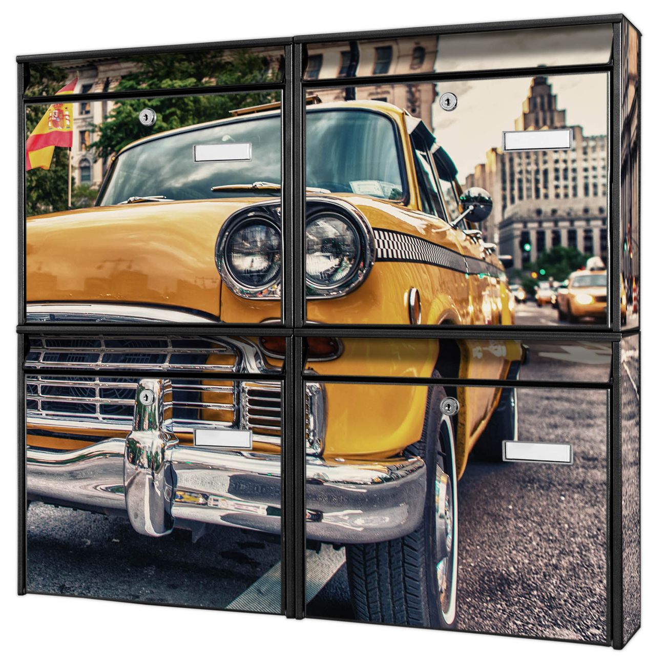 FUNKTION: Die Burg-Wächter Briefkastenanlage mit Motiv Yellow Cab bietet Ihnen ausreichend Fassungsvermögen um auch A4 und C4 Sendungen zu empfangen. Das integrierte Namensschild lässt sich individuell beschriften. Wählen Sie aus den Grundfarben weiß, silber und schwarz. DESIGN: Die 4 Briefkästen haben ein ansprechendes und zeitloses Design, ohne dabei auf Funktionalität zu verzichten. Das Material ist sehr stabil, wetterfest und rostfrei. Durch das Motiv Yellow Cab werden die Postkästen zu einem Blickfang. DETAILS: Die Postkästen bestehen aus verzinktem Stahl der zusätzlich mit Klarlack versiegelt wurde. Die Kästen sind gesamt 64,5cm hoch, 72,5cm breit und 10cm tief. Das Motiv besteht aus einer wetter- und UV-festen Folie, die Ihren Briefkasten zusätzlich vor Kratzern schützt. Die Postkästen werden mit Montagematerial, je einem Namensschild und je zwei Schlüsseln geliefert. NUTZEN: Das Briefkastenset eignet sich für die Wandmontage, die Größe bietet genügend Platz für Sendungen aller Art. Das zeitlose Design sowie die stabile Bauart bieten Ihnen einen treuen Begleiter für Ihre Post. BANJADO: