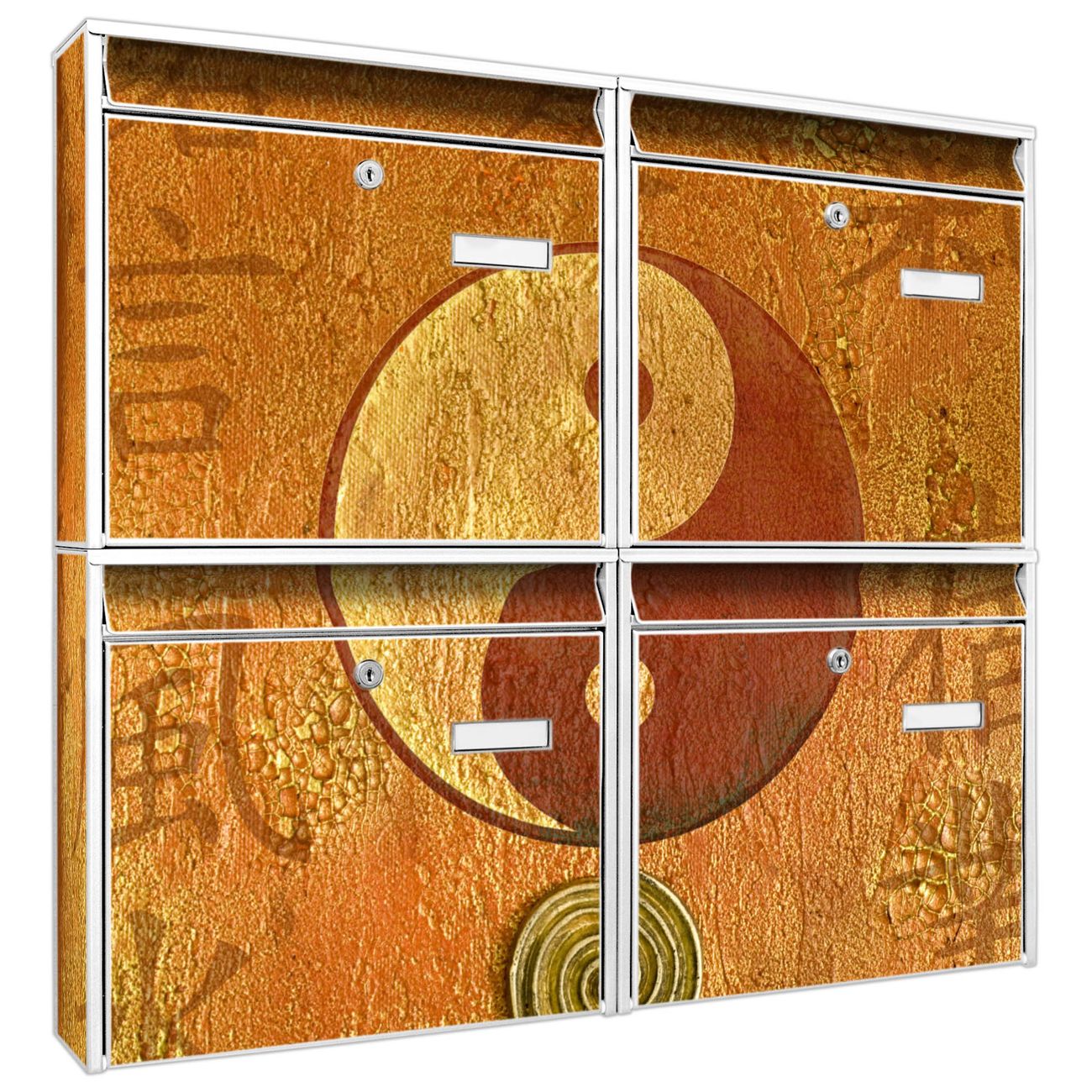 FUNKTION: Die Burg-Wächter Briefkastenanlage mit Motiv Yin Yang bietet Ihnen ausreichend Fassungsvermögen um auch A4 und C4 Sendungen zu empfangen. Das integrierte Namensschild lässt sich individuell beschriften. Wählen Sie aus den Grundfarben weiß, silber und schwarz. DESIGN: Die 4 Briefkästen haben ein ansprechendes und zeitloses Design, ohne dabei auf Funktionalität zu verzichten. Das Material ist sehr stabil, wetterfest und rostfrei. Durch das Motiv Yin Yang werden die Postkästen zu einem Blickfang. DETAILS: Die Postkästen bestehen aus verzinktem Stahl der zusätzlich mit Klarlack versiegelt wurde. Die Kästen sind gesamt 64,5cm hoch, 72,5cm breit und 10cm tief. Das Motiv besteht aus einer wetter- und UV-festen Folie, die Ihren Briefkasten zusätzlich vor Kratzern schützt. Die Postkästen werden mit Montagematerial, je einem Namensschild und je zwei Schlüsseln geliefert. NUTZEN: Das Briefkastenset eignet sich für die Wandmontage, die Größe bietet genügend Platz für Sendungen aller Art. Das zeitlose Design sowie die stabile Bauart bieten Ihnen einen treuen Begleiter für Ihre Post. BANJADO: