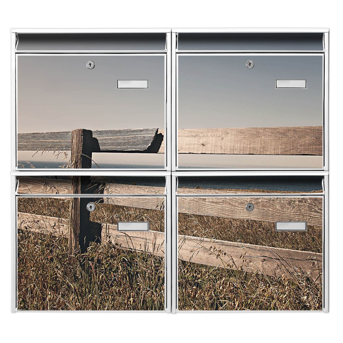 FUNKTION: Die Burg-Wächter Briefkastenanlage mit Motiv Zaun am Meer bietet Ihnen ausreichend Fassungsvermögen um auch A4 und C4 Sendungen zu empfangen. Das integrierte Namensschild lässt sich individuell beschriften. Wählen Sie aus den Grundfarben weiß, silber und schwarz. DESIGN: Die 4 Briefkästen haben ein ansprechendes und zeitloses Design, ohne dabei auf Funktionalität zu verzichten. Das Material ist sehr stabil, wetterfest und rostfrei. Durch das Motiv Zaun am Meer werden die Postkästen zu einem Blickfang. DETAILS: Die Postkästen bestehen aus verzinktem Stahl der zusätzlich mit Klarlack versiegelt wurde. Die Kästen sind gesamt 64,5cm hoch, 72,5cm breit und 10cm tief. Das Motiv besteht aus einer wetter- und UV-festen Folie, die Ihren Briefkasten zusätzlich vor Kratzern schützt. Die Postkästen werden mit Montagematerial, je einem Namensschild und je zwei Schlüsseln geliefert. NUTZEN: Das Briefkastenset eignet sich für die Wandmontage, die Größe bietet genügend Platz für Sendungen aller Art. Das zeitlose Design sowie die stabile Bauart bieten Ihnen einen treuen Begleiter für Ihre Post. BANJADO: