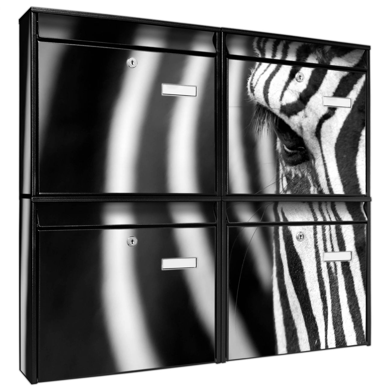 FUNKTION: Die Burg-Wächter Briefkastenanlage mit Motiv Zebra En Face bietet Ihnen ausreichend Fassungsvermögen um auch A4 und C4 Sendungen zu empfangen. Das integrierte Namensschild lässt sich individuell beschriften. Wählen Sie aus den Grundfarben weiß, silber und schwarz. DESIGN: Die 4 Briefkästen haben ein ansprechendes und zeitloses Design, ohne dabei auf Funktionalität zu verzichten. Das Material ist sehr stabil, wetterfest und rostfrei. Durch das Motiv Zebra En Face werden die Postkästen zu einem Blickfang. DETAILS: Die Postkästen bestehen aus verzinktem Stahl der zusätzlich mit Klarlack versiegelt wurde. Die Kästen sind gesamt 64,5cm hoch, 72,5cm breit und 10cm tief. Das Motiv besteht aus einer wetter- und UV-festen Folie, die Ihren Briefkasten zusätzlich vor Kratzern schützt. Die Postkästen werden mit Montagematerial, je einem Namensschild und je zwei Schlüsseln geliefert. NUTZEN: Das Briefkastenset eignet sich für die Wandmontage, die Größe bietet genügend Platz für Sendungen aller Art. Das zeitlose Design sowie die stabile Bauart bieten Ihnen einen treuen Begleiter für Ihre Post. BANJADO: