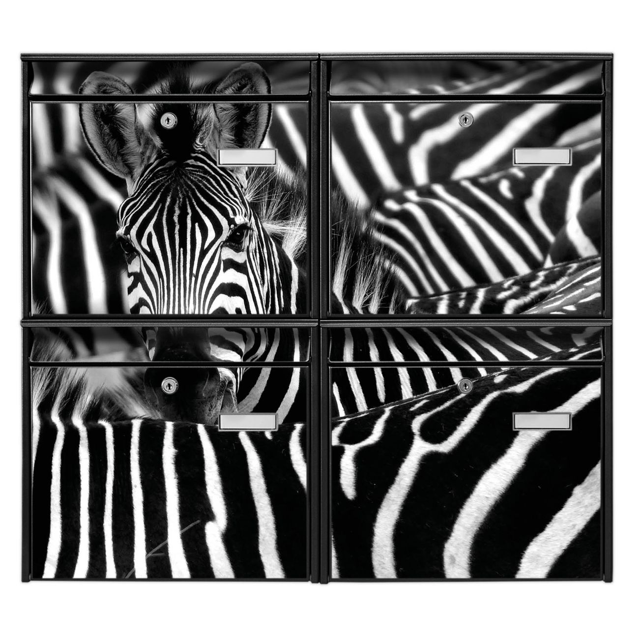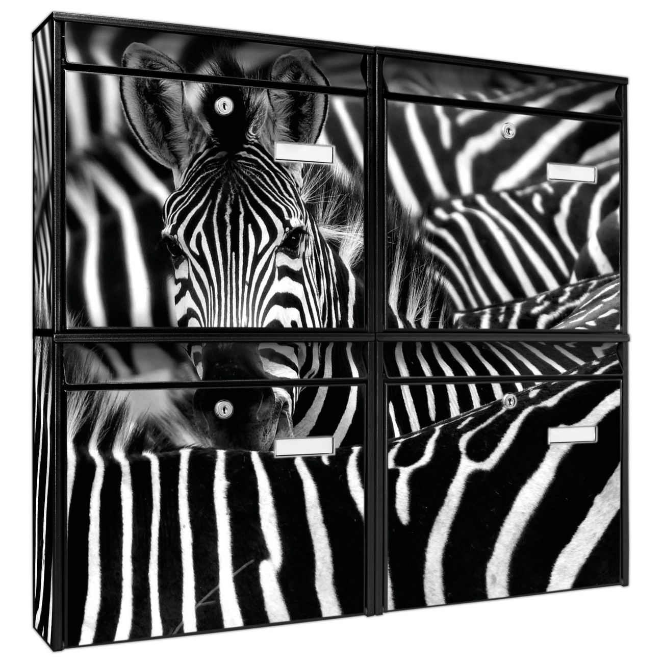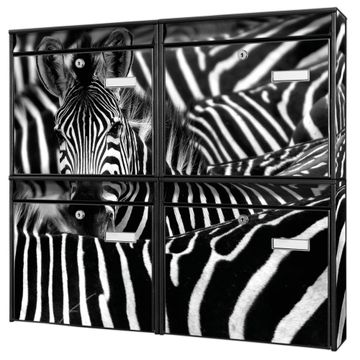 FUNKTION: Die Burg-Wächter Briefkastenanlage mit Motiv Zebras bietet Ihnen ausreichend Fassungsvermögen um auch A4 und C4 Sendungen zu empfangen. Das integrierte Namensschild lässt sich individuell beschriften. Wählen Sie aus den Grundfarben weiß, silber und schwarz. DESIGN: Die 4 Briefkästen haben ein ansprechendes und zeitloses Design, ohne dabei auf Funktionalität zu verzichten. Das Material ist sehr stabil, wetterfest und rostfrei. Durch das Motiv Zebras werden die Postkästen zu einem Blickfang. DETAILS: Die Postkästen bestehen aus verzinktem Stahl der zusätzlich mit Klarlack versiegelt wurde. Die Kästen sind gesamt 64,5cm hoch, 72,5cm breit und 10cm tief. Das Motiv besteht aus einer wetter- und UV-festen Folie, die Ihren Briefkasten zusätzlich vor Kratzern schützt. Die Postkästen werden mit Montagematerial, je einem Namensschild und je zwei Schlüsseln geliefert. NUTZEN: Das Briefkastenset eignet sich für die Wandmontage, die Größe bietet genügend Platz für Sendungen aller Art. Das zeitlose Design sowie die stabile Bauart bieten Ihnen einen treuen Begleiter für Ihre Post. BANJADO: