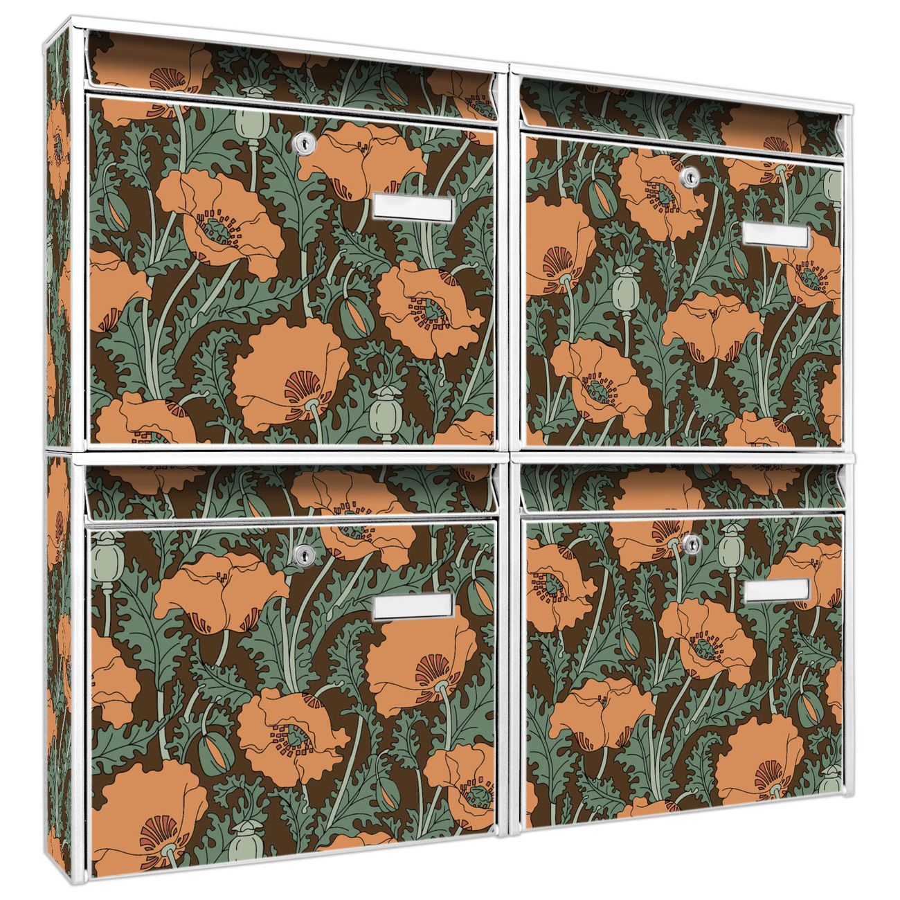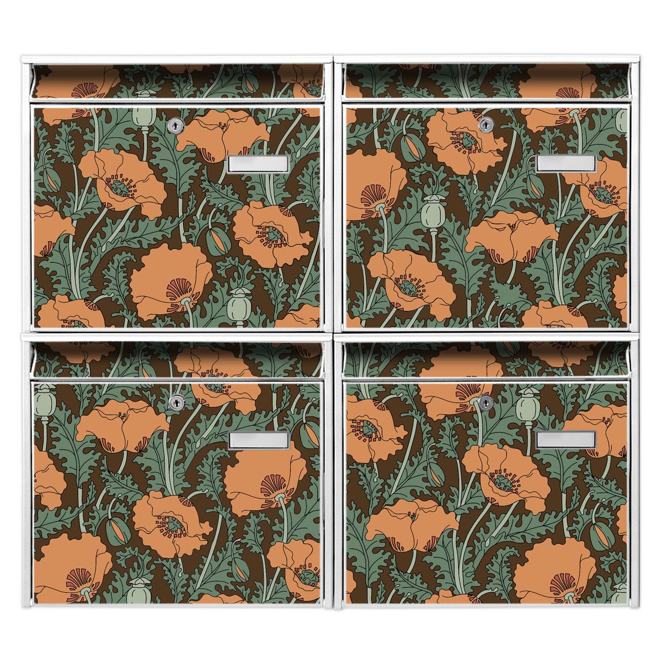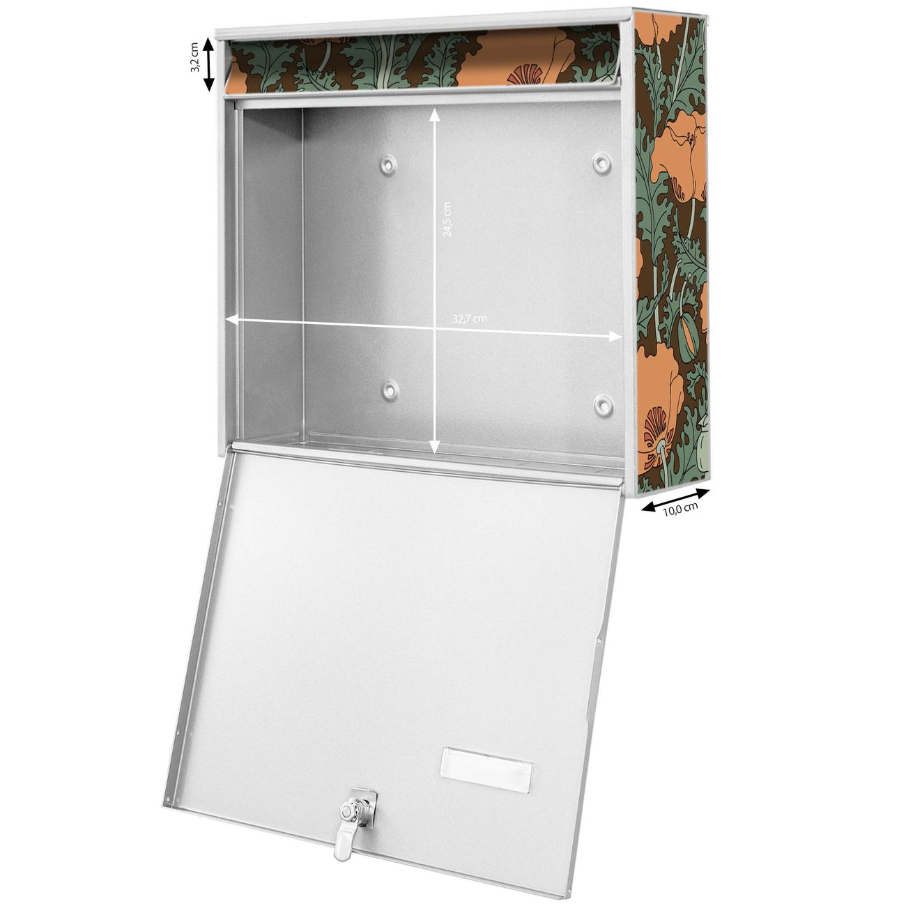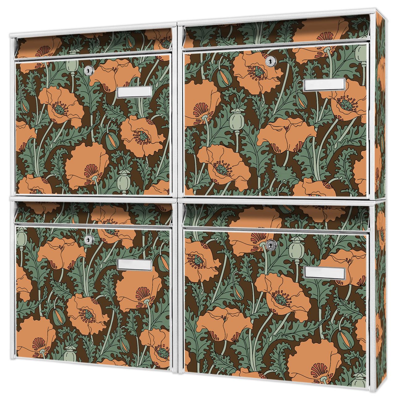 FUNKTION: Die Burg-Wächter Briefkastenanlage mit Motiv Zeichnung Mohn bietet Ihnen ausreichend Fassungsvermögen um auch A4 und C4 Sendungen zu empfangen. Das integrierte Namensschild lässt sich individuell beschriften. Wählen Sie aus den Grundfarben weiß, silber und schwarz. DESIGN: Die 4 Briefkästen haben ein ansprechendes und zeitloses Design, ohne dabei auf Funktionalität zu verzichten. Das Material ist sehr stabil, wetterfest und rostfrei. Durch das Motiv Zeichnung Mohn werden die Postkästen zu einem Blickfang. DETAILS: Die Postkästen bestehen aus verzinktem Stahl der zusätzlich mit Klarlack versiegelt wurde. Die Kästen sind gesamt 64,5cm hoch, 72,5cm breit und 10cm tief. Das Motiv besteht aus einer wetter- und UV-festen Folie, die Ihren Briefkasten zusätzlich vor Kratzern schützt. Die Postkästen werden mit Montagematerial, je einem Namensschild und je zwei Schlüsseln geliefert. NUTZEN: Das Briefkastenset eignet sich für die Wandmontage, die Größe bietet genügend Platz für Sendungen aller Art. Das zeitlose Design sowie die stabile Bauart bieten Ihnen einen treuen Begleiter für Ihre Post. BANJADO: