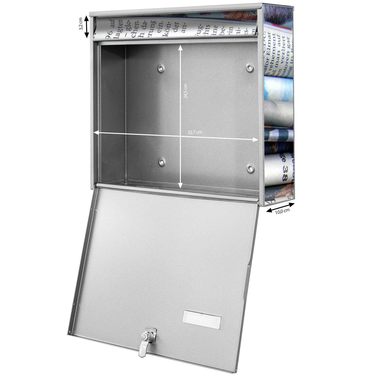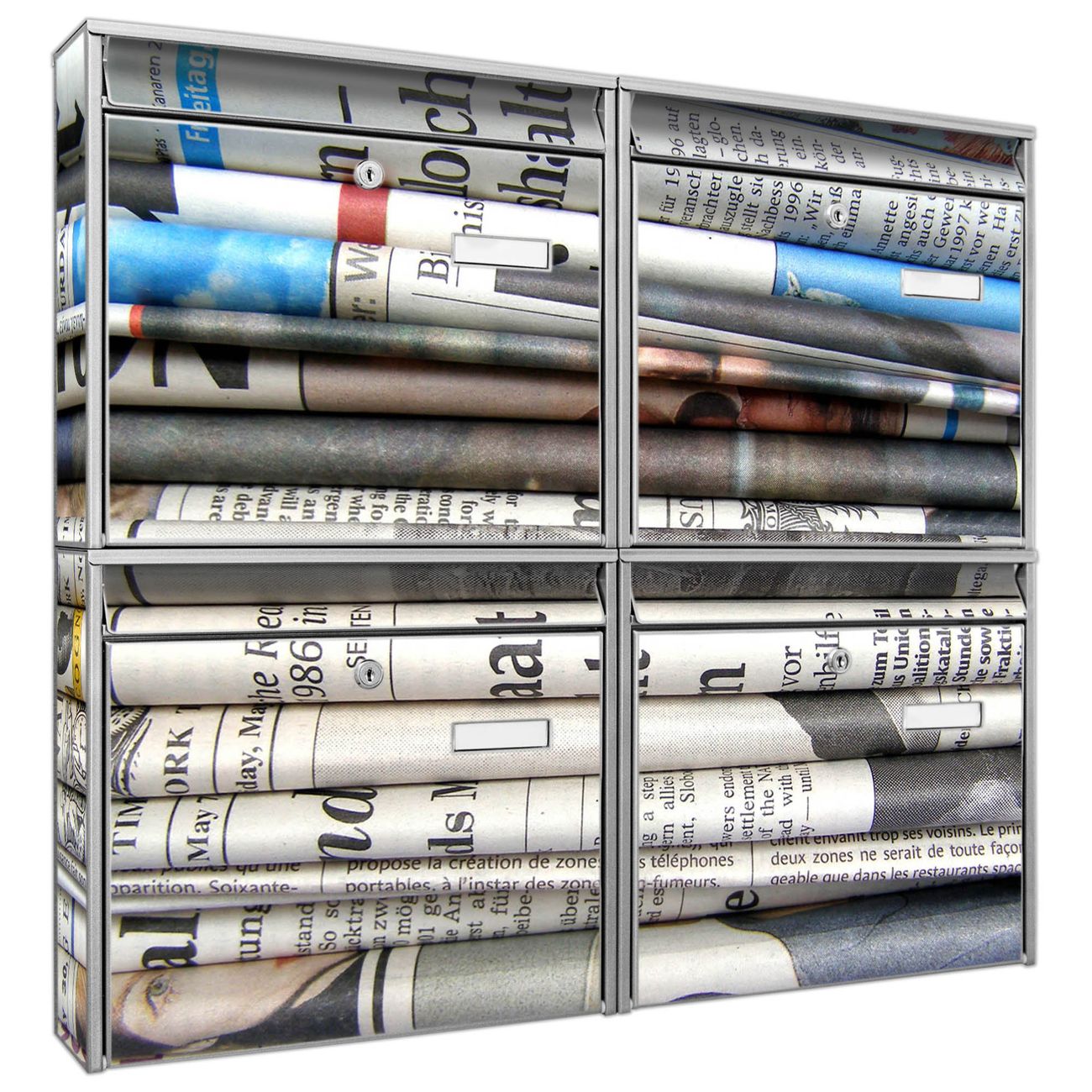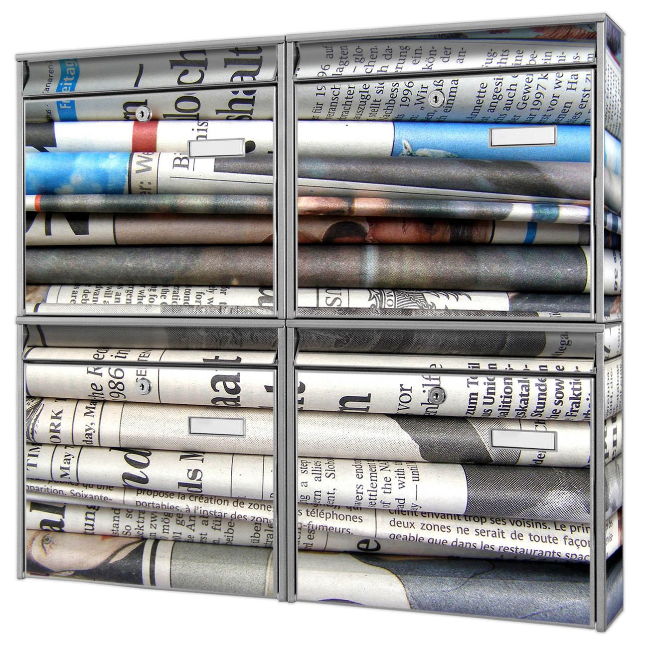 FUNKTION: Die Burg-Wächter Briefkastenanlage mit Motiv Zeitungen bietet Ihnen ausreichend Fassungsvermögen um auch A4 und C4 Sendungen zu empfangen. Das integrierte Namensschild lässt sich individuell beschriften. Wählen Sie aus den Grundfarben weiß, silber und schwarz. DESIGN: Die 4 Briefkästen haben ein ansprechendes und zeitloses Design, ohne dabei auf Funktionalität zu verzichten. Das Material ist sehr stabil, wetterfest und rostfrei. Durch das Motiv Zeitungen werden die Postkästen zu einem Blickfang. DETAILS: Die Postkästen bestehen aus verzinktem Stahl der zusätzlich mit Klarlack versiegelt wurde. Die Kästen sind gesamt 64,5cm hoch, 72,5cm breit und 10cm tief. Das Motiv besteht aus einer wetter- und UV-festen Folie, die Ihren Briefkasten zusätzlich vor Kratzern schützt. Die Postkästen werden mit Montagematerial, je einem Namensschild und je zwei Schlüsseln geliefert. NUTZEN: Das Briefkastenset eignet sich für die Wandmontage, die Größe bietet genügend Platz für Sendungen aller Art. Das zeitlose Design sowie die stabile Bauart bieten Ihnen einen treuen Begleiter für Ihre Post. BANJADO: