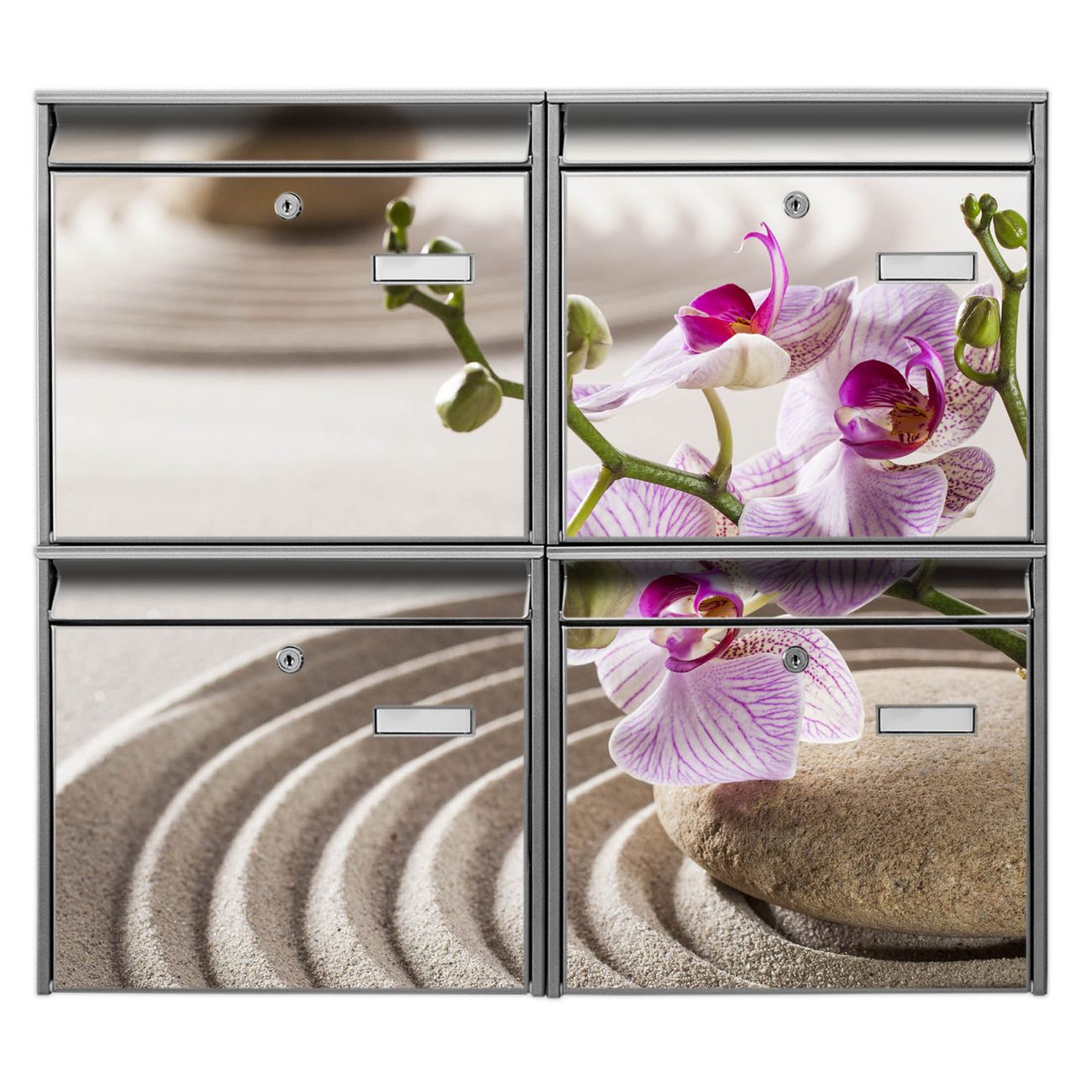 FUNKTION: Die Burg-Wächter Briefkastenanlage mit Motiv Zen Relax bietet Ihnen ausreichend Fassungsvermögen um auch A4 und C4 Sendungen zu empfangen. Das integrierte Namensschild lässt sich individuell beschriften. Wählen Sie aus den Grundfarben weiß, silber und schwarz. DESIGN: Die 4 Briefkästen haben ein ansprechendes und zeitloses Design, ohne dabei auf Funktionalität zu verzichten. Das Material ist sehr stabil, wetterfest und rostfrei. Durch das Motiv Zen Relax werden die Postkästen zu einem Blickfang. DETAILS: Die Postkästen bestehen aus verzinktem Stahl der zusätzlich mit Klarlack versiegelt wurde. Die Kästen sind gesamt 64,5cm hoch, 72,5cm breit und 10cm tief. Das Motiv besteht aus einer wetter- und UV-festen Folie, die Ihren Briefkasten zusätzlich vor Kratzern schützt. Die Postkästen werden mit Montagematerial, je einem Namensschild und je zwei Schlüsseln geliefert. NUTZEN: Das Briefkastenset eignet sich für die Wandmontage, die Größe bietet genügend Platz für Sendungen aller Art. Das zeitlose Design sowie die stabile Bauart bieten Ihnen einen treuen Begleiter für Ihre Post. BANJADO:
