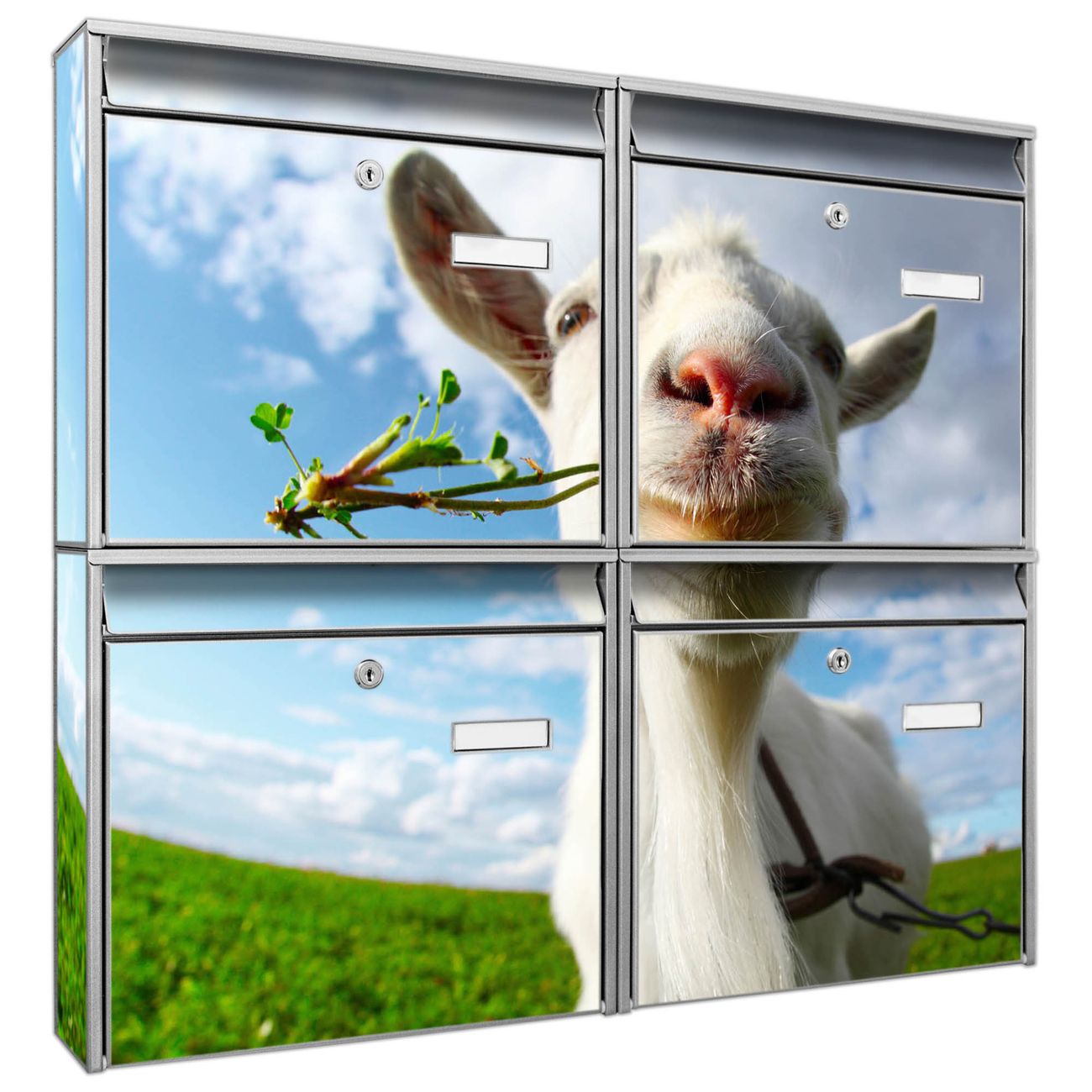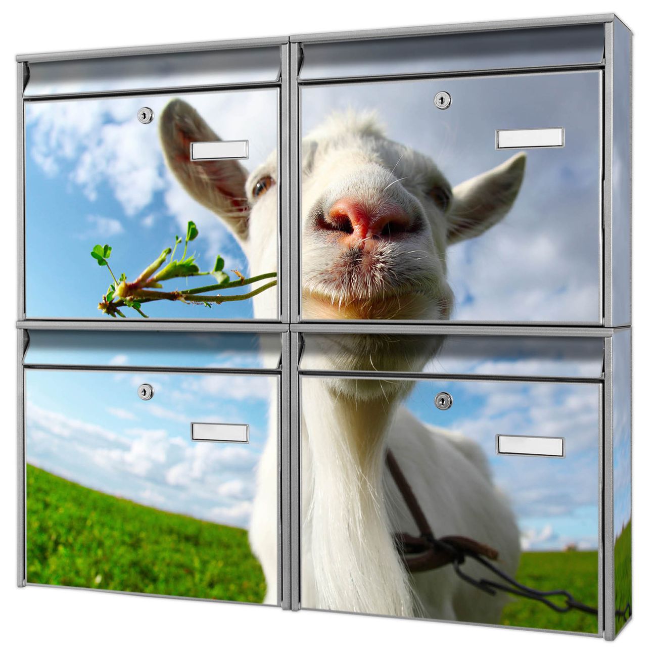 FUNKTION: Die Burg-Wächter Briefkastenanlage mit Motiv Ziege 2 bietet Ihnen ausreichend Fassungsvermögen um auch A4 und C4 Sendungen zu empfangen. Das integrierte Namensschild lässt sich individuell beschriften. Wählen Sie aus den Grundfarben weiß, silber und schwarz. DESIGN: Die 4 Briefkästen haben ein ansprechendes und zeitloses Design, ohne dabei auf Funktionalität zu verzichten. Das Material ist sehr stabil, wetterfest und rostfrei. Durch das Motiv Ziege 2 werden die Postkästen zu einem Blickfang. DETAILS: Die Postkästen bestehen aus verzinktem Stahl der zusätzlich mit Klarlack versiegelt wurde. Die Kästen sind gesamt 64,5cm hoch, 72,5cm breit und 10cm tief. Das Motiv besteht aus einer wetter- und UV-festen Folie, die Ihren Briefkasten zusätzlich vor Kratzern schützt. Die Postkästen werden mit Montagematerial, je einem Namensschild und je zwei Schlüsseln geliefert. NUTZEN: Das Briefkastenset eignet sich für die Wandmontage, die Größe bietet genügend Platz für Sendungen aller Art. Das zeitlose Design sowie die stabile Bauart bieten Ihnen einen treuen Begleiter für Ihre Post. BANJADO: