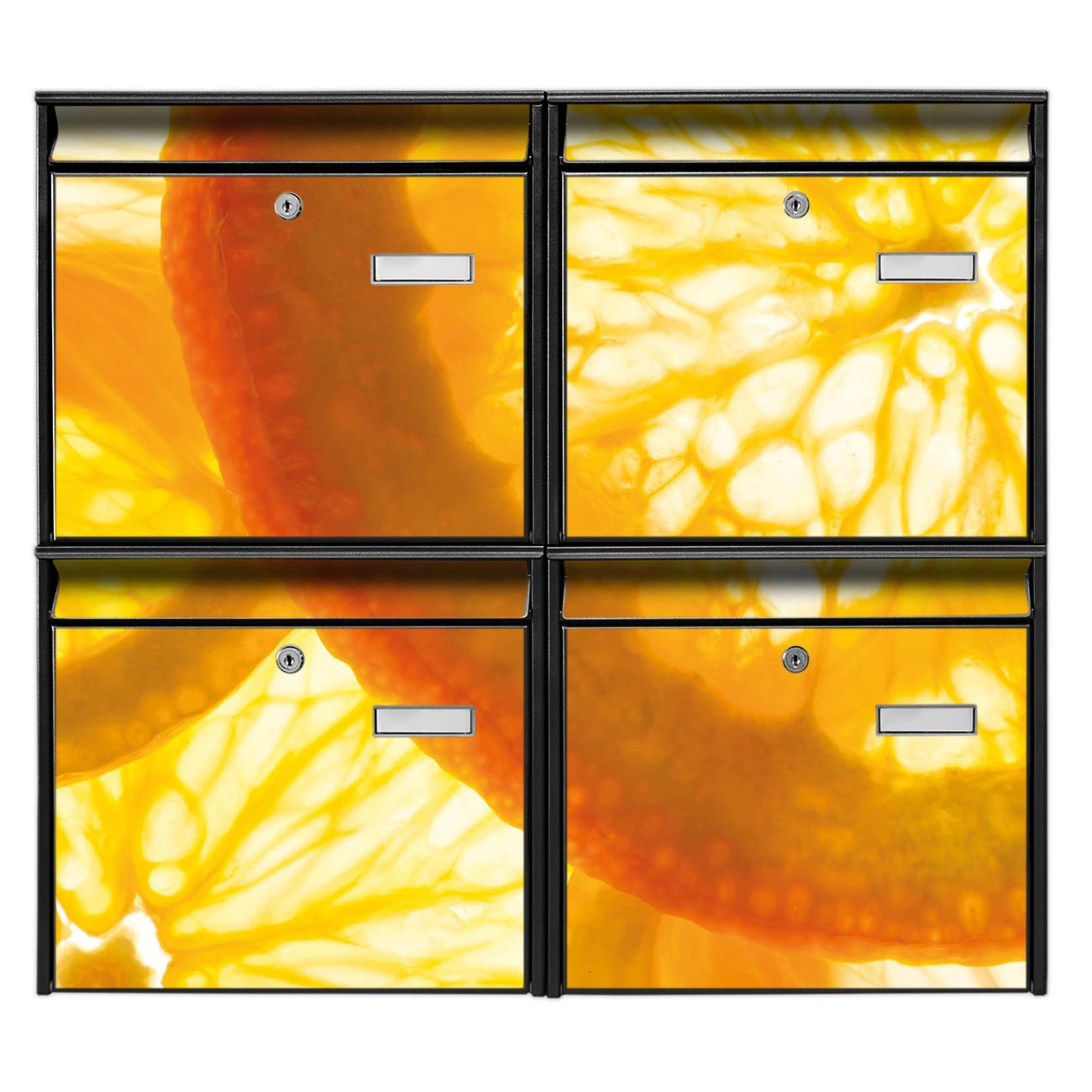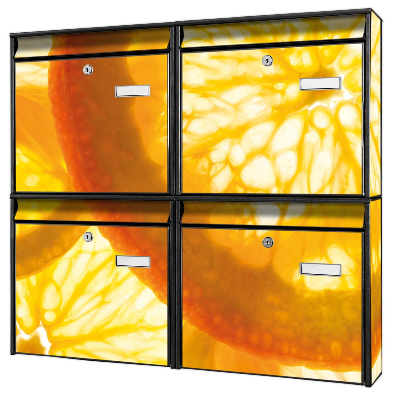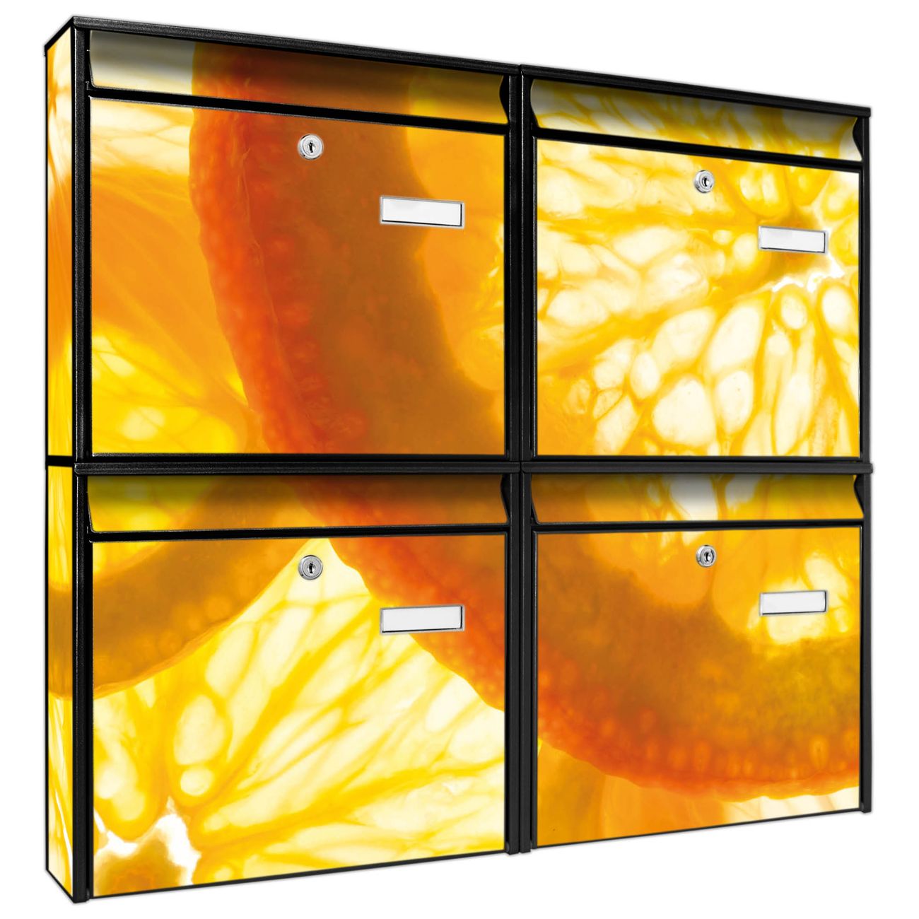 FUNKTION: Die Burg-Wächter Briefkastenanlage mit Motiv Zitrusfrüchte bietet Ihnen ausreichend Fassungsvermögen um auch A4 und C4 Sendungen zu empfangen. Das integrierte Namensschild lässt sich individuell beschriften. Wählen Sie aus den Grundfarben weiß, silber und schwarz. DESIGN: Die 4 Briefkästen haben ein ansprechendes und zeitloses Design, ohne dabei auf Funktionalität zu verzichten. Das Material ist sehr stabil, wetterfest und rostfrei. Durch das Motiv Zitrusfrüchte werden die Postkästen zu einem Blickfang. DETAILS: Die Postkästen bestehen aus verzinktem Stahl der zusätzlich mit Klarlack versiegelt wurde. Die Kästen sind gesamt 64,5cm hoch, 72,5cm breit und 10cm tief. Das Motiv besteht aus einer wetter- und UV-festen Folie, die Ihren Briefkasten zusätzlich vor Kratzern schützt. Die Postkästen werden mit Montagematerial, je einem Namensschild und je zwei Schlüsseln geliefert. NUTZEN: Das Briefkastenset eignet sich für die Wandmontage, die Größe bietet genügend Platz für Sendungen aller Art. Das zeitlose Design sowie die stabile Bauart bieten Ihnen einen treuen Begleiter für Ihre Post. BANJADO: