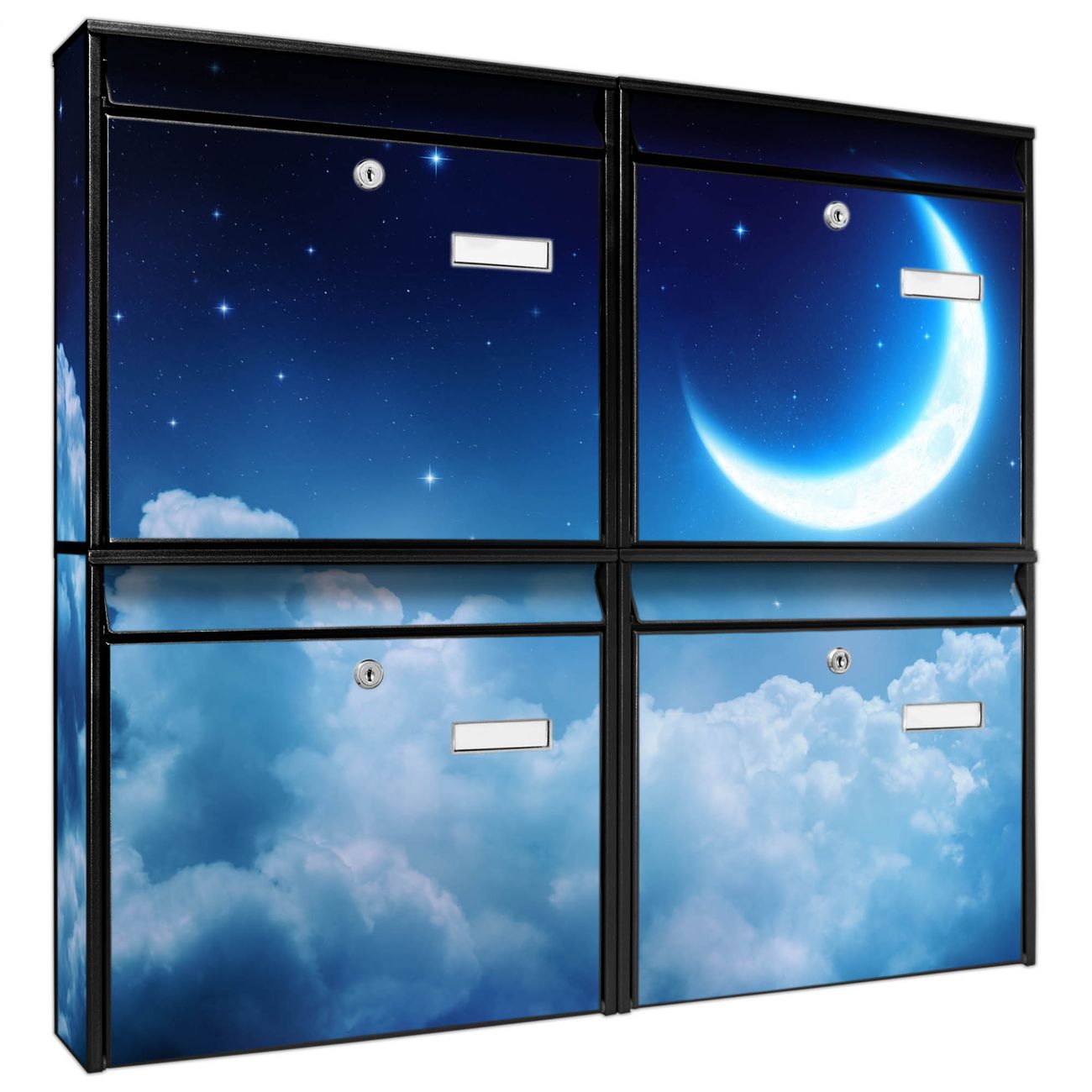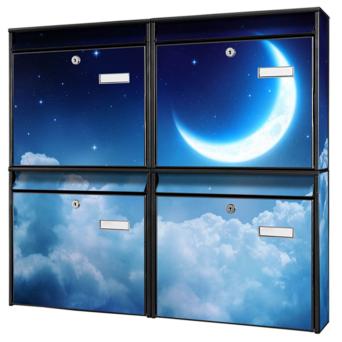 FUNKTION: Die Burg-Wächter Briefkastenanlage mit Motiv zunehmender Mond bietet Ihnen ausreichend Fassungsvermögen um auch A4 und C4 Sendungen zu empfangen. Das integrierte Namensschild lässt sich individuell beschriften. Wählen Sie aus den Grundfarben weiß, silber und schwarz. DESIGN: Die 4 Briefkästen haben ein ansprechendes und zeitloses Design, ohne dabei auf Funktionalität zu verzichten. Das Material ist sehr stabil, wetterfest und rostfrei. Durch das Motiv zunehmender Mond werden die Postkästen zu einem Blickfang. DETAILS: Die Postkästen bestehen aus verzinktem Stahl der zusätzlich mit Klarlack versiegelt wurde. Die Kästen sind gesamt 64,5cm hoch, 72,5cm breit und 10cm tief. Das Motiv besteht aus einer wetter- und UV-festen Folie, die Ihren Briefkasten zusätzlich vor Kratzern schützt. Die Postkästen werden mit Montagematerial, je einem Namensschild und je zwei Schlüsseln geliefert. NUTZEN: Das Briefkastenset eignet sich für die Wandmontage, die Größe bietet genügend Platz für Sendungen aller Art. Das zeitlose Design sowie die stabile Bauart bieten Ihnen einen treuen Begleiter für Ihre Post. BANJADO: