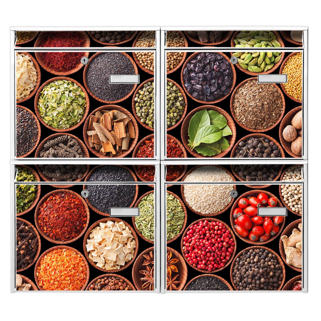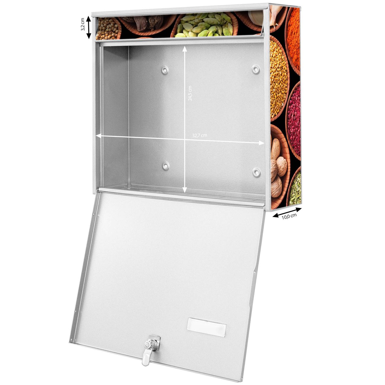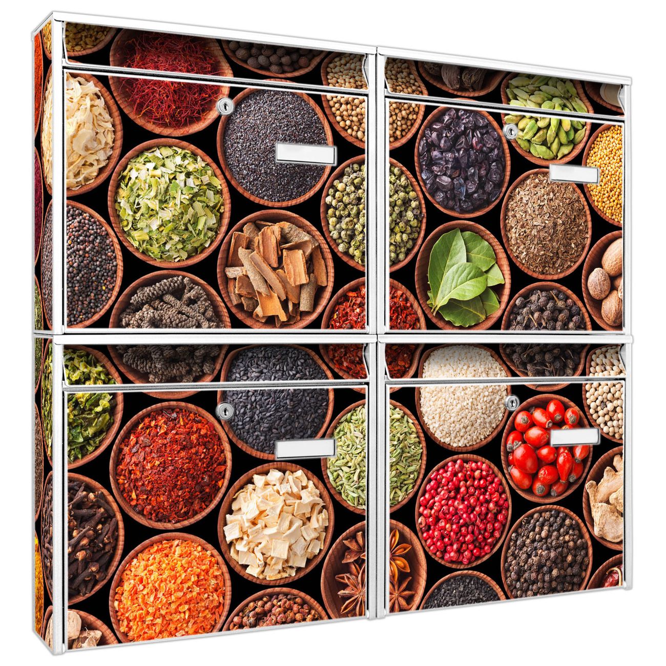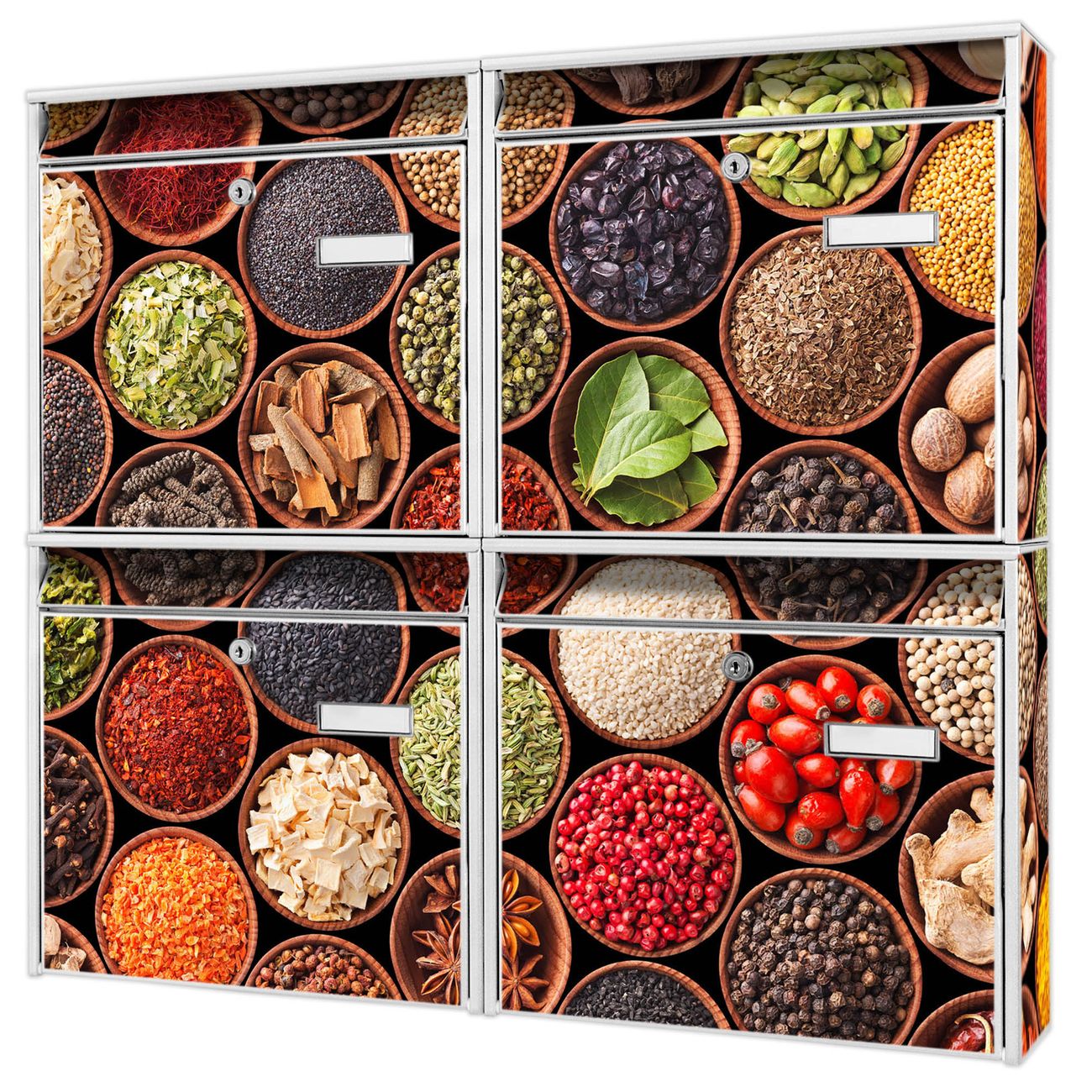 FUNKTION: Die Burg-Wächter Briefkastenanlage mit Motiv Zutaten bietet Ihnen ausreichend Fassungsvermögen um auch A4 und C4 Sendungen zu empfangen. Das integrierte Namensschild lässt sich individuell beschriften. Wählen Sie aus den Grundfarben weiß, silber und schwarz. DESIGN: Die 4 Briefkästen haben ein ansprechendes und zeitloses Design, ohne dabei auf Funktionalität zu verzichten. Das Material ist sehr stabil, wetterfest und rostfrei. Durch das Motiv Zutaten werden die Postkästen zu einem Blickfang. DETAILS: Die Postkästen bestehen aus verzinktem Stahl der zusätzlich mit Klarlack versiegelt wurde. Die Kästen sind gesamt 64,5cm hoch, 72,5cm breit und 10cm tief. Das Motiv besteht aus einer wetter- und UV-festen Folie, die Ihren Briefkasten zusätzlich vor Kratzern schützt. Die Postkästen werden mit Montagematerial, je einem Namensschild und je zwei Schlüsseln geliefert. NUTZEN: Das Briefkastenset eignet sich für die Wandmontage, die Größe bietet genügend Platz für Sendungen aller Art. Das zeitlose Design sowie die stabile Bauart bieten Ihnen einen treuen Begleiter für Ihre Post. BANJADO: