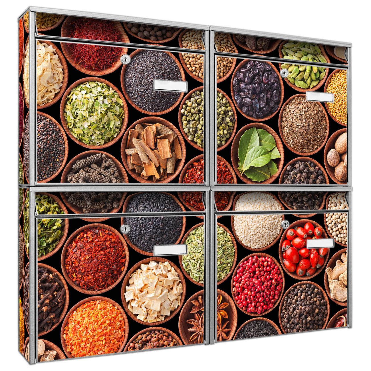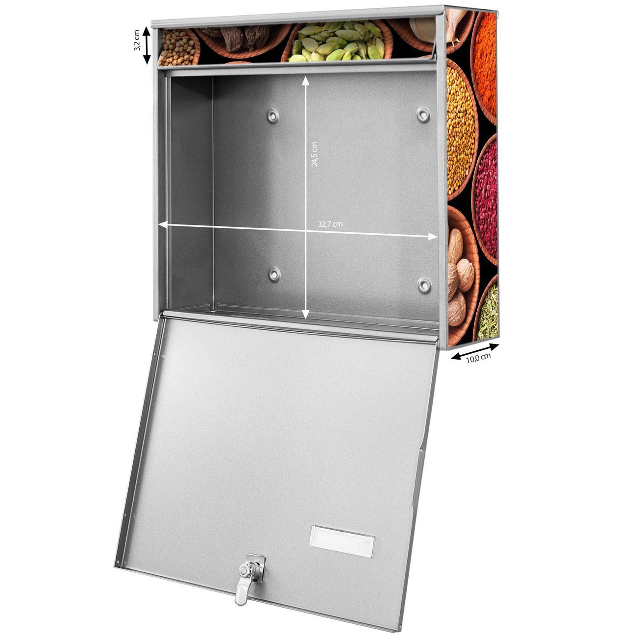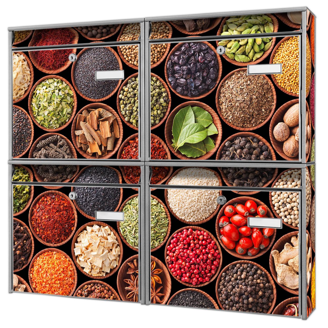 FUNKTION: Die Burg-Wächter Briefkastenanlage mit Motiv Zutaten bietet Ihnen ausreichend Fassungsvermögen um auch A4 und C4 Sendungen zu empfangen. Das integrierte Namensschild lässt sich individuell beschriften. Wählen Sie aus den Grundfarben weiß, silber und schwarz. DESIGN: Die 4 Briefkästen haben ein ansprechendes und zeitloses Design, ohne dabei auf Funktionalität zu verzichten. Das Material ist sehr stabil, wetterfest und rostfrei. Durch das Motiv Zutaten werden die Postkästen zu einem Blickfang. DETAILS: Die Postkästen bestehen aus verzinktem Stahl der zusätzlich mit Klarlack versiegelt wurde. Die Kästen sind gesamt 64,5cm hoch, 72,5cm breit und 10cm tief. Das Motiv besteht aus einer wetter- und UV-festen Folie, die Ihren Briefkasten zusätzlich vor Kratzern schützt. Die Postkästen werden mit Montagematerial, je einem Namensschild und je zwei Schlüsseln geliefert. NUTZEN: Das Briefkastenset eignet sich für die Wandmontage, die Größe bietet genügend Platz für Sendungen aller Art. Das zeitlose Design sowie die stabile Bauart bieten Ihnen einen treuen Begleiter für Ihre Post. BANJADO: