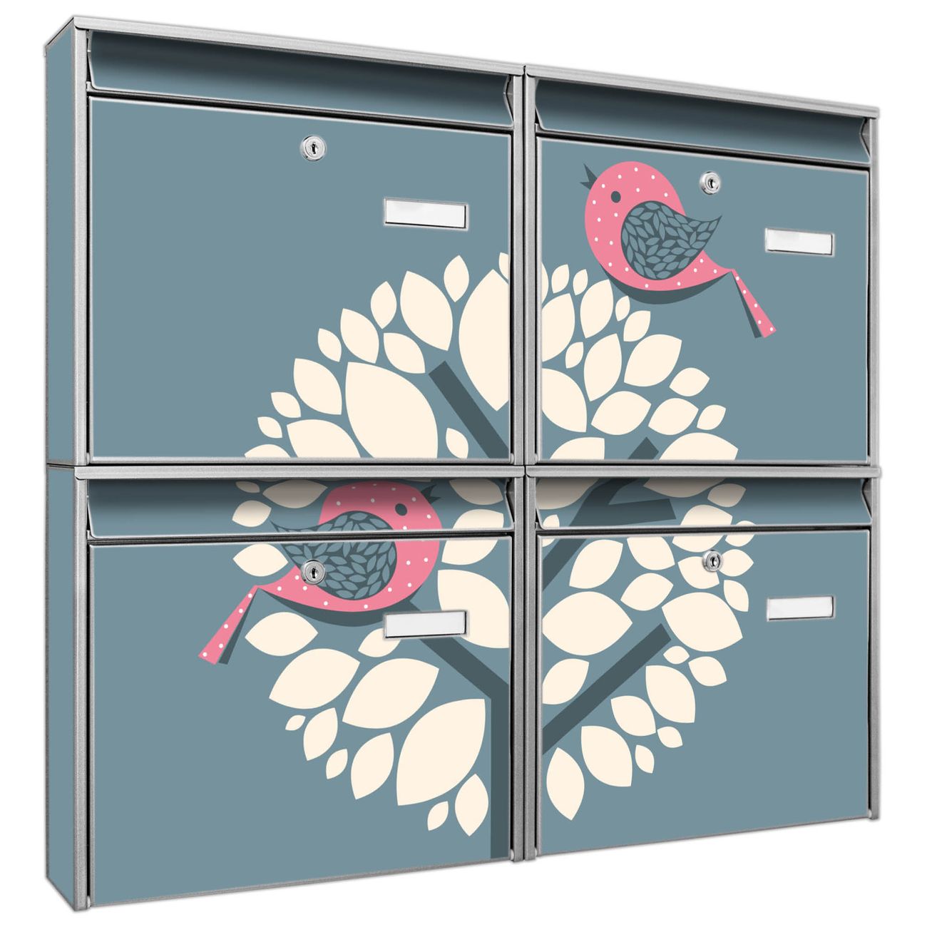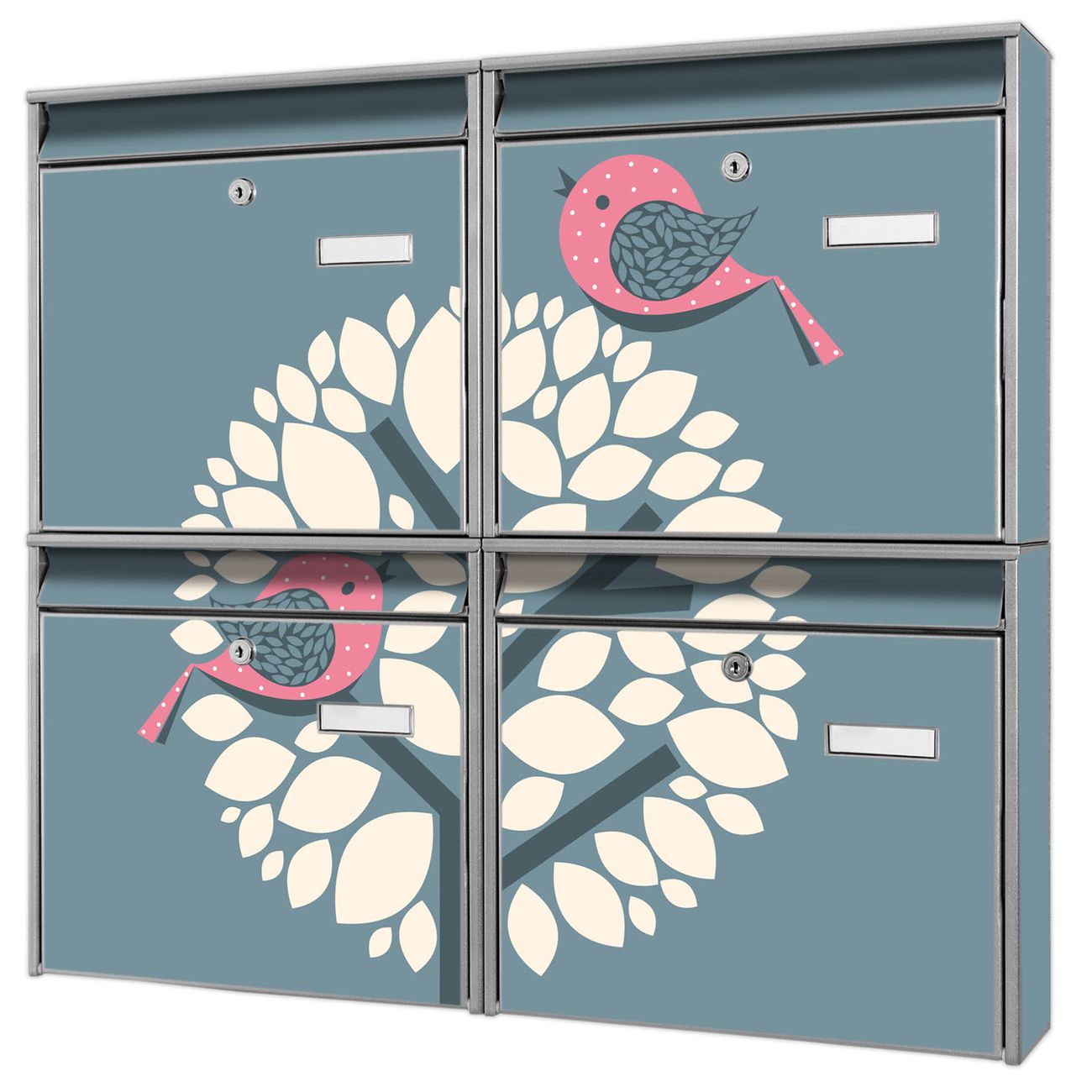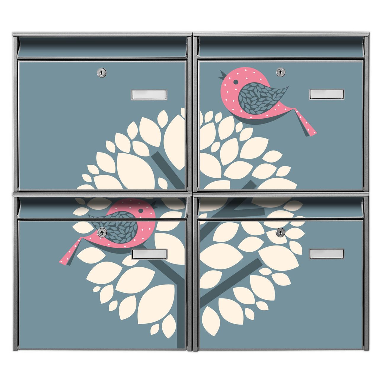 FUNKTION: Die Burg-Wächter Briefkastenanlage mit Motiv Zwei Rosa Vögel bietet Ihnen ausreichend Fassungsvermögen um auch A4 und C4 Sendungen zu empfangen. Das integrierte Namensschild lässt sich individuell beschriften. Wählen Sie aus den Grundfarben weiß, silber und schwarz. DESIGN: Die 4 Briefkästen haben ein ansprechendes und zeitloses Design, ohne dabei auf Funktionalität zu verzichten. Das Material ist sehr stabil, wetterfest und rostfrei. Durch das Motiv Zwei Rosa Vögel werden die Postkästen zu einem Blickfang. DETAILS: Die Postkästen bestehen aus verzinktem Stahl der zusätzlich mit Klarlack versiegelt wurde. Die Kästen sind gesamt 64,5cm hoch, 72,5cm breit und 10cm tief. Das Motiv besteht aus einer wetter- und UV-festen Folie, die Ihren Briefkasten zusätzlich vor Kratzern schützt. Die Postkästen werden mit Montagematerial, je einem Namensschild und je zwei Schlüsseln geliefert. NUTZEN: Das Briefkastenset eignet sich für die Wandmontage, die Größe bietet genügend Platz für Sendungen aller Art. Das zeitlose Design sowie die stabile Bauart bieten Ihnen einen treuen Begleiter für Ihre Post. BANJADO: