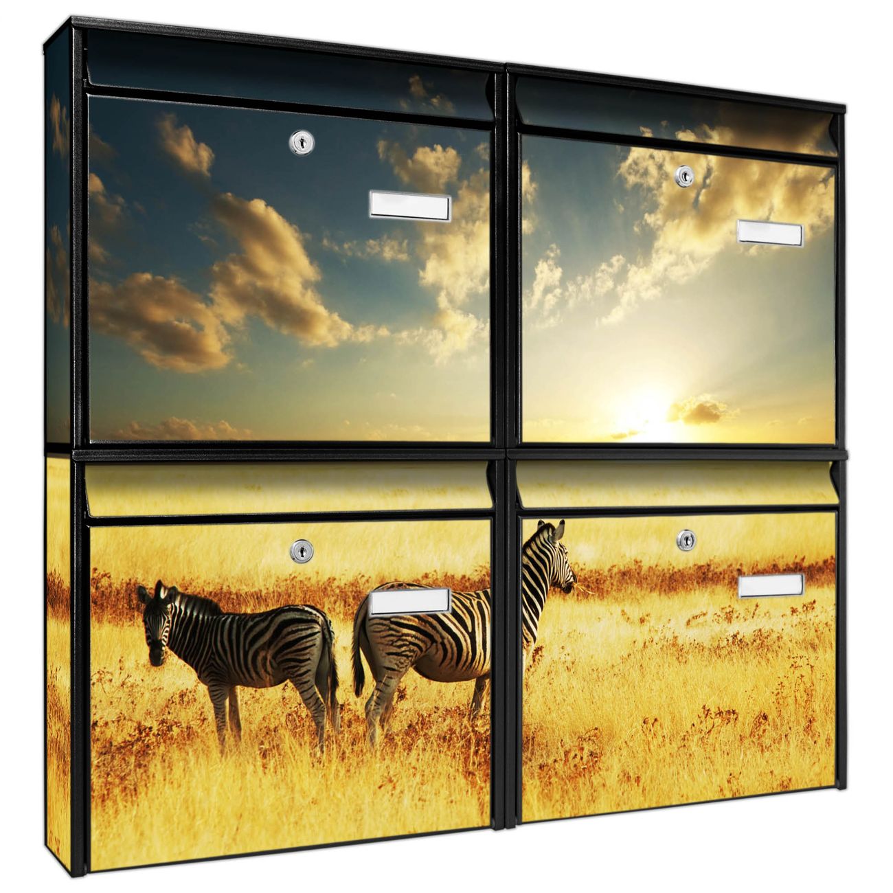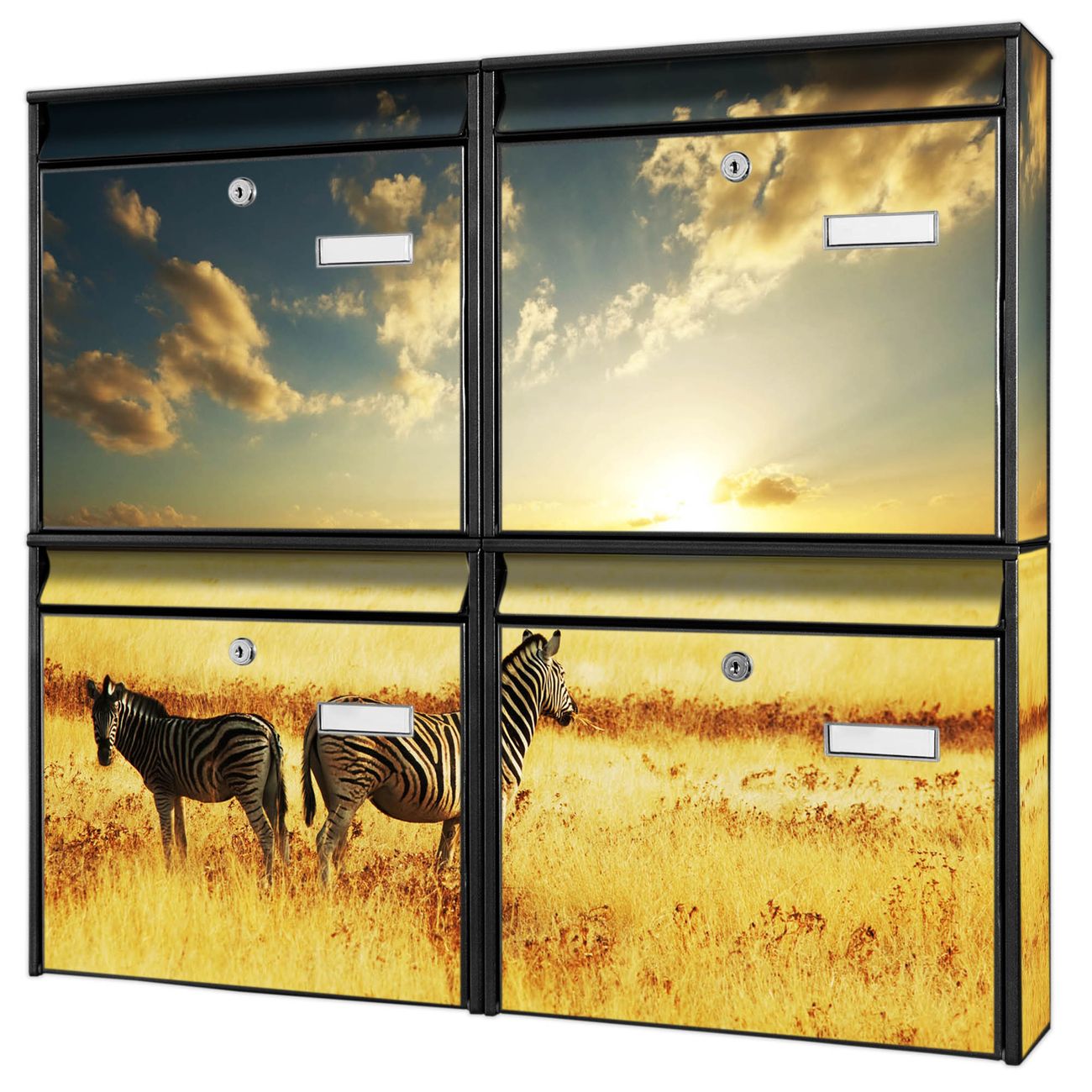 FUNKTION: Die Burg-Wächter Briefkastenanlage mit Motiv Zwei Zebras bietet Ihnen ausreichend Fassungsvermögen um auch A4 und C4 Sendungen zu empfangen. Das integrierte Namensschild lässt sich individuell beschriften. Wählen Sie aus den Grundfarben weiß, silber und schwarz. DESIGN: Die 4 Briefkästen haben ein ansprechendes und zeitloses Design, ohne dabei auf Funktionalität zu verzichten. Das Material ist sehr stabil, wetterfest und rostfrei. Durch das Motiv Zwei Zebras werden die Postkästen zu einem Blickfang. DETAILS: Die Postkästen bestehen aus verzinktem Stahl der zusätzlich mit Klarlack versiegelt wurde. Die Kästen sind gesamt 64,5cm hoch, 72,5cm breit und 10cm tief. Das Motiv besteht aus einer wetter- und UV-festen Folie, die Ihren Briefkasten zusätzlich vor Kratzern schützt. Die Postkästen werden mit Montagematerial, je einem Namensschild und je zwei Schlüsseln geliefert. NUTZEN: Das Briefkastenset eignet sich für die Wandmontage, die Größe bietet genügend Platz für Sendungen aller Art. Das zeitlose Design sowie die stabile Bauart bieten Ihnen einen treuen Begleiter für Ihre Post. BANJADO: