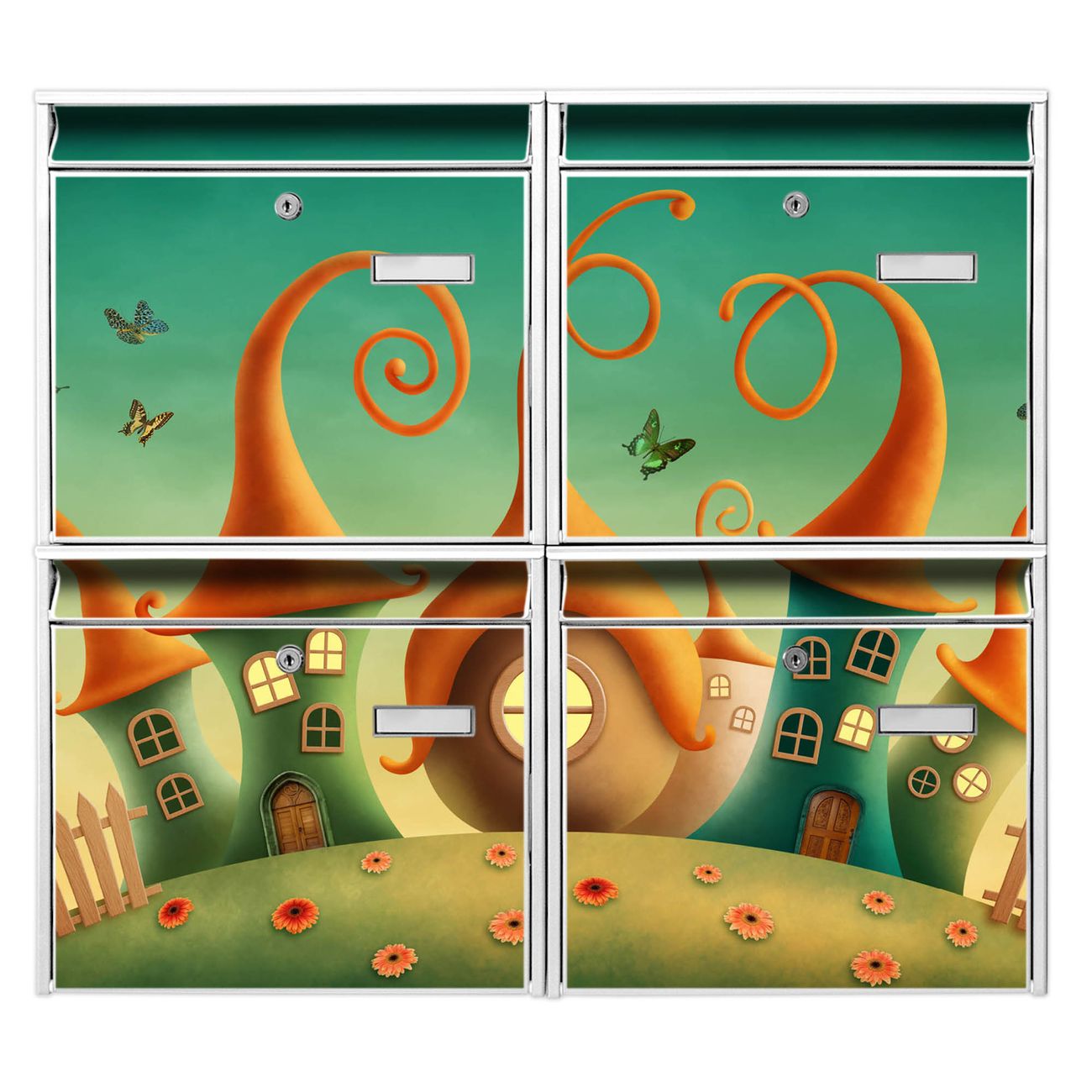 FUNKTION: Die Burg-Wächter Briefkastenanlage mit Motiv Zwergenhausen bietet Ihnen ausreichend Fassungsvermögen um auch A4 und C4 Sendungen zu empfangen. Das integrierte Namensschild lässt sich individuell beschriften. Wählen Sie aus den Grundfarben weiß, silber und schwarz. DESIGN: Die 4 Briefkästen haben ein ansprechendes und zeitloses Design, ohne dabei auf Funktionalität zu verzichten. Das Material ist sehr stabil, wetterfest und rostfrei. Durch das Motiv Zwergenhausen werden die Postkästen zu einem Blickfang. DETAILS: Die Postkästen bestehen aus verzinktem Stahl der zusätzlich mit Klarlack versiegelt wurde. Die Kästen sind gesamt 64,5cm hoch, 72,5cm breit und 10cm tief. Das Motiv besteht aus einer wetter- und UV-festen Folie, die Ihren Briefkasten zusätzlich vor Kratzern schützt. Die Postkästen werden mit Montagematerial, je einem Namensschild und je zwei Schlüsseln geliefert. NUTZEN: Das Briefkastenset eignet sich für die Wandmontage, die Größe bietet genügend Platz für Sendungen aller Art. Das zeitlose Design sowie die stabile Bauart bieten Ihnen einen treuen Begleiter für Ihre Post. BANJADO:
