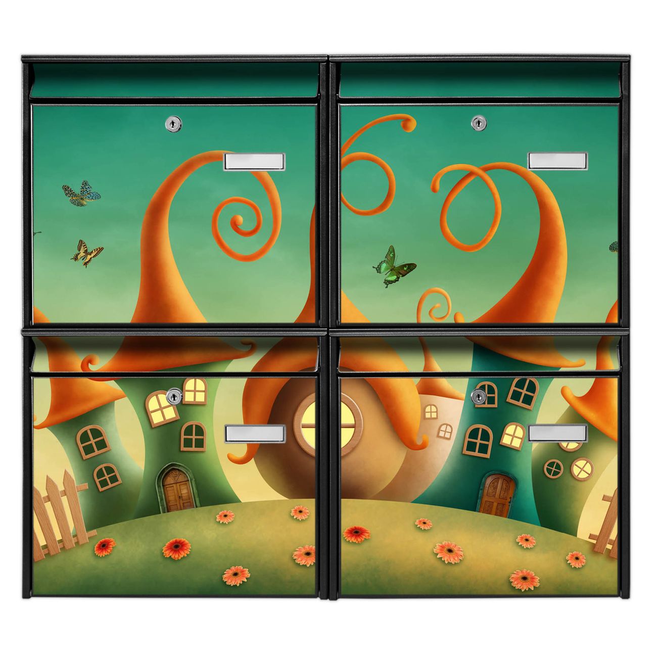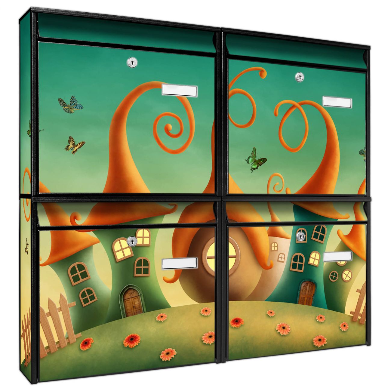 FUNKTION: Die Burg-Wächter Briefkastenanlage mit Motiv Zwergenhausen bietet Ihnen ausreichend Fassungsvermögen um auch A4 und C4 Sendungen zu empfangen. Das integrierte Namensschild lässt sich individuell beschriften. Wählen Sie aus den Grundfarben weiß, silber und schwarz. DESIGN: Die 4 Briefkästen haben ein ansprechendes und zeitloses Design, ohne dabei auf Funktionalität zu verzichten. Das Material ist sehr stabil, wetterfest und rostfrei. Durch das Motiv Zwergenhausen werden die Postkästen zu einem Blickfang. DETAILS: Die Postkästen bestehen aus verzinktem Stahl der zusätzlich mit Klarlack versiegelt wurde. Die Kästen sind gesamt 64,5cm hoch, 72,5cm breit und 10cm tief. Das Motiv besteht aus einer wetter- und UV-festen Folie, die Ihren Briefkasten zusätzlich vor Kratzern schützt. Die Postkästen werden mit Montagematerial, je einem Namensschild und je zwei Schlüsseln geliefert. NUTZEN: Das Briefkastenset eignet sich für die Wandmontage, die Größe bietet genügend Platz für Sendungen aller Art. Das zeitlose Design sowie die stabile Bauart bieten Ihnen einen treuen Begleiter für Ihre Post. BANJADO: