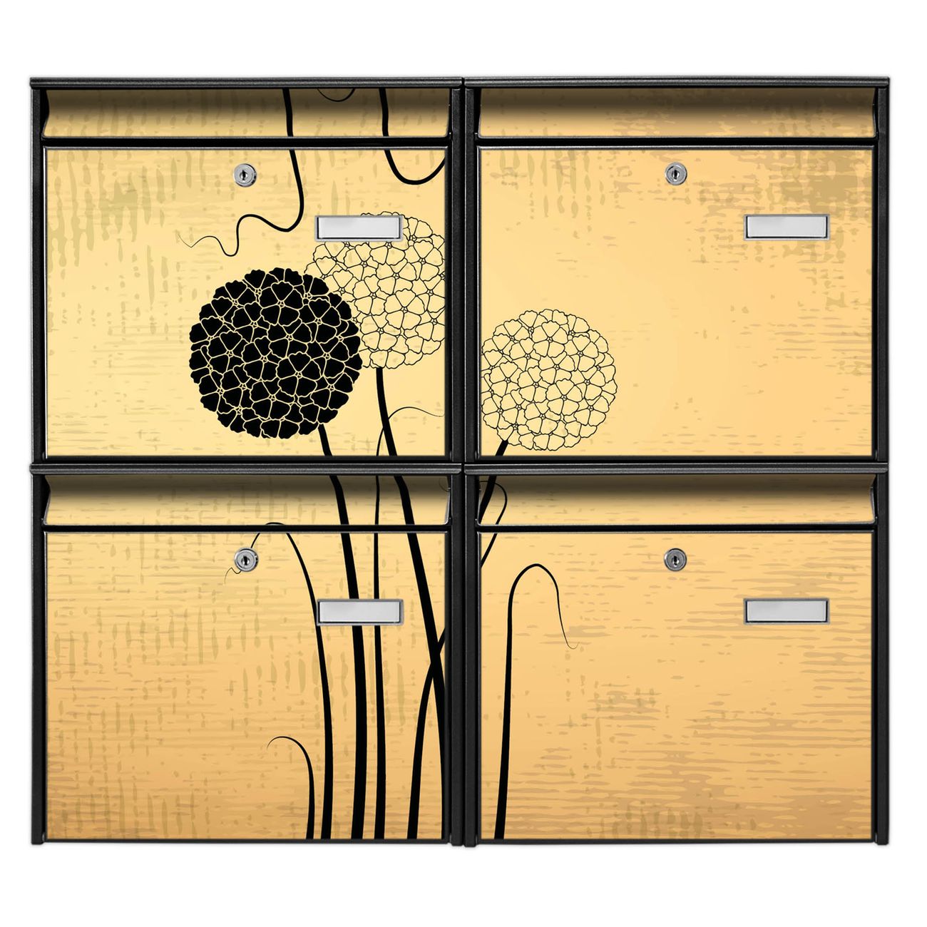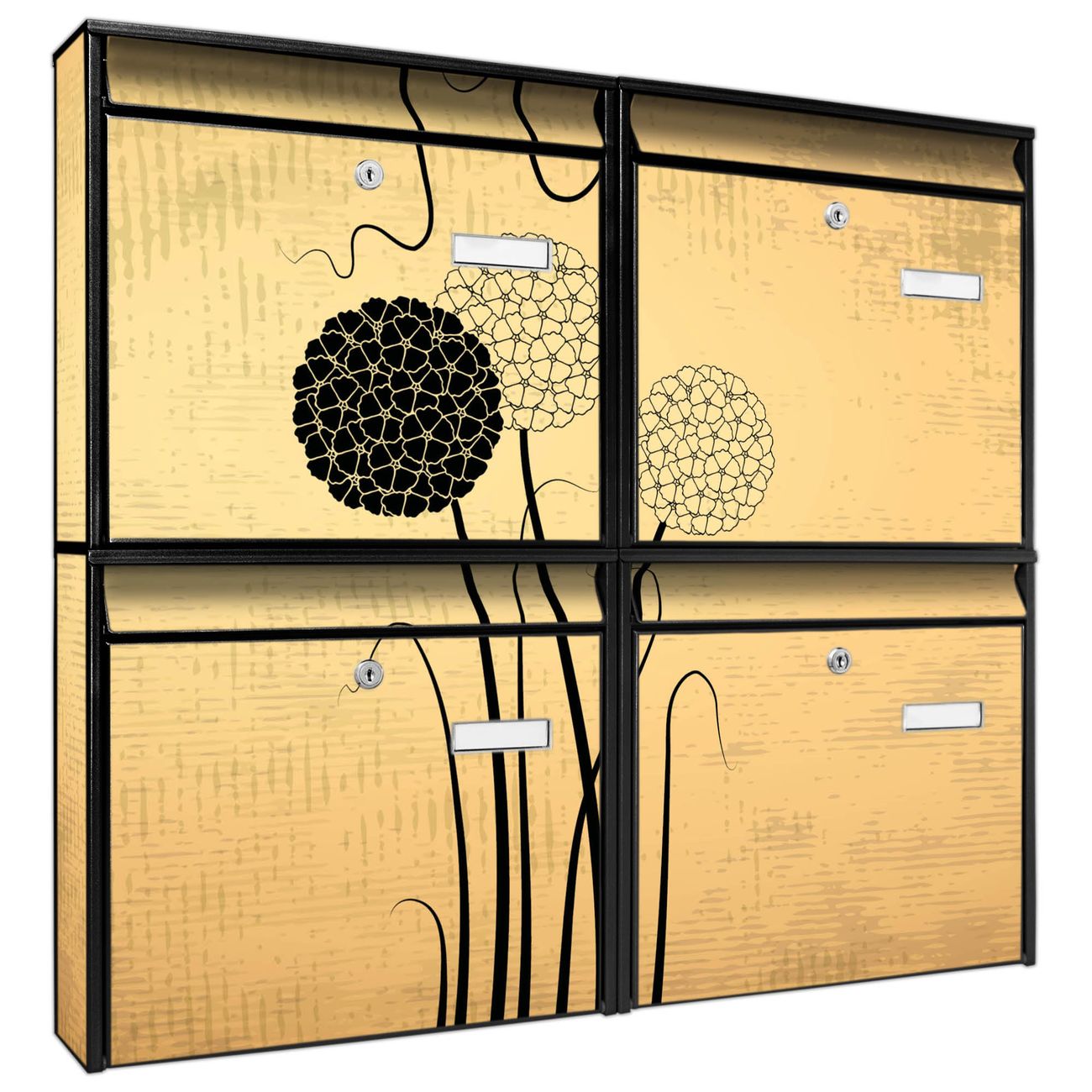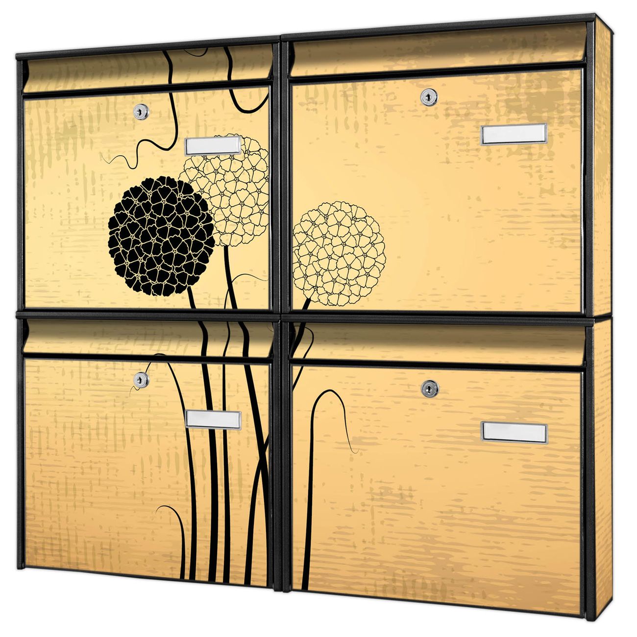 FUNKTION: Die Burg-Wächter Briefkastenanlage mit Motiv Zwiebel Vintage bietet Ihnen ausreichend Fassungsvermögen um auch A4 und C4 Sendungen zu empfangen. Das integrierte Namensschild lässt sich individuell beschriften. Wählen Sie aus den Grundfarben weiß, silber und schwarz. DESIGN: Die 4 Briefkästen haben ein ansprechendes und zeitloses Design, ohne dabei auf Funktionalität zu verzichten. Das Material ist sehr stabil, wetterfest und rostfrei. Durch das Motiv Zwiebel Vintage werden die Postkästen zu einem Blickfang. DETAILS: Die Postkästen bestehen aus verzinktem Stahl der zusätzlich mit Klarlack versiegelt wurde. Die Kästen sind gesamt 64,5cm hoch, 72,5cm breit und 10cm tief. Das Motiv besteht aus einer wetter- und UV-festen Folie, die Ihren Briefkasten zusätzlich vor Kratzern schützt. Die Postkästen werden mit Montagematerial, je einem Namensschild und je zwei Schlüsseln geliefert. NUTZEN: Das Briefkastenset eignet sich für die Wandmontage, die Größe bietet genügend Platz für Sendungen aller Art. Das zeitlose Design sowie die stabile Bauart bieten Ihnen einen treuen Begleiter für Ihre Post. BANJADO: