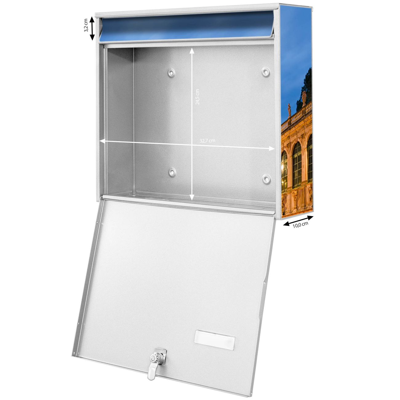 FUNKTION: Die Burg-Wächter Briefkastenanlage mit Motiv Zwinger Dresden bietet Ihnen ausreichend Fassungsvermögen um auch A4 und C4 Sendungen zu empfangen. Das integrierte Namensschild lässt sich individuell beschriften. Wählen Sie aus den Grundfarben weiß, silber und schwarz. DESIGN: Die 4 Briefkästen haben ein ansprechendes und zeitloses Design, ohne dabei auf Funktionalität zu verzichten. Das Material ist sehr stabil, wetterfest und rostfrei. Durch das Motiv Zwinger Dresden werden die Postkästen zu einem Blickfang. DETAILS: Die Postkästen bestehen aus verzinktem Stahl der zusätzlich mit Klarlack versiegelt wurde. Die Kästen sind gesamt 64,5cm hoch, 72,5cm breit und 10cm tief. Das Motiv besteht aus einer wetter- und UV-festen Folie, die Ihren Briefkasten zusätzlich vor Kratzern schützt. Die Postkästen werden mit Montagematerial, je einem Namensschild und je zwei Schlüsseln geliefert. NUTZEN: Das Briefkastenset eignet sich für die Wandmontage, die Größe bietet genügend Platz für Sendungen aller Art. Das zeitlose Design sowie die stabile Bauart bieten Ihnen einen treuen Begleiter für Ihre Post. BANJADO: