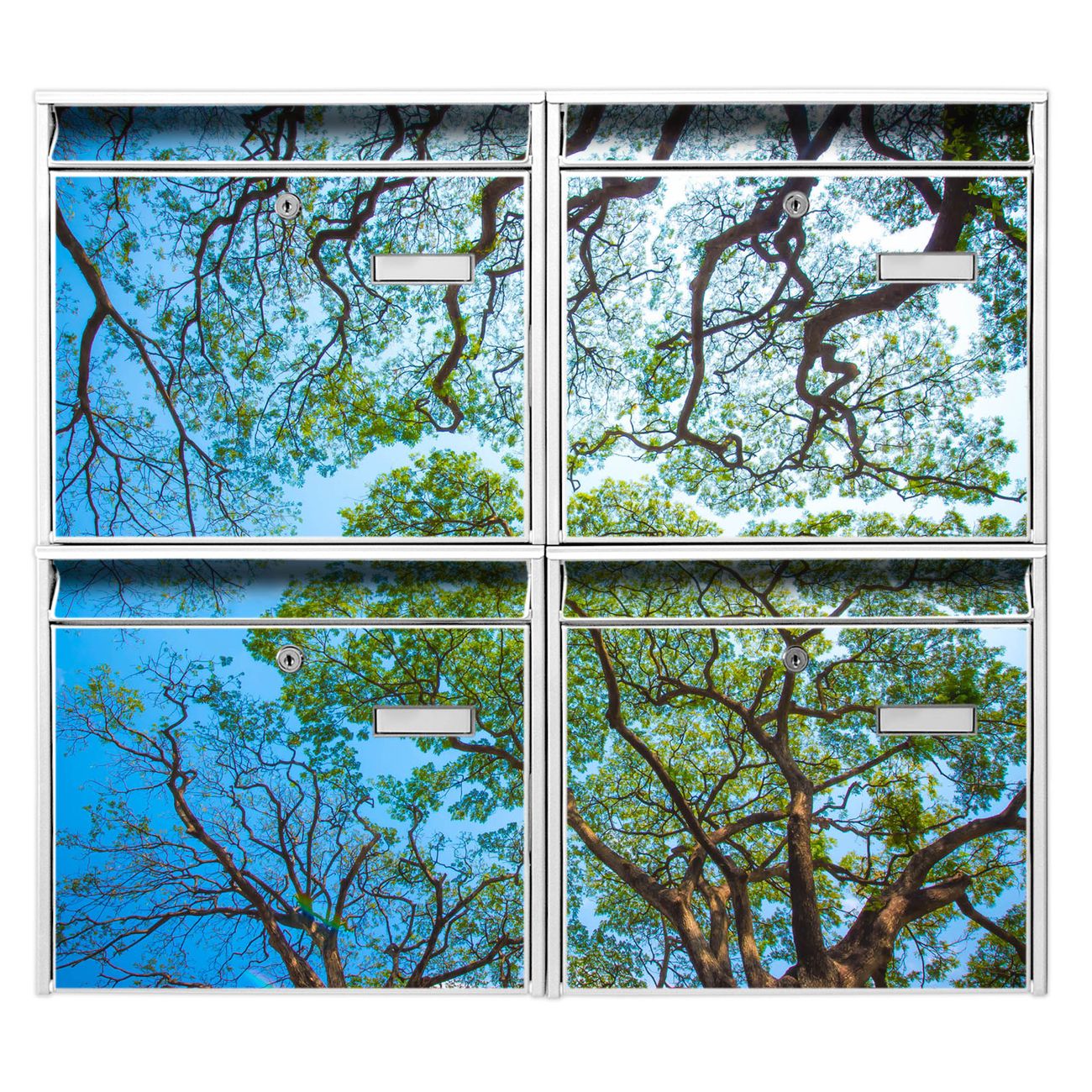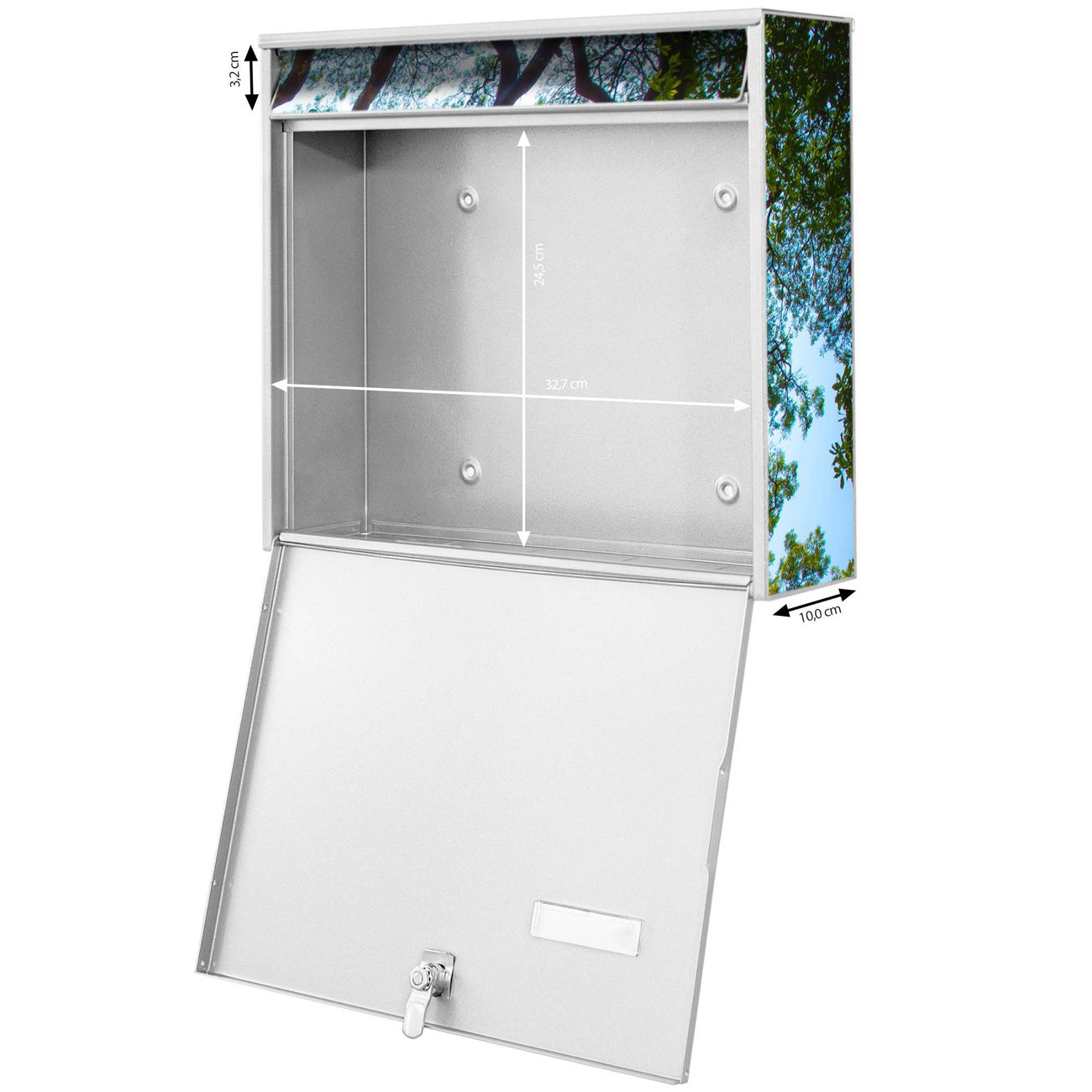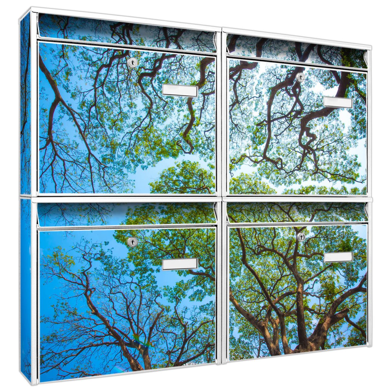FUNKTION: Die Burg-Wächter Briefkastenanlage mit Motiv Zwischen Bäumen 2 bietet Ihnen ausreichend Fassungsvermögen um auch A4 und C4 Sendungen zu empfangen. Das integrierte Namensschild lässt sich individuell beschriften. Wählen Sie aus den Grundfarben weiß, silber und schwarz. DESIGN: Die 4 Briefkästen haben ein ansprechendes und zeitloses Design, ohne dabei auf Funktionalität zu verzichten. Das Material ist sehr stabil, wetterfest und rostfrei. Durch das Motiv Zwischen Bäumen 2 werden die Postkästen zu einem Blickfang. DETAILS: Die Postkästen bestehen aus verzinktem Stahl der zusätzlich mit Klarlack versiegelt wurde. Die Kästen sind gesamt 64,5cm hoch, 72,5cm breit und 10cm tief. Das Motiv besteht aus einer wetter- und UV-festen Folie, die Ihren Briefkasten zusätzlich vor Kratzern schützt. Die Postkästen werden mit Montagematerial, je einem Namensschild und je zwei Schlüsseln geliefert. NUTZEN: Das Briefkastenset eignet sich für die Wandmontage, die Größe bietet genügend Platz für Sendungen aller Art. Das zeitlose Design sowie die stabile Bauart bieten Ihnen einen treuen Begleiter für Ihre Post. BANJADO: