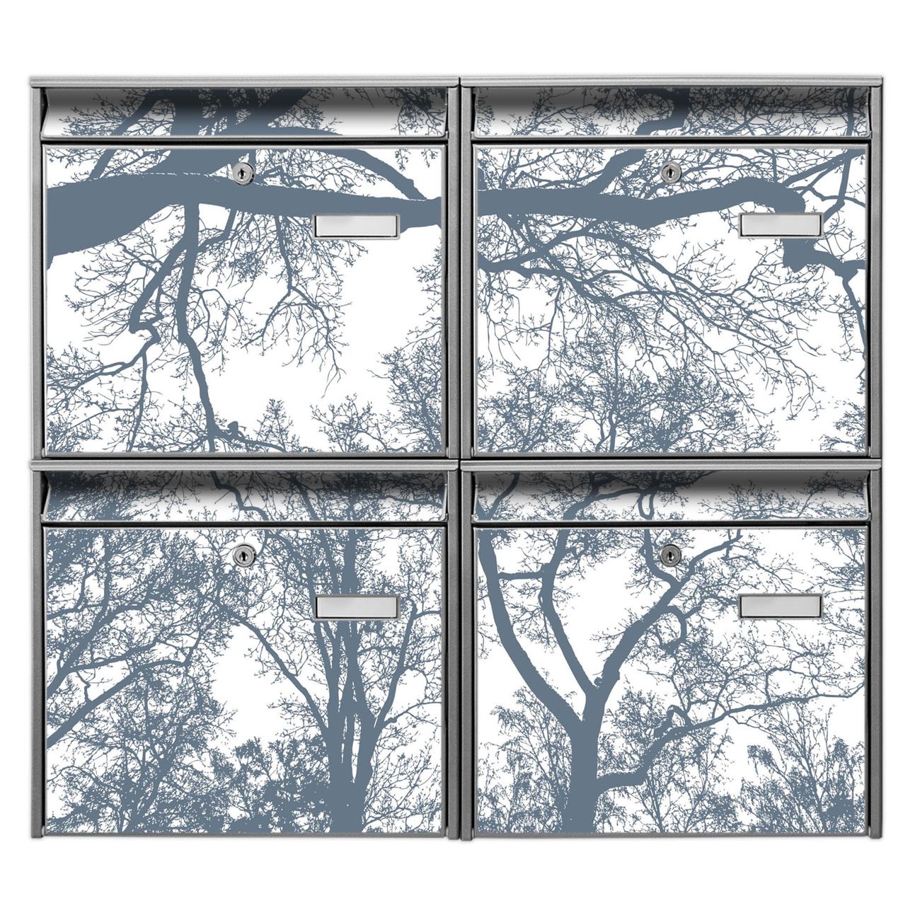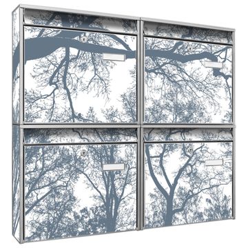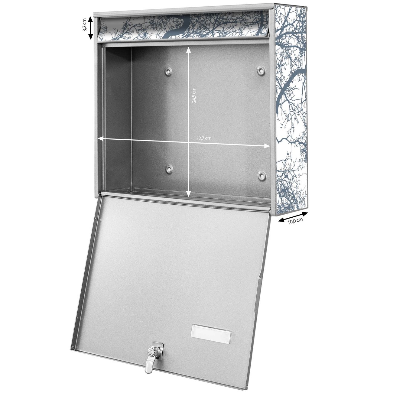 FUNKTION: Die Burg-Wächter Briefkastenanlage mit Motiv Zwischen Bäumen 7 bietet Ihnen ausreichend Fassungsvermögen um auch A4 und C4 Sendungen zu empfangen. Das integrierte Namensschild lässt sich individuell beschriften. Wählen Sie aus den Grundfarben weiß, silber und schwarz. DESIGN: Die 4 Briefkästen haben ein ansprechendes und zeitloses Design, ohne dabei auf Funktionalität zu verzichten. Das Material ist sehr stabil, wetterfest und rostfrei. Durch das Motiv Zwischen Bäumen 7 werden die Postkästen zu einem Blickfang. DETAILS: Die Postkästen bestehen aus verzinktem Stahl der zusätzlich mit Klarlack versiegelt wurde. Die Kästen sind gesamt 64,5cm hoch, 72,5cm breit und 10cm tief. Das Motiv besteht aus einer wetter- und UV-festen Folie, die Ihren Briefkasten zusätzlich vor Kratzern schützt. Die Postkästen werden mit Montagematerial, je einem Namensschild und je zwei Schlüsseln geliefert. NUTZEN: Das Briefkastenset eignet sich für die Wandmontage, die Größe bietet genügend Platz für Sendungen aller Art. Das zeitlose Design sowie die stabile Bauart bieten Ihnen einen treuen Begleiter für Ihre Post. BANJADO:
