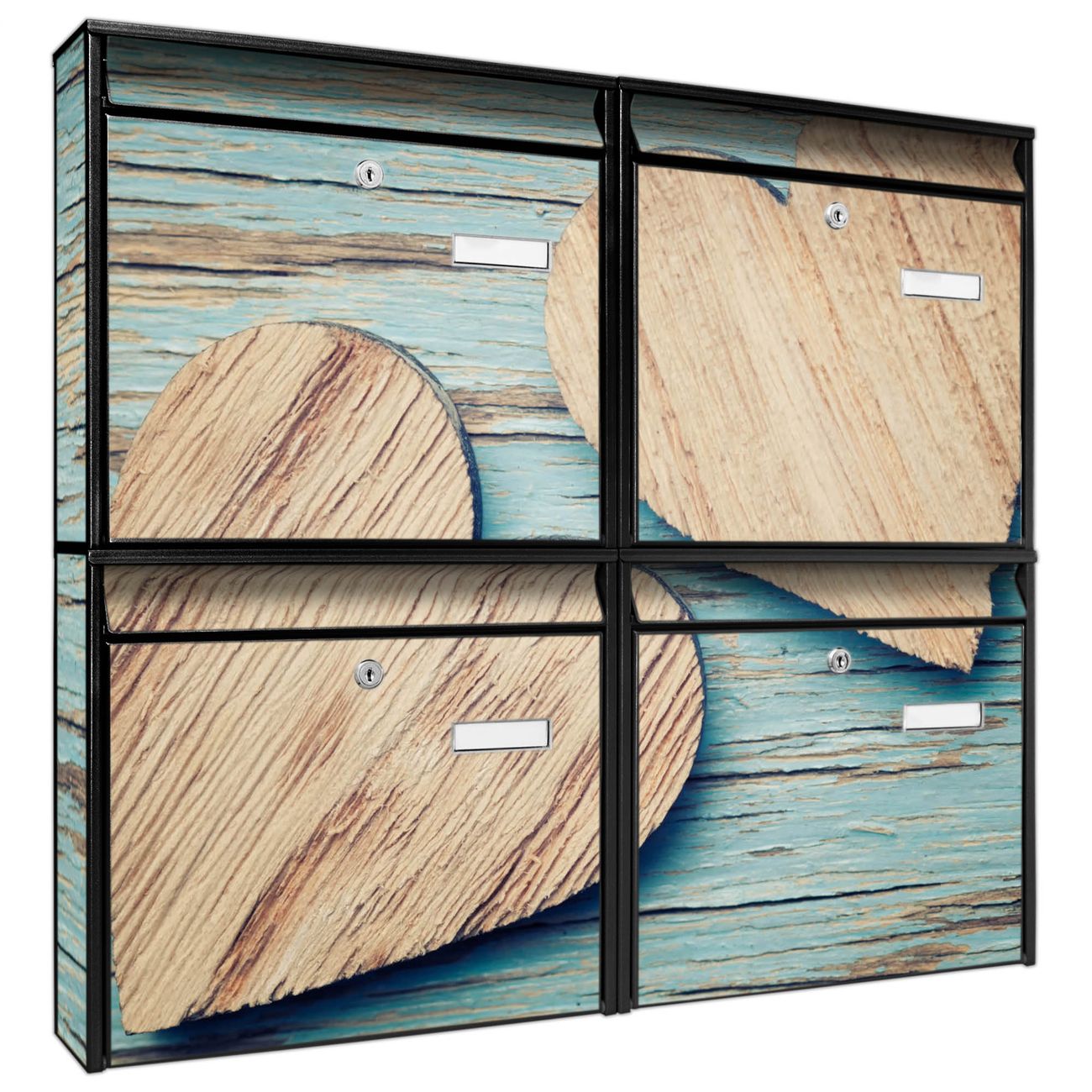 FUNKTION: Die Burg-Wächter Briefkastenanlage mit Motiv Holz Herzen bietet Ihnen ausreichend Fassungsvermögen um auch A4 und C4 Sendungen zu empfangen. Das integrierte Namensschild lässt sich individuell beschriften. Wählen Sie aus den Grundfarben weiß, silber und schwarz. DESIGN: Die 4 Briefkästen haben ein ansprechendes und zeitloses Design, ohne dabei auf Funktionalität zu verzichten. Das Material ist sehr stabil, wetterfest und rostfrei. Durch das Motiv Holz Herzen werden die Postkästen zu einem Blickfang. DETAILS: Die Postkästen bestehen aus verzinktem Stahl der zusätzlich mit Klarlack versiegelt wurde. Die Kästen sind gesamt 64,5cm hoch, 72,5cm breit und 10cm tief. Das Motiv besteht aus einer wetter- und UV-festen Folie, die Ihren Briefkasten zusätzlich vor Kratzern schützt. Die Postkästen werden mit Montagematerial, je einem Namensschild und je zwei Schlüsseln geliefert. NUTZEN: Das Briefkastenset eignet sich für die Wandmontage, die Größe bietet genügend Platz für Sendungen aller Art. Das zeitlose Design sowie die stabile Bauart bieten Ihnen einen treuen Begleiter für Ihre Post. BANJADO:
