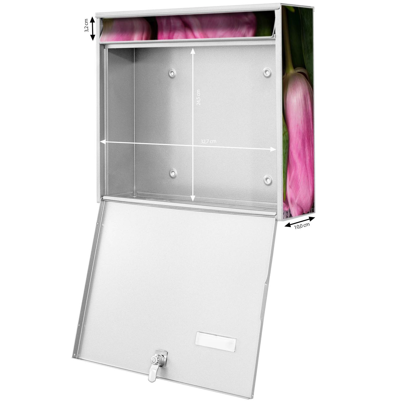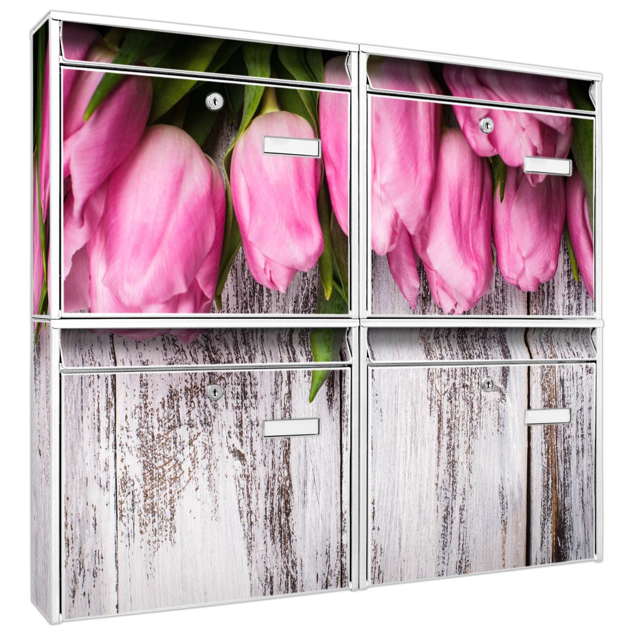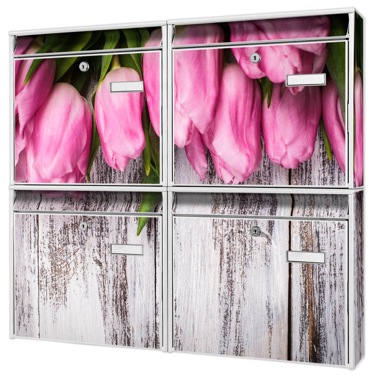 FUNKTION: Die Burg-Wächter Briefkastenanlage mit Motiv Holz und Tulpen bietet Ihnen ausreichend Fassungsvermögen um auch A4 und C4 Sendungen zu empfangen. Das integrierte Namensschild lässt sich individuell beschriften. Wählen Sie aus den Grundfarben weiß, silber und schwarz. DESIGN: Die 4 Briefkästen haben ein ansprechendes und zeitloses Design, ohne dabei auf Funktionalität zu verzichten. Das Material ist sehr stabil, wetterfest und rostfrei. Durch das Motiv Holz und Tulpen werden die Postkästen zu einem Blickfang. DETAILS: Die Postkästen bestehen aus verzinktem Stahl der zusätzlich mit Klarlack versiegelt wurde. Die Kästen sind gesamt 64,5cm hoch, 72,5cm breit und 10cm tief. Das Motiv besteht aus einer wetter- und UV-festen Folie, die Ihren Briefkasten zusätzlich vor Kratzern schützt. Die Postkästen werden mit Montagematerial, je einem Namensschild und je zwei Schlüsseln geliefert. NUTZEN: Das Briefkastenset eignet sich für die Wandmontage, die Größe bietet genügend Platz für Sendungen aller Art. Das zeitlose Design sowie die stabile Bauart bieten Ihnen einen treuen Begleiter für Ihre Post. BANJADO: