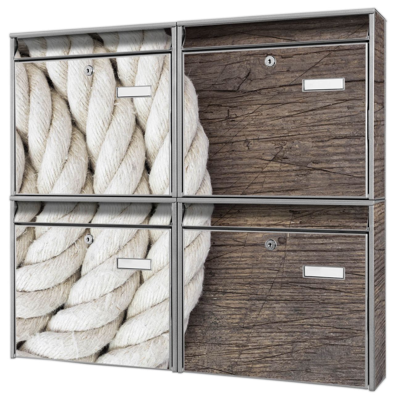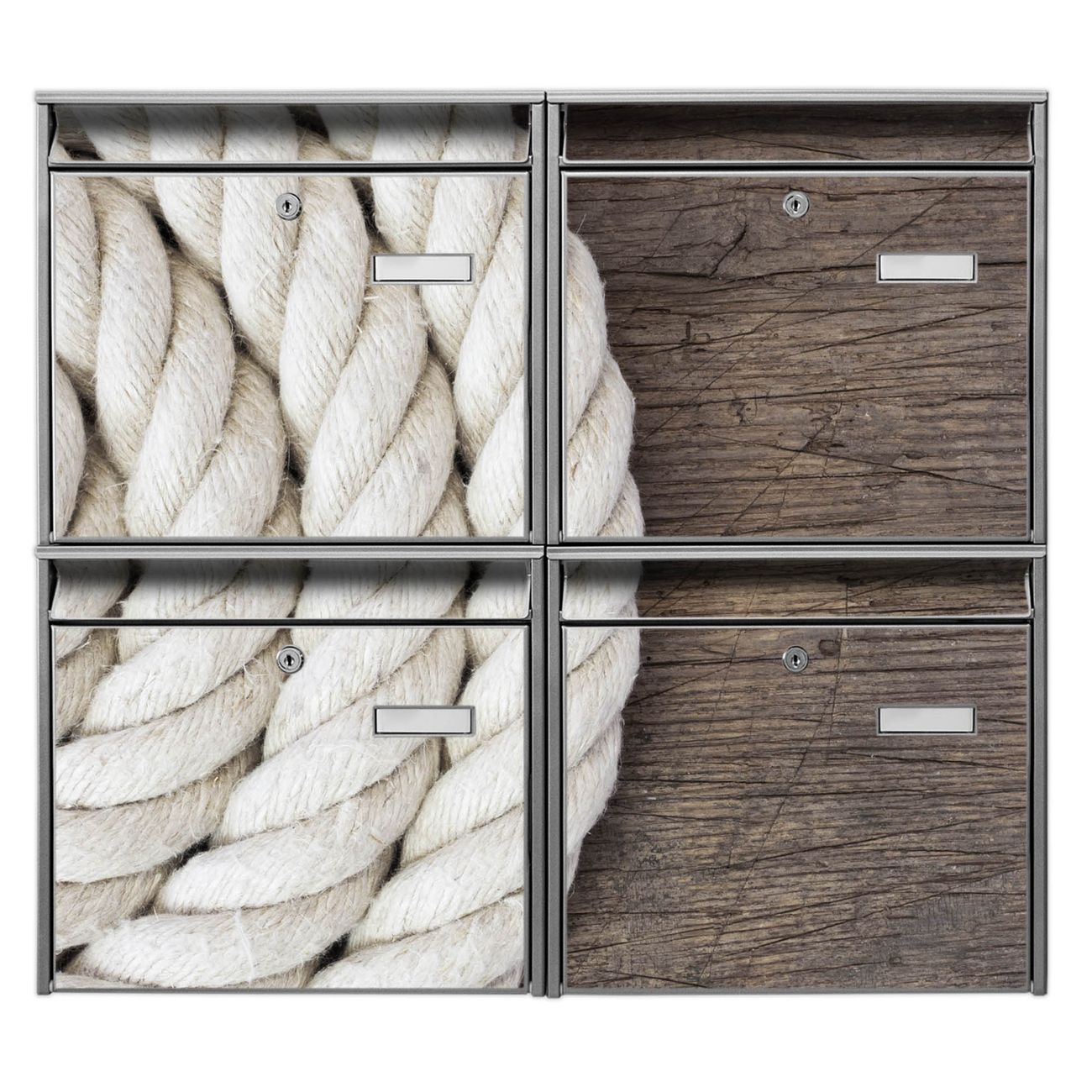 FUNKTION: Die Burg-Wächter Briefkastenanlage mit Motiv Seil bietet Ihnen ausreichend Fassungsvermögen um auch A4 und C4 Sendungen zu empfangen. Das integrierte Namensschild lässt sich individuell beschriften. Wählen Sie aus den Grundfarben weiß, silber und schwarz. DESIGN: Die 4 Briefkästen haben ein ansprechendes und zeitloses Design, ohne dabei auf Funktionalität zu verzichten. Das Material ist sehr stabil, wetterfest und rostfrei. Durch das Motiv Seil werden die Postkästen zu einem Blickfang. DETAILS: Die Postkästen bestehen aus verzinktem Stahl der zusätzlich mit Klarlack versiegelt wurde. Die Kästen sind gesamt 64,5cm hoch, 72,5cm breit und 10cm tief. Das Motiv besteht aus einer wetter- und UV-festen Folie, die Ihren Briefkasten zusätzlich vor Kratzern schützt. Die Postkästen werden mit Montagematerial, je einem Namensschild und je zwei Schlüsseln geliefert. NUTZEN: Das Briefkastenset eignet sich für die Wandmontage, die Größe bietet genügend Platz für Sendungen aller Art. Das zeitlose Design sowie die stabile Bauart bieten Ihnen einen treuen Begleiter für Ihre Post. BANJADO: