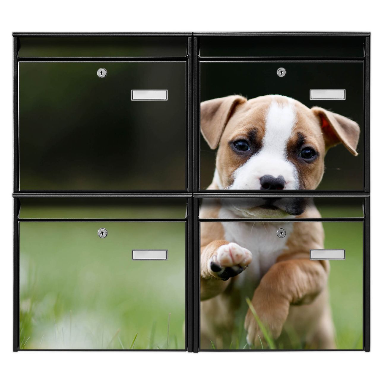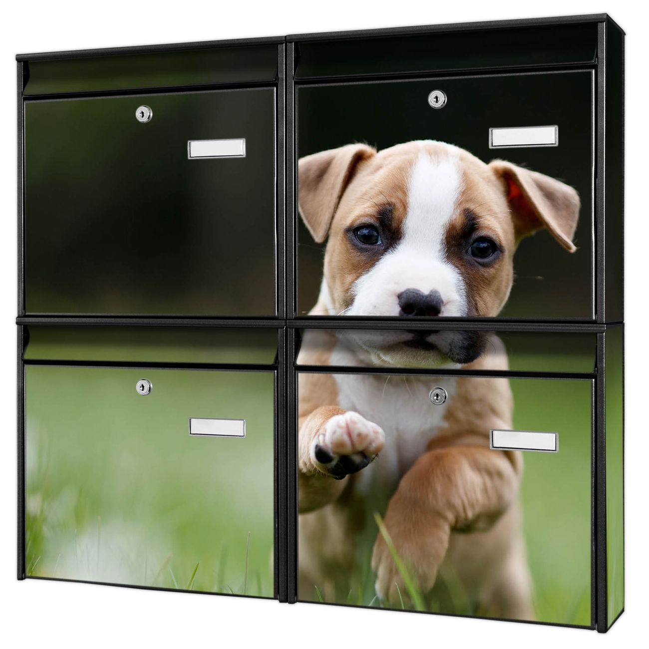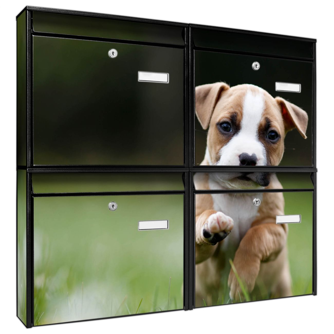 FUNKTION: Die Burg-Wächter Briefkastenanlage mit Motiv Welpe im Gras bietet Ihnen ausreichend Fassungsvermögen um auch A4 und C4 Sendungen zu empfangen. Das integrierte Namensschild lässt sich individuell beschriften. Wählen Sie aus den Grundfarben weiß, silber und schwarz. DESIGN: Die 4 Briefkästen haben ein ansprechendes und zeitloses Design, ohne dabei auf Funktionalität zu verzichten. Das Material ist sehr stabil, wetterfest und rostfrei. Durch das Motiv Welpe im Gras werden die Postkästen zu einem Blickfang. DETAILS: Die Postkästen bestehen aus verzinktem Stahl der zusätzlich mit Klarlack versiegelt wurde. Die Kästen sind gesamt 64,5cm hoch, 72,5cm breit und 10cm tief. Das Motiv besteht aus einer wetter- und UV-festen Folie, die Ihren Briefkasten zusätzlich vor Kratzern schützt. Die Postkästen werden mit Montagematerial, je einem Namensschild und je zwei Schlüsseln geliefert. NUTZEN: Das Briefkastenset eignet sich für die Wandmontage, die Größe bietet genügend Platz für Sendungen aller Art. Das zeitlose Design sowie die stabile Bauart bieten Ihnen einen treuen Begleiter für Ihre Post. BANJADO:
