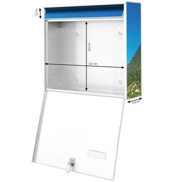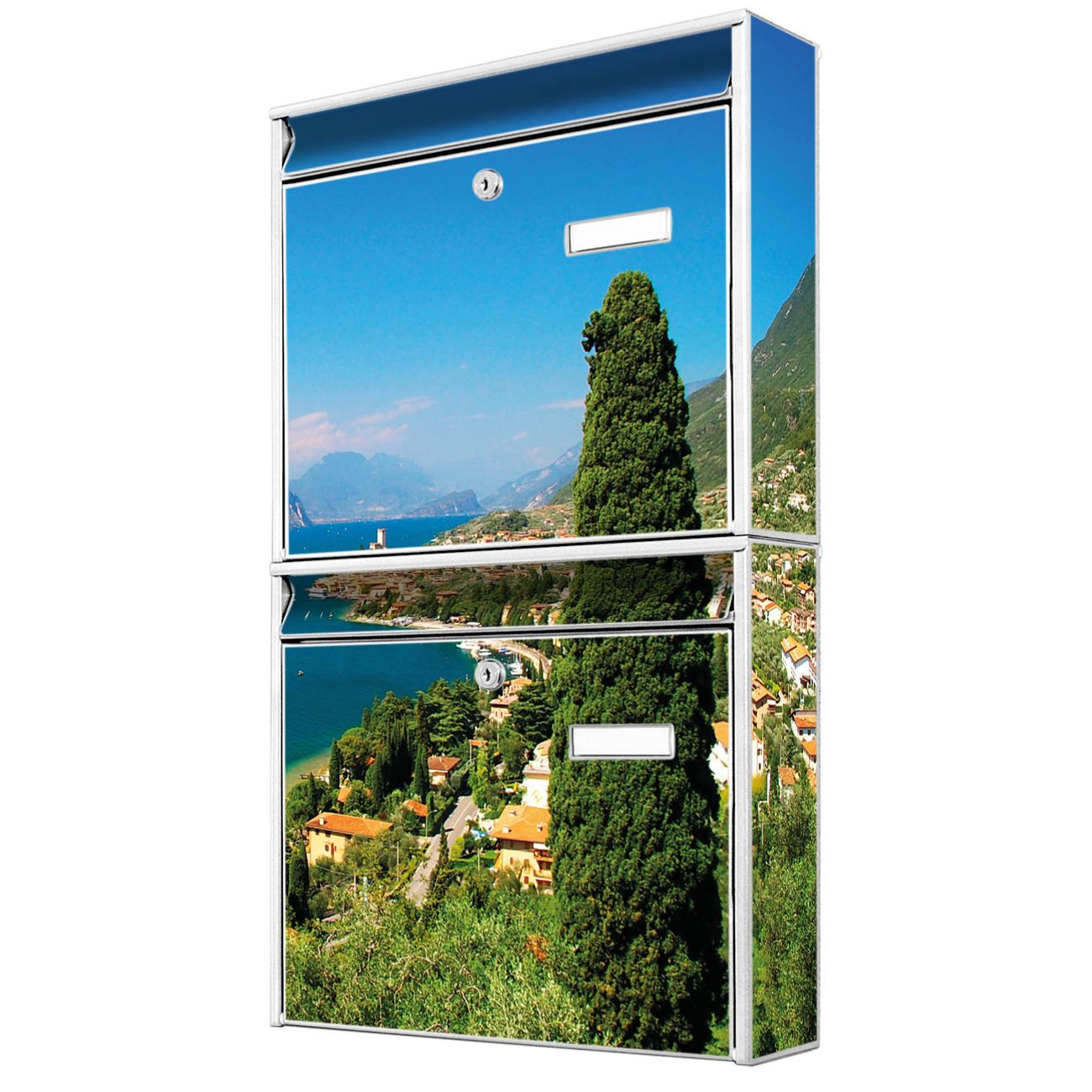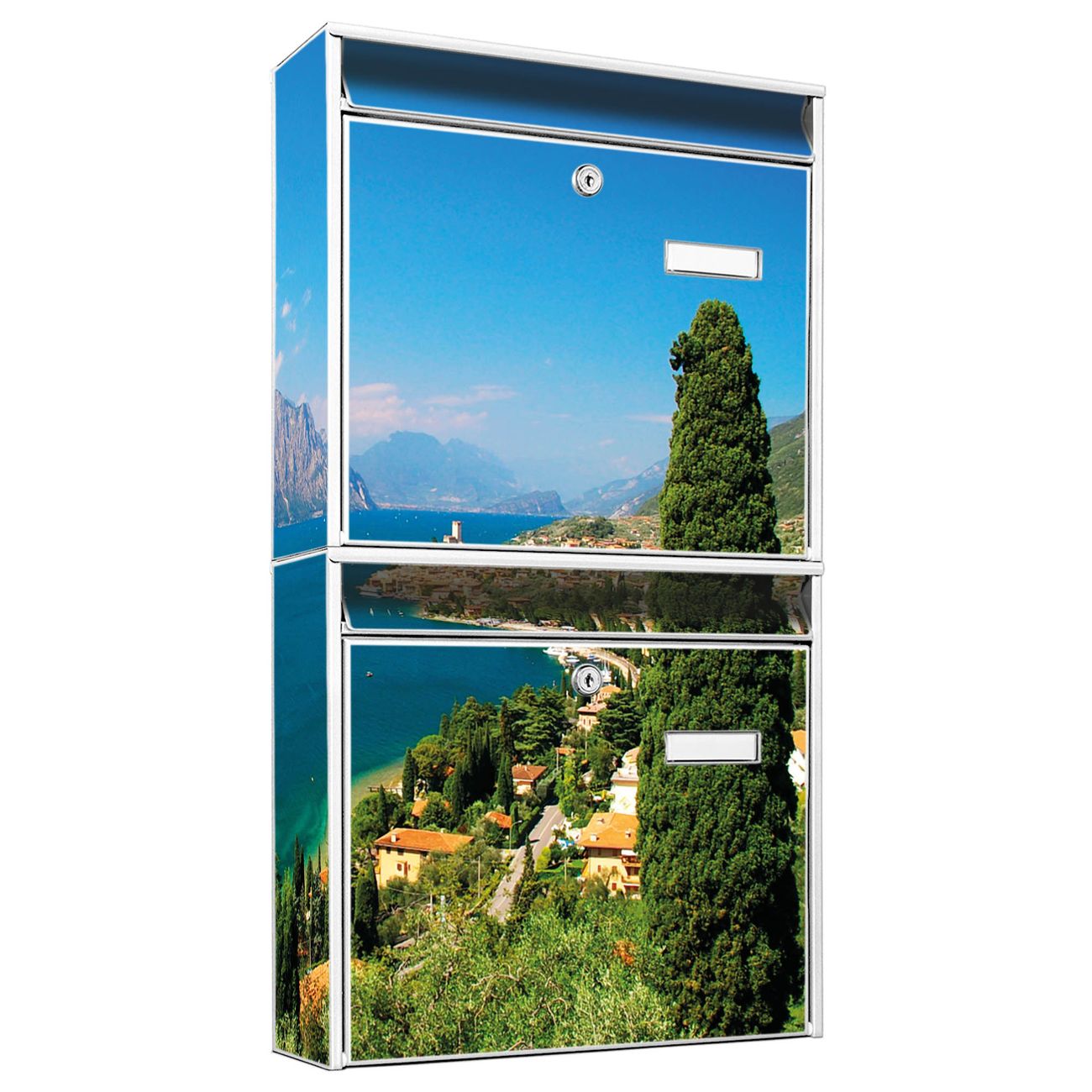 FUNKTION: Die Burg-Wächter Briefkastenanlage mit Motiv Gardasee bietet Ihnen ausreichend Fassungsvermögen um auch A4 und C4 Sendungen zu empfangen. Das integrierte Namensschild lässt sich individuell beschriften. Wählen Sie aus den Grundfarben weiß, silber und schwarz. DESIGN: Die 2 Briefkästen haben ein ansprechendes und zeitloses Design, ohne dabei auf Funktionalität zu verzichten. Das Material ist sehr stabil, wetterfest und rostfrei. Durch das Motiv Gardasee werden die Postkästen zu einem Blickfang. DETAILS: Die Postkästen bestehen aus verzinktem Stahl der zusätzlich mit Klarlack versiegelt wurde. Die Kästen sind gesamt 64,5cm hoch, 36,2cm breit und 10cm tief. Das Motiv besteht aus einer wetter- und UV-festen Folie, die Ihren Briefkasten zusätzlich vor Kratzern schützt. Die Postkästen werden mit Montagematerial, je einem Namensschild und je zwei Schlüsseln geliefert. NUTZEN: Das Briefkastenset eignet sich für die Wandmontage, die Größe bietet genügend Platz für Sendungen aller Art. Das zeitlose Design sowie die stabile Bauart bieten Ihnen einen treuen Begleiter für Ihre Post. BANJADO: