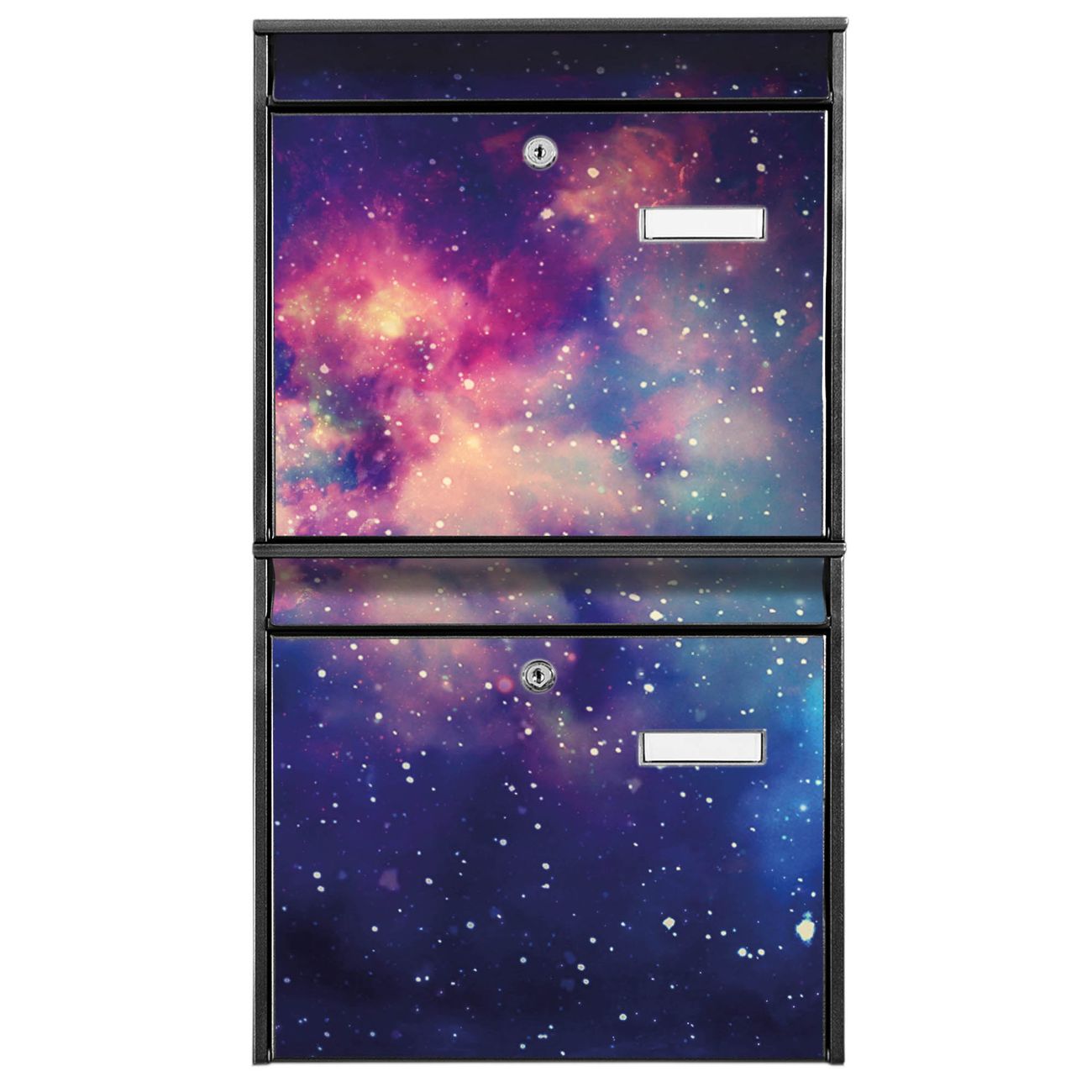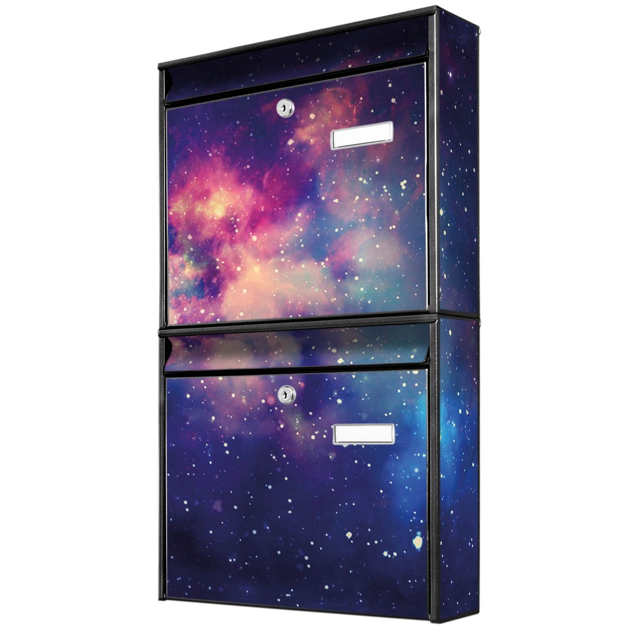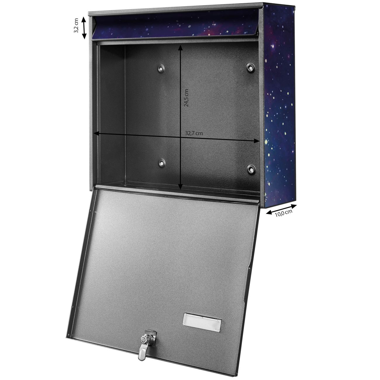FUNKTION: Die Burg-Wächter Briefkastenanlage mit Motiv Im Weltall 1 bietet Ihnen ausreichend Fassungsvermögen um auch A4 und C4 Sendungen zu empfangen. Das integrierte Namensschild lässt sich individuell beschriften. Wählen Sie aus den Grundfarben weiß, silber und schwarz. DESIGN: Die 2 Briefkästen haben ein ansprechendes und zeitloses Design, ohne dabei auf Funktionalität zu verzichten. Das Material ist sehr stabil, wetterfest und rostfrei. Durch das Motiv Im Weltall 1 werden die Postkästen zu einem Blickfang. DETAILS: Die Postkästen bestehen aus verzinktem Stahl der zusätzlich mit Klarlack versiegelt wurde. Die Kästen sind gesamt 64,5cm hoch, 36,2cm breit und 10cm tief. Das Motiv besteht aus einer wetter- und UV-festen Folie, die Ihren Briefkasten zusätzlich vor Kratzern schützt. Die Postkästen werden mit Montagematerial, je einem Namensschild und je zwei Schlüsseln geliefert. NUTZEN: Das Briefkastenset eignet sich für die Wandmontage, die Größe bietet genügend Platz für Sendungen aller Art. Das zeitlose Design sowie die stabile Bauart bieten Ihnen einen treuen Begleiter für Ihre Post. BANJADO: