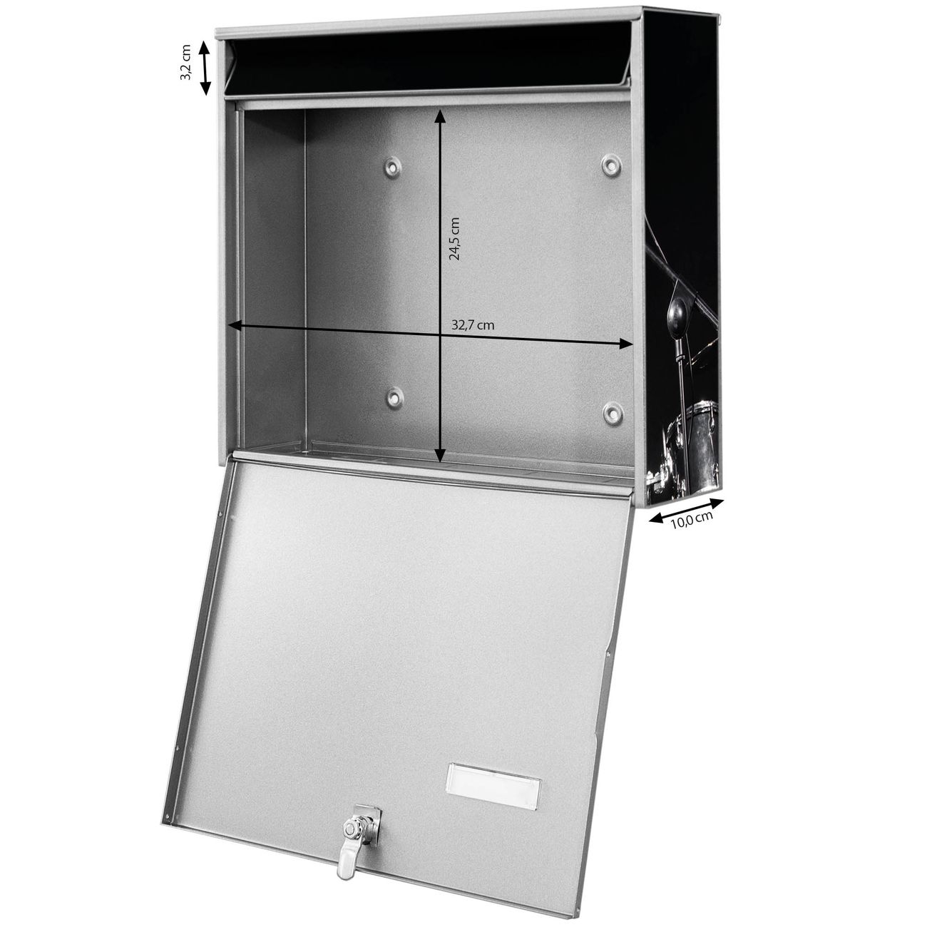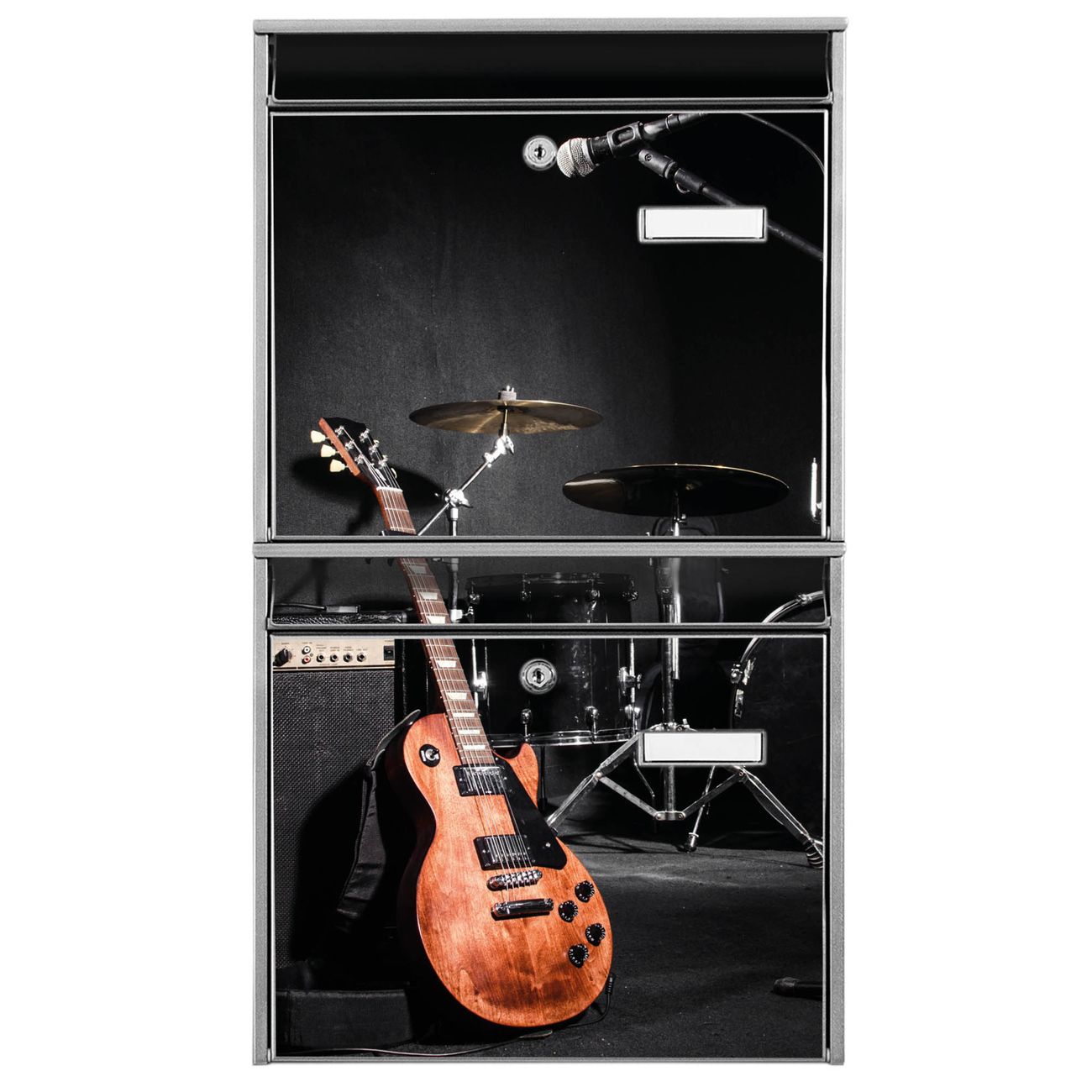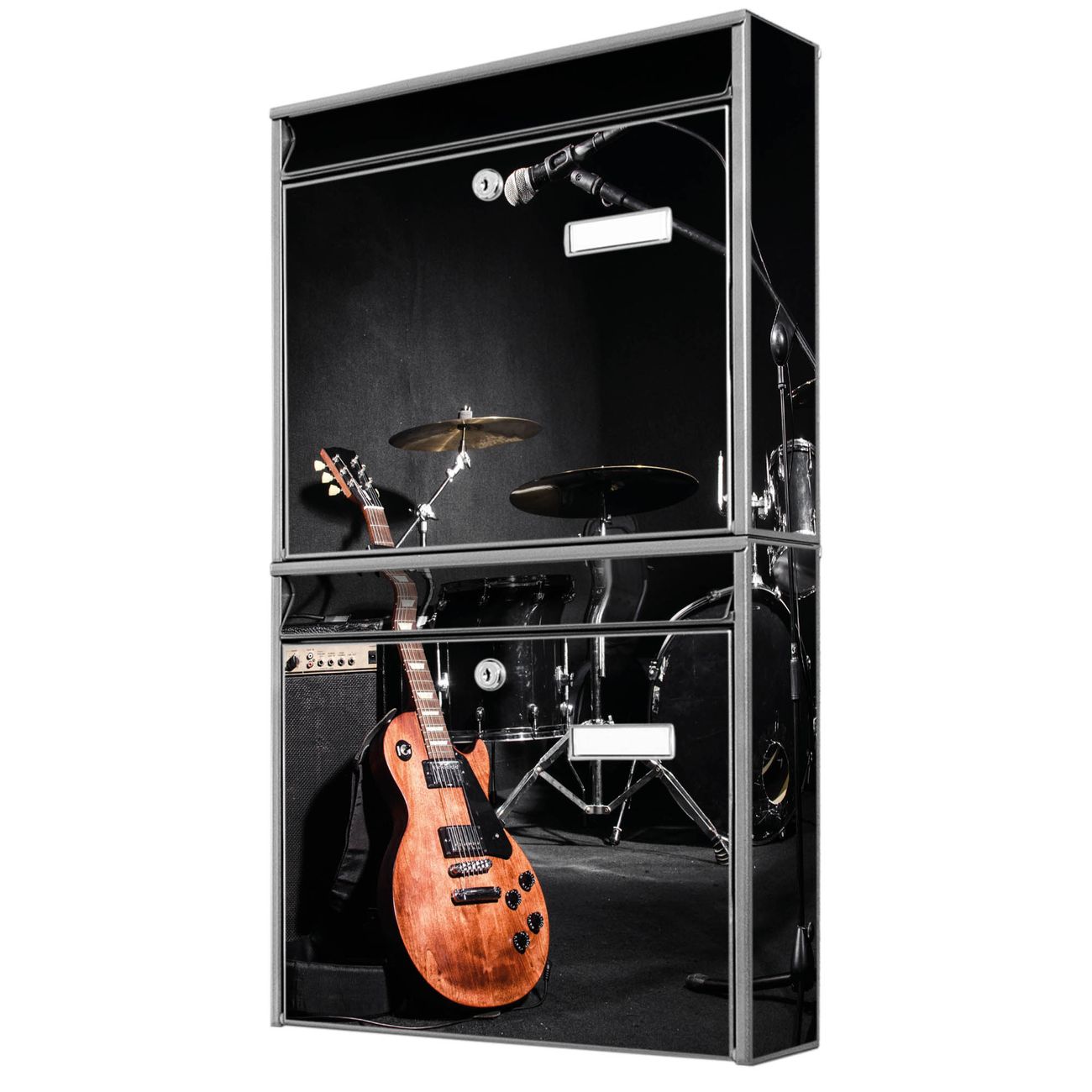 FUNKTION: Die Burg-Wächter Briefkastenanlage mit Motiv Jam Session bietet Ihnen ausreichend Fassungsvermögen um auch A4 und C4 Sendungen zu empfangen. Das integrierte Namensschild lässt sich individuell beschriften. Wählen Sie aus den Grundfarben weiß, silber und schwarz. DESIGN: Die 2 Briefkästen haben ein ansprechendes und zeitloses Design, ohne dabei auf Funktionalität zu verzichten. Das Material ist sehr stabil, wetterfest und rostfrei. Durch das Motiv Jam Session werden die Postkästen zu einem Blickfang. DETAILS: Die Postkästen bestehen aus verzinktem Stahl der zusätzlich mit Klarlack versiegelt wurde. Die Kästen sind gesamt 64,5cm hoch, 36,2cm breit und 10cm tief. Das Motiv besteht aus einer wetter- und UV-festen Folie, die Ihren Briefkasten zusätzlich vor Kratzern schützt. Die Postkästen werden mit Montagematerial, je einem Namensschild und je zwei Schlüsseln geliefert. NUTZEN: Das Briefkastenset eignet sich für die Wandmontage, die Größe bietet genügend Platz für Sendungen aller Art. Das zeitlose Design sowie die stabile Bauart bieten Ihnen einen treuen Begleiter für Ihre Post. BANJADO: