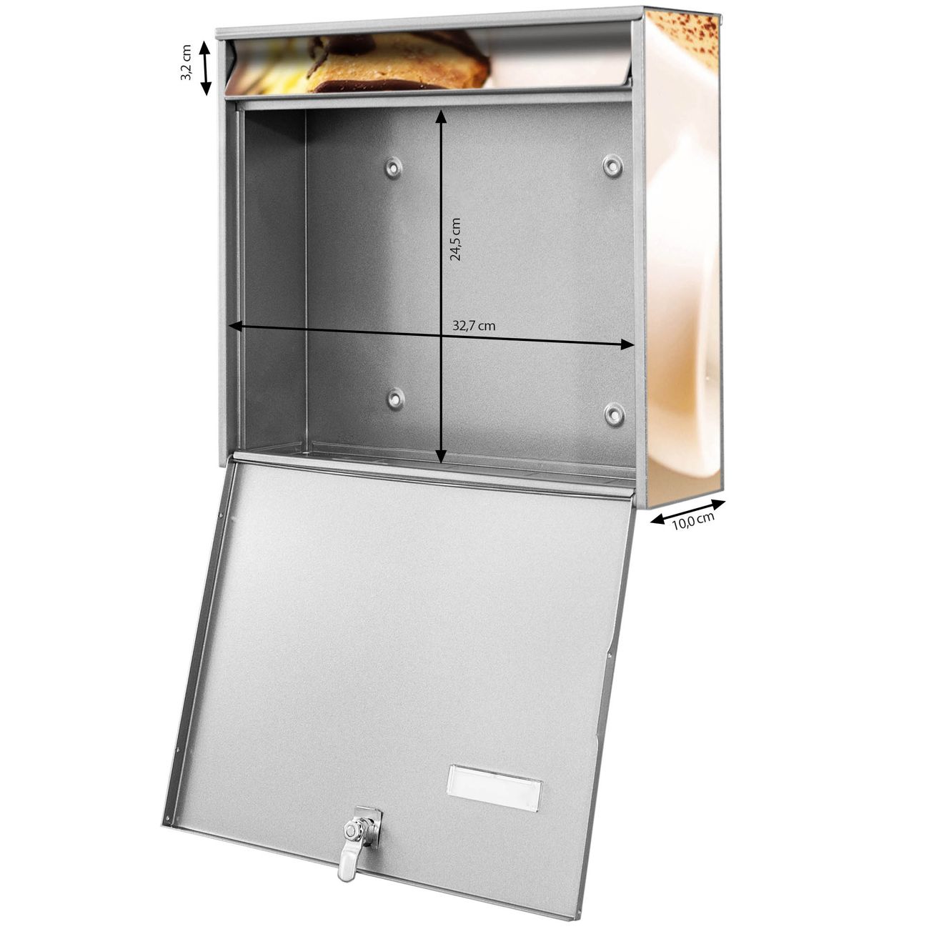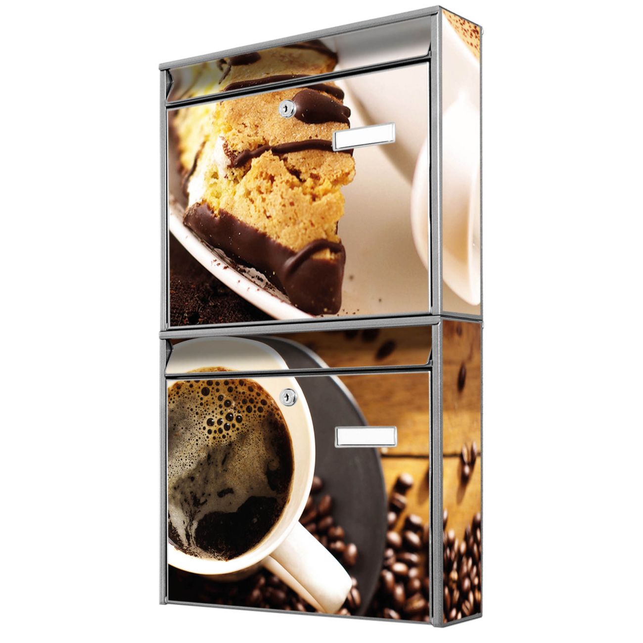 FUNKTION: Die Burg-Wächter Briefkastenanlage mit Motiv Kaffee&Schokolade bietet Ihnen ausreichend Fassungsvermögen um auch A4 und C4 Sendungen zu empfangen. Das integrierte Namensschild lässt sich individuell beschriften. Wählen Sie aus den Grundfarben weiß, silber und schwarz. DESIGN: Die 2 Briefkästen haben ein ansprechendes und zeitloses Design, ohne dabei auf Funktionalität zu verzichten. Das Material ist sehr stabil, wetterfest und rostfrei. Durch das Motiv Kaffee&Schokolade werden die Postkästen zu einem Blickfang. DETAILS: Die Postkästen bestehen aus verzinktem Stahl der zusätzlich mit Klarlack versiegelt wurde. Die Kästen sind gesamt 64,5cm hoch, 36,2cm breit und 10cm tief. Das Motiv besteht aus einer wetter- und UV-festen Folie, die Ihren Briefkasten zusätzlich vor Kratzern schützt. Die Postkästen werden mit Montagematerial, je einem Namensschild und je zwei Schlüsseln geliefert. NUTZEN: Das Briefkastenset eignet sich für die Wandmontage, die Größe bietet genügend Platz für Sendungen aller Art. Das zeitlose Design sowie die stabile Bauart bieten Ihnen einen treuen Begleiter für Ihre Post. BANJADO: