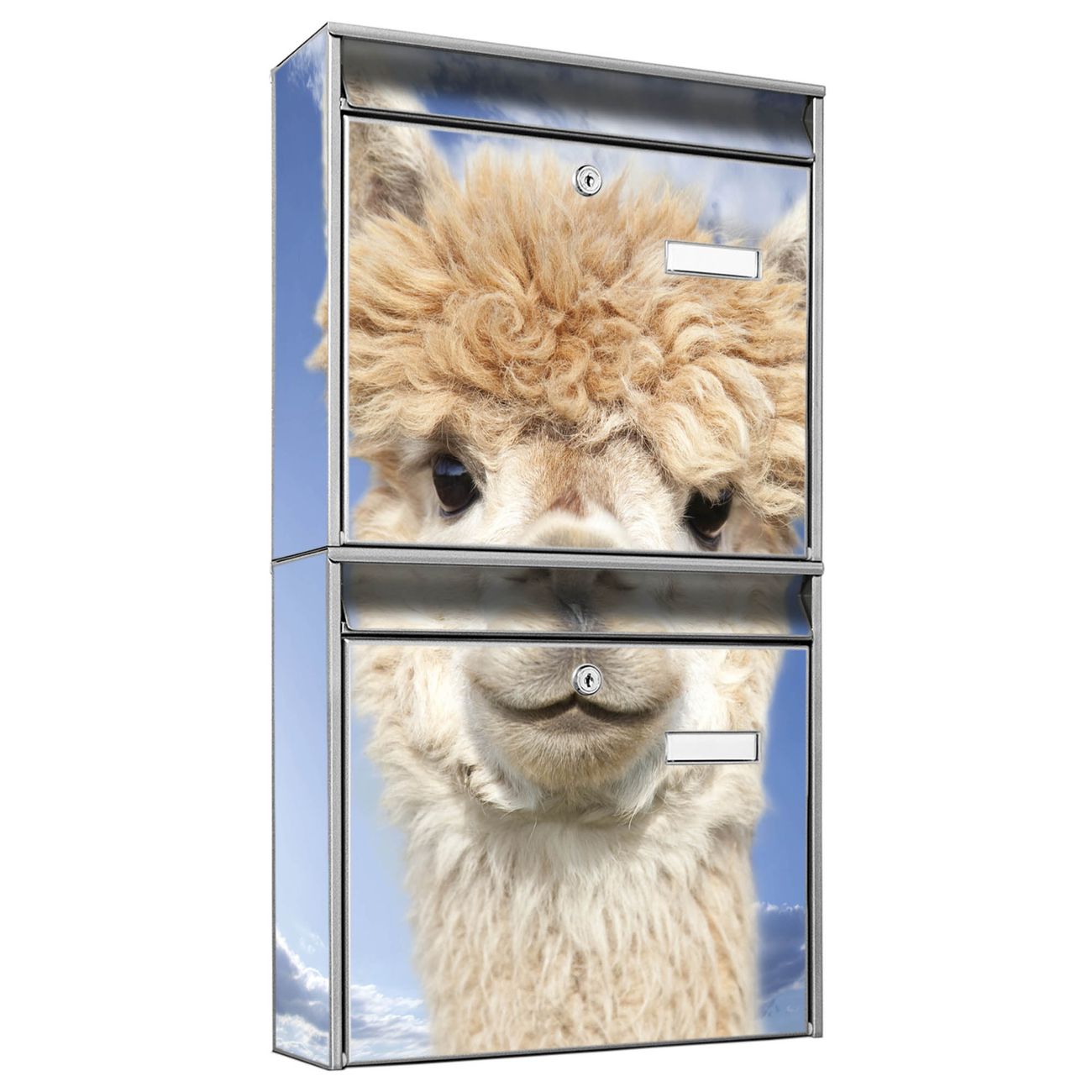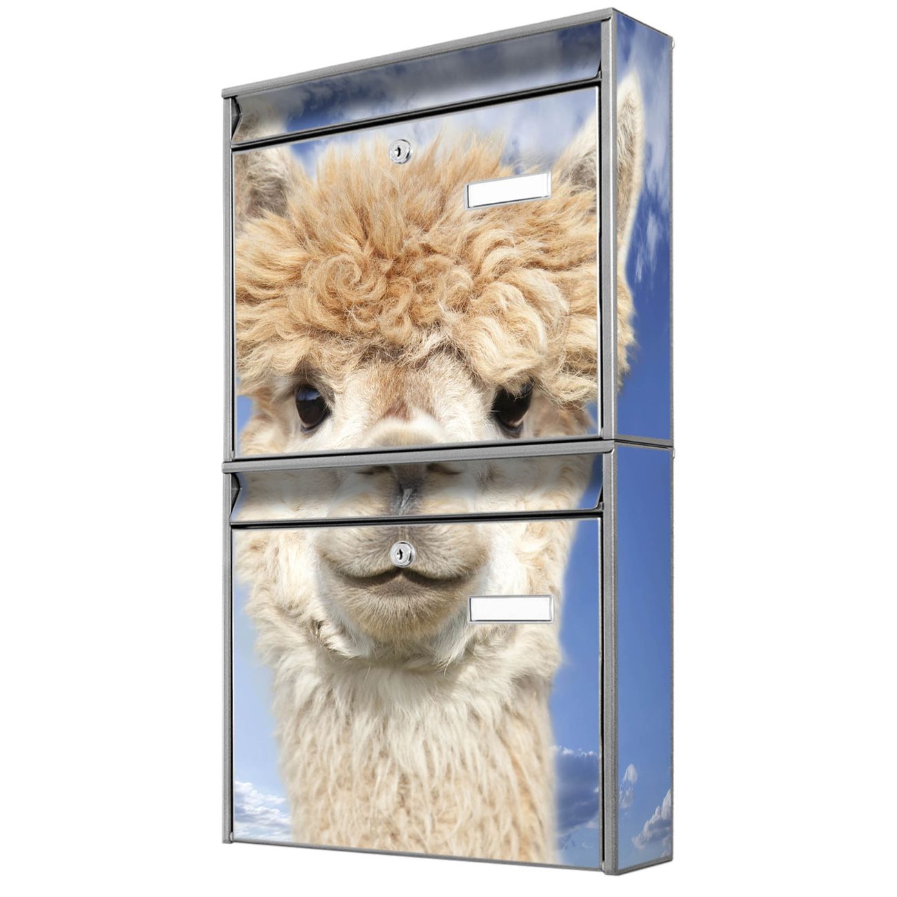 FUNKTION: Die Burg-Wächter Briefkastenanlage mit Motiv Lama bietet Ihnen ausreichend Fassungsvermögen um auch A4 und C4 Sendungen zu empfangen. Das integrierte Namensschild lässt sich individuell beschriften. Wählen Sie aus den Grundfarben weiß, silber und schwarz. DESIGN: Die 2 Briefkästen haben ein ansprechendes und zeitloses Design, ohne dabei auf Funktionalität zu verzichten. Das Material ist sehr stabil, wetterfest und rostfrei. Durch das Motiv Lama werden die Postkästen zu einem Blickfang. DETAILS: Die Postkästen bestehen aus verzinktem Stahl der zusätzlich mit Klarlack versiegelt wurde. Die Kästen sind gesamt 64,5cm hoch, 36,2cm breit und 10cm tief. Das Motiv besteht aus einer wetter- und UV-festen Folie, die Ihren Briefkasten zusätzlich vor Kratzern schützt. Die Postkästen werden mit Montagematerial, je einem Namensschild und je zwei Schlüsseln geliefert. NUTZEN: Das Briefkastenset eignet sich für die Wandmontage, die Größe bietet genügend Platz für Sendungen aller Art. Das zeitlose Design sowie die stabile Bauart bieten Ihnen einen treuen Begleiter für Ihre Post. BANJADO: