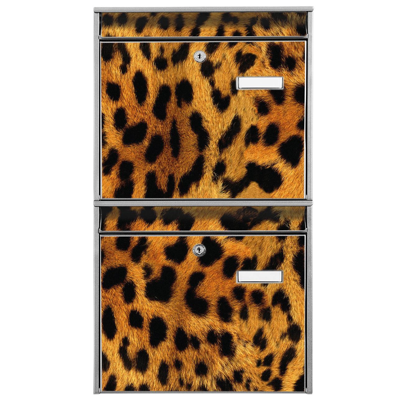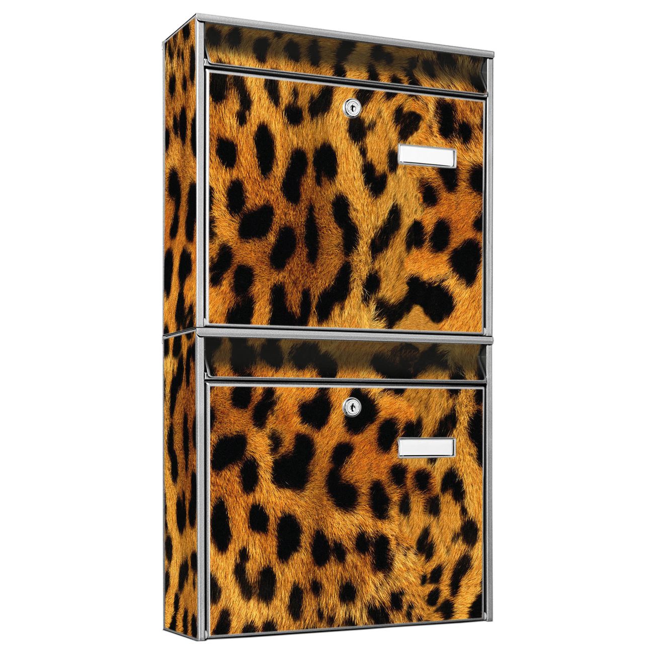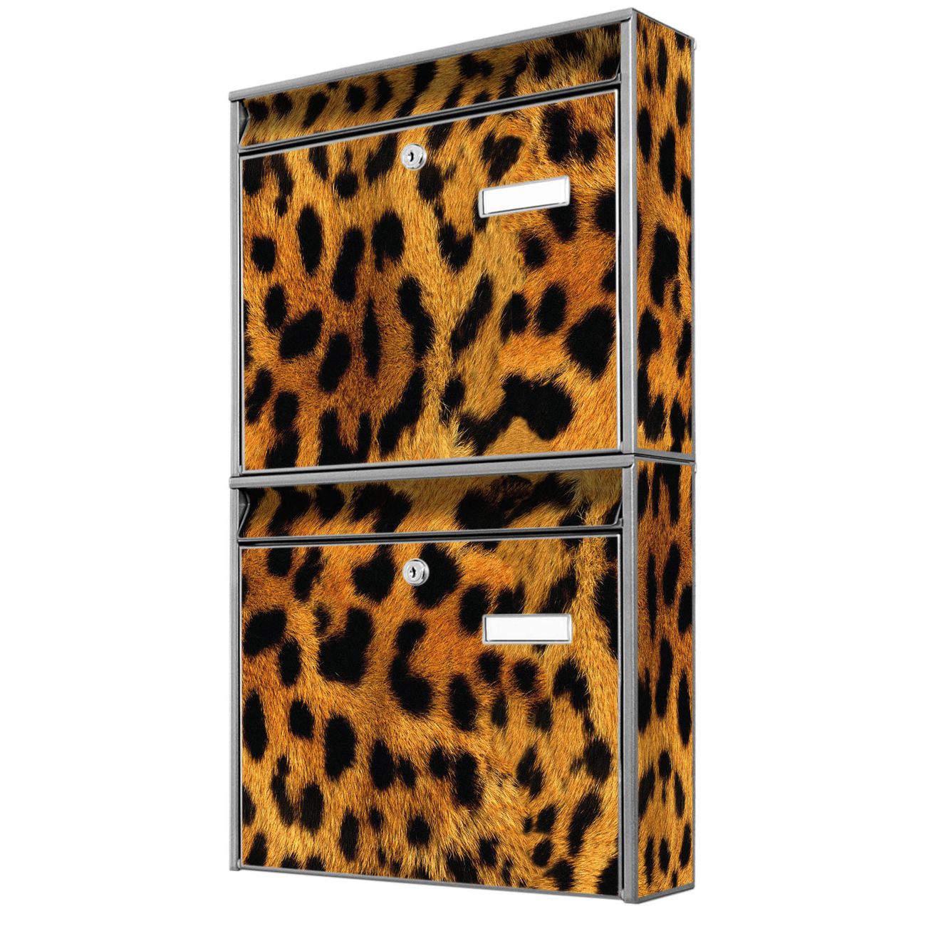 FUNKTION: Die Burg-Wächter Briefkastenanlage mit Motiv Leopard bietet Ihnen ausreichend Fassungsvermögen um auch A4 und C4 Sendungen zu empfangen. Das integrierte Namensschild lässt sich individuell beschriften. Wählen Sie aus den Grundfarben weiß, silber und schwarz. DESIGN: Die 2 Briefkästen haben ein ansprechendes und zeitloses Design, ohne dabei auf Funktionalität zu verzichten. Das Material ist sehr stabil, wetterfest und rostfrei. Durch das Motiv Leopard werden die Postkästen zu einem Blickfang. DETAILS: Die Postkästen bestehen aus verzinktem Stahl der zusätzlich mit Klarlack versiegelt wurde. Die Kästen sind gesamt 64,5cm hoch, 36,2cm breit und 10cm tief. Das Motiv besteht aus einer wetter- und UV-festen Folie, die Ihren Briefkasten zusätzlich vor Kratzern schützt. Die Postkästen werden mit Montagematerial, je einem Namensschild und je zwei Schlüsseln geliefert. NUTZEN: Das Briefkastenset eignet sich für die Wandmontage, die Größe bietet genügend Platz für Sendungen aller Art. Das zeitlose Design sowie die stabile Bauart bieten Ihnen einen treuen Begleiter für Ihre Post. BANJADO: