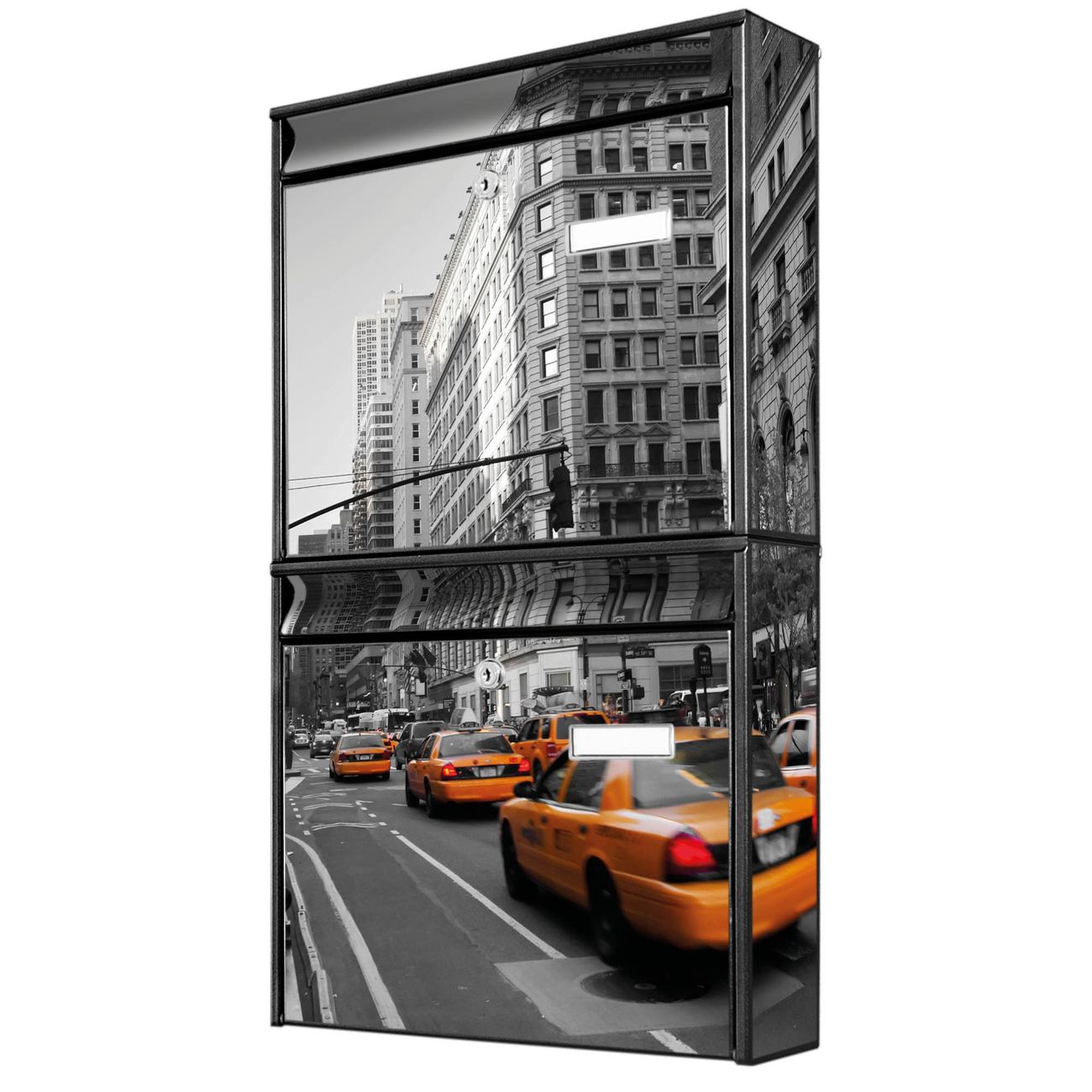 FUNKTION: Die Burg-Wächter Briefkastenanlage mit Motiv New York Taxi bietet Ihnen ausreichend Fassungsvermögen um auch A4 und C4 Sendungen zu empfangen. Das integrierte Namensschild lässt sich individuell beschriften. Wählen Sie aus den Grundfarben weiß, silber und schwarz. DESIGN: Die 2 Briefkästen haben ein ansprechendes und zeitloses Design, ohne dabei auf Funktionalität zu verzichten. Das Material ist sehr stabil, wetterfest und rostfrei. Durch das Motiv New York Taxi werden die Postkästen zu einem Blickfang. DETAILS: Die Postkästen bestehen aus verzinktem Stahl der zusätzlich mit Klarlack versiegelt wurde. Die Kästen sind gesamt 64,5cm hoch, 36,2cm breit und 10cm tief. Das Motiv besteht aus einer wetter- und UV-festen Folie, die Ihren Briefkasten zusätzlich vor Kratzern schützt. Die Postkästen werden mit Montagematerial, je einem Namensschild und je zwei Schlüsseln geliefert. NUTZEN: Das Briefkastenset eignet sich für die Wandmontage, die Größe bietet genügend Platz für Sendungen aller Art. Das zeitlose Design sowie die stabile Bauart bieten Ihnen einen treuen Begleiter für Ihre Post. BANJADO: