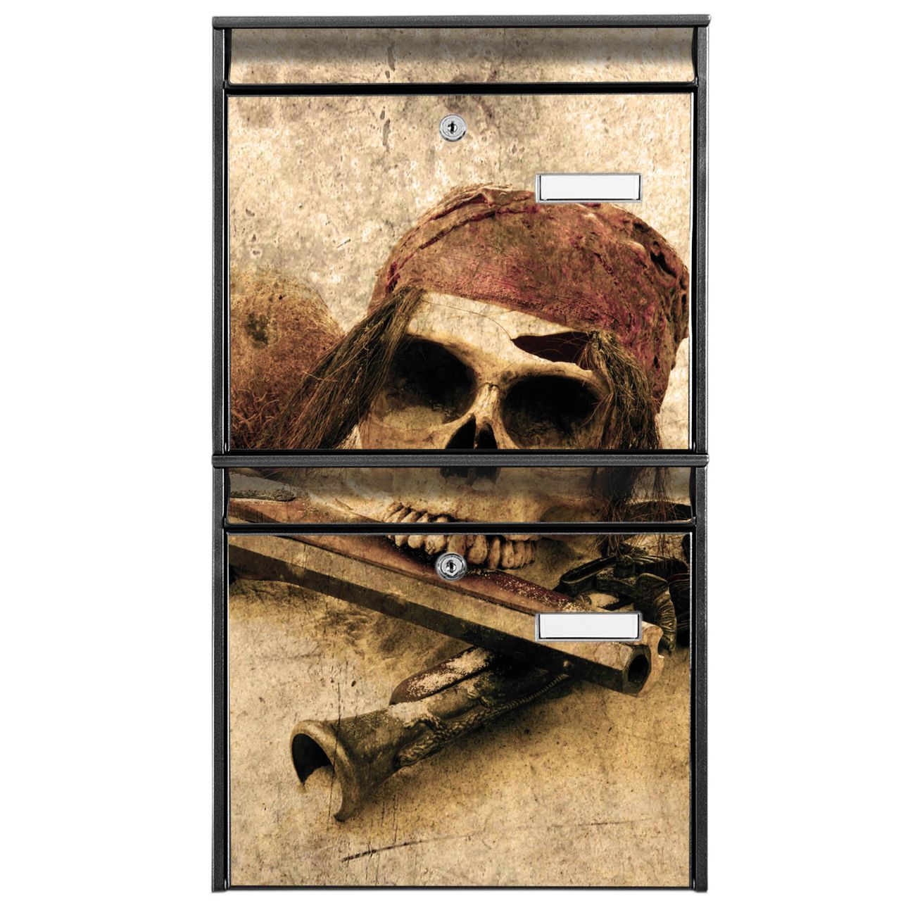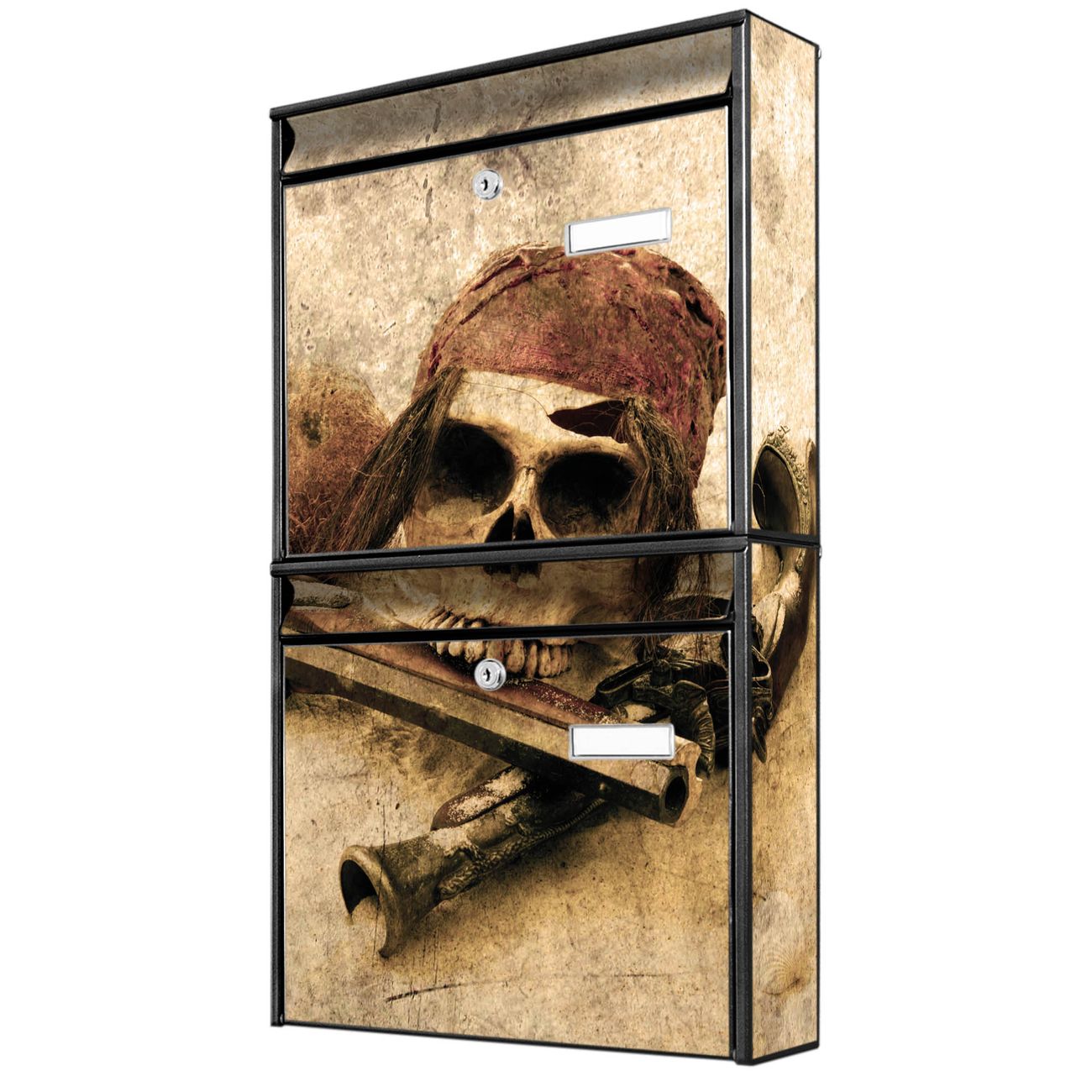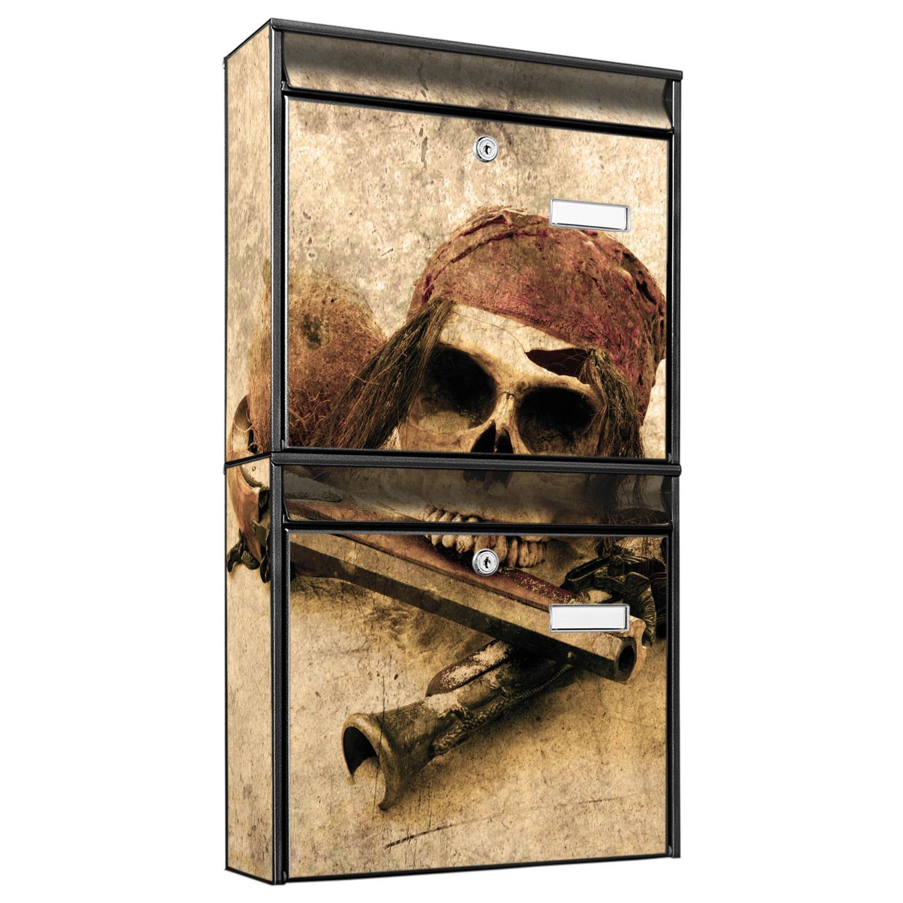 FUNKTION: Die Burg-Wächter Briefkastenanlage mit Motiv Pirat bietet Ihnen ausreichend Fassungsvermögen um auch A4 und C4 Sendungen zu empfangen. Das integrierte Namensschild lässt sich individuell beschriften. Wählen Sie aus den Grundfarben weiß, silber und schwarz. DESIGN: Die 2 Briefkästen haben ein ansprechendes und zeitloses Design, ohne dabei auf Funktionalität zu verzichten. Das Material ist sehr stabil, wetterfest und rostfrei. Durch das Motiv Pirat werden die Postkästen zu einem Blickfang. DETAILS: Die Postkästen bestehen aus verzinktem Stahl der zusätzlich mit Klarlack versiegelt wurde. Die Kästen sind gesamt 64,5cm hoch, 36,2cm breit und 10cm tief. Das Motiv besteht aus einer wetter- und UV-festen Folie, die Ihren Briefkasten zusätzlich vor Kratzern schützt. Die Postkästen werden mit Montagematerial, je einem Namensschild und je zwei Schlüsseln geliefert. NUTZEN: Das Briefkastenset eignet sich für die Wandmontage, die Größe bietet genügend Platz für Sendungen aller Art. Das zeitlose Design sowie die stabile Bauart bieten Ihnen einen treuen Begleiter für Ihre Post. BANJADO: