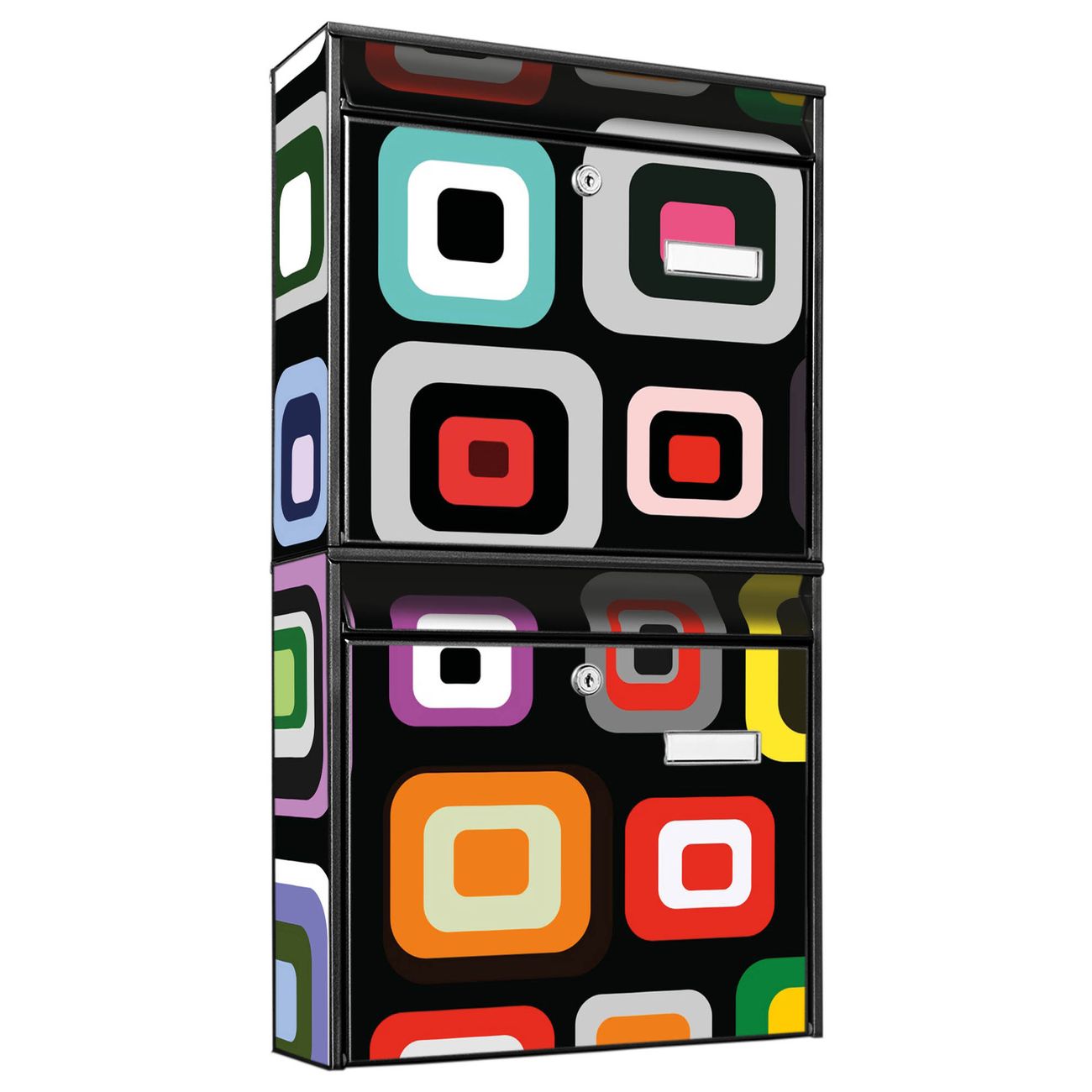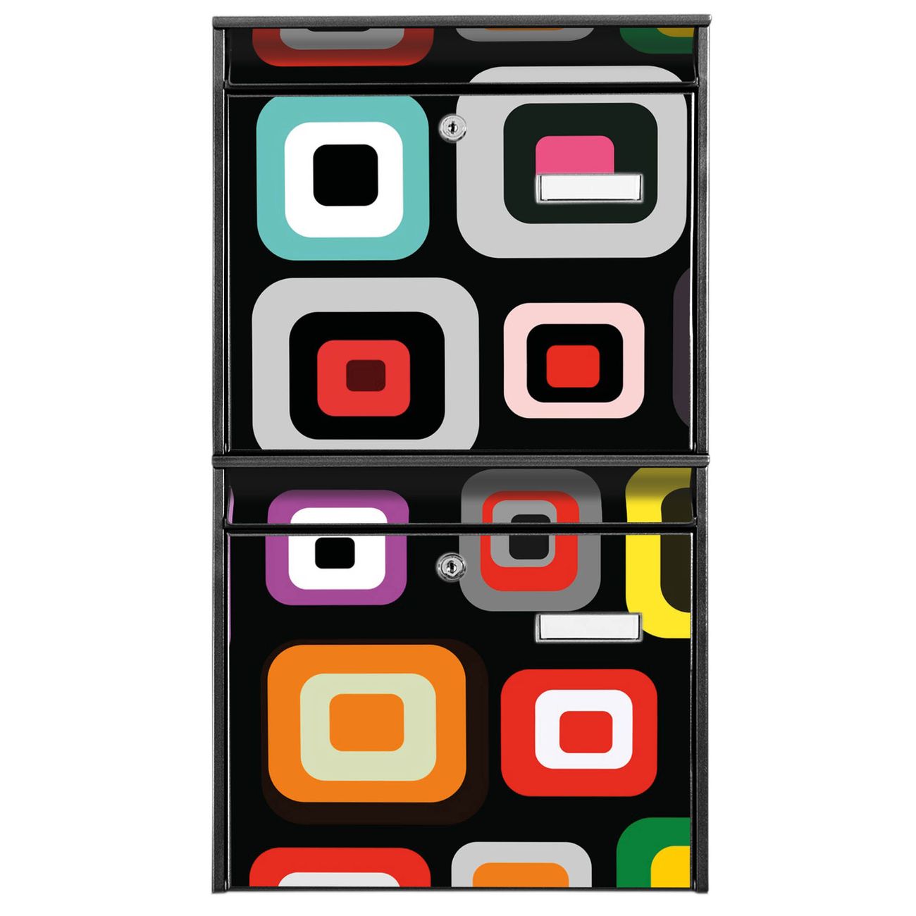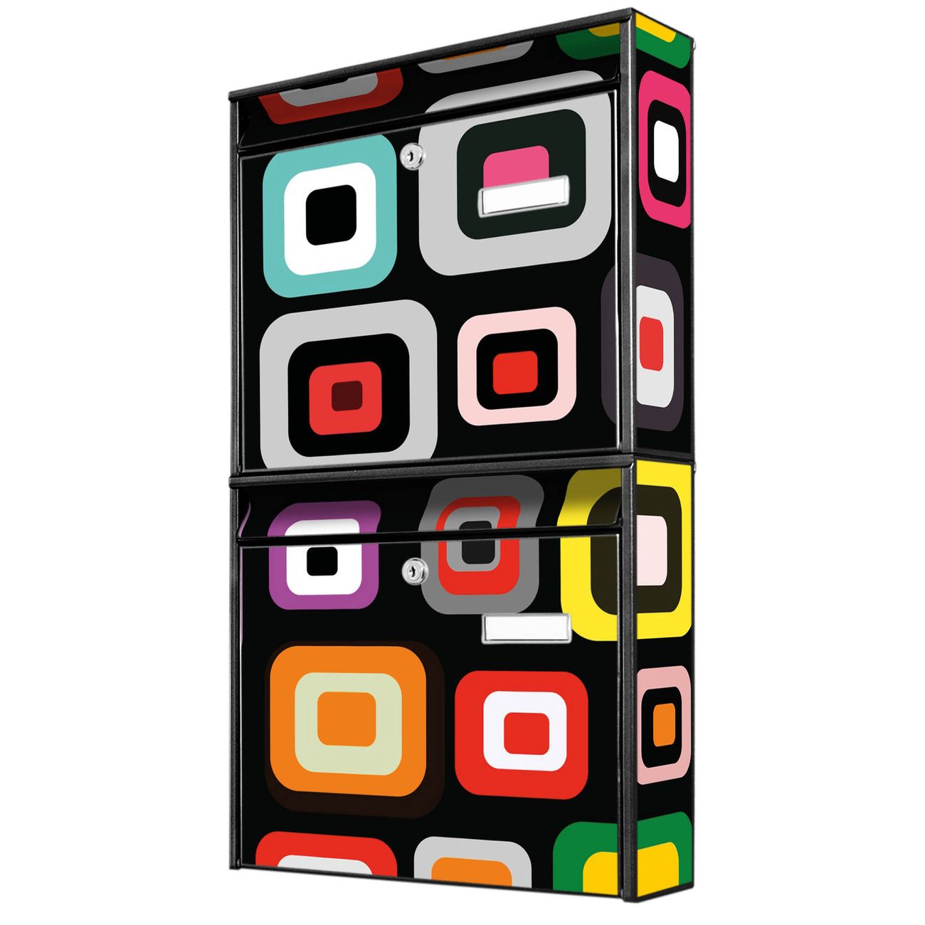 FUNKTION: Die Burg-Wächter Briefkastenanlage mit Motiv Retro bietet Ihnen ausreichend Fassungsvermögen um auch A4 und C4 Sendungen zu empfangen. Das integrierte Namensschild lässt sich individuell beschriften. Wählen Sie aus den Grundfarben weiß, silber und schwarz. DESIGN: Die 2 Briefkästen haben ein ansprechendes und zeitloses Design, ohne dabei auf Funktionalität zu verzichten. Das Material ist sehr stabil, wetterfest und rostfrei. Durch das Motiv Retro werden die Postkästen zu einem Blickfang. DETAILS: Die Postkästen bestehen aus verzinktem Stahl der zusätzlich mit Klarlack versiegelt wurde. Die Kästen sind gesamt 64,5cm hoch, 36,2cm breit und 10cm tief. Das Motiv besteht aus einer wetter- und UV-festen Folie, die Ihren Briefkasten zusätzlich vor Kratzern schützt. Die Postkästen werden mit Montagematerial, je einem Namensschild und je zwei Schlüsseln geliefert. NUTZEN: Das Briefkastenset eignet sich für die Wandmontage, die Größe bietet genügend Platz für Sendungen aller Art. Das zeitlose Design sowie die stabile Bauart bieten Ihnen einen treuen Begleiter für Ihre Post. BANJADO: