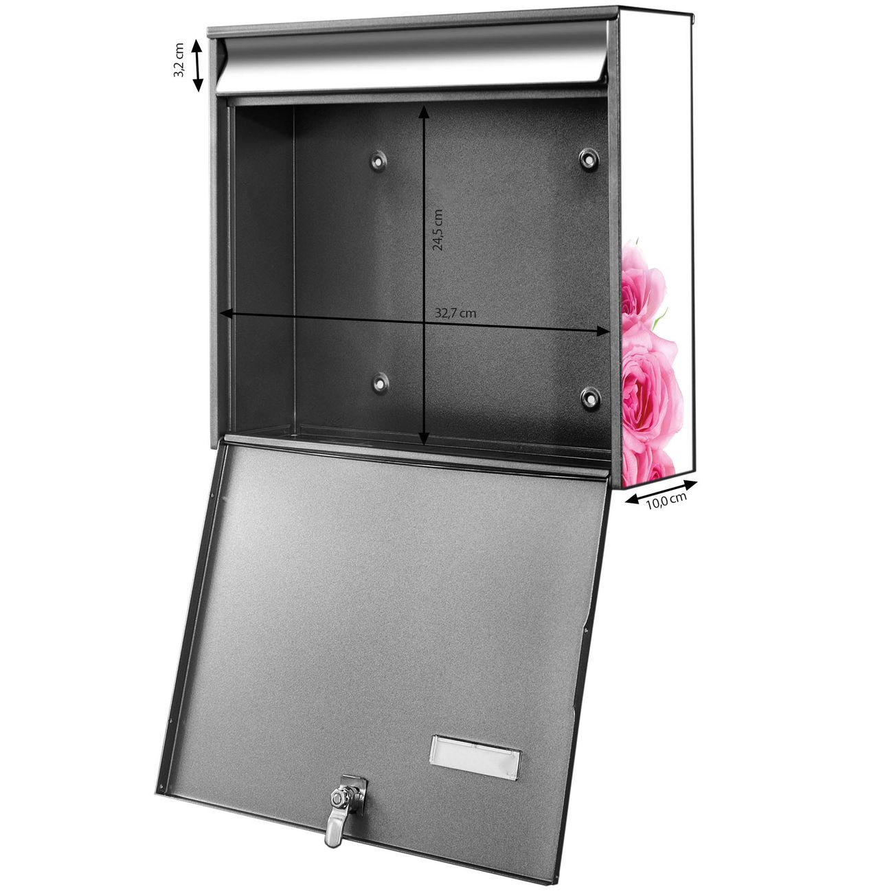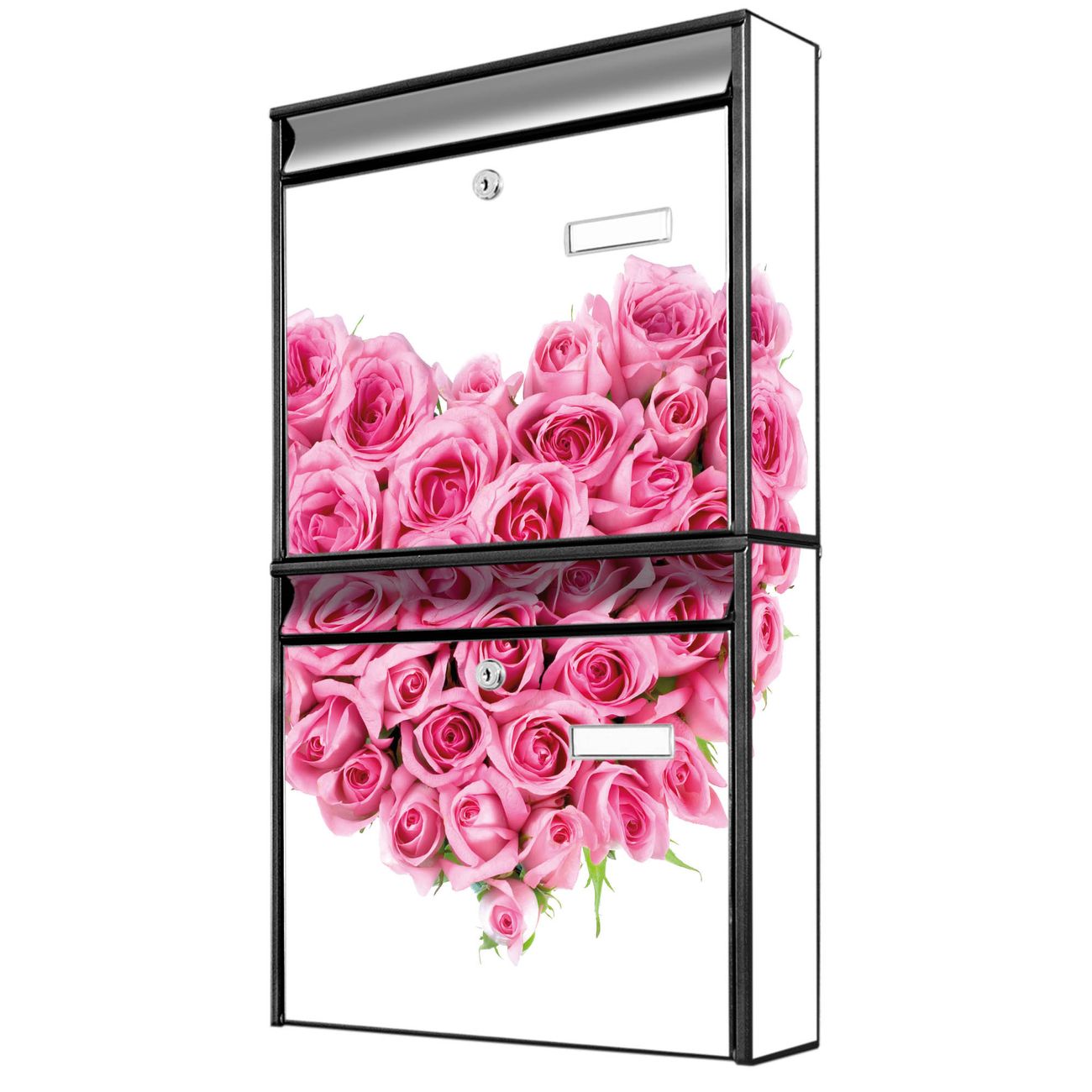 FUNKTION: Die Burg-Wächter Briefkastenanlage mit Motiv Rosenherz bietet Ihnen ausreichend Fassungsvermögen um auch A4 und C4 Sendungen zu empfangen. Das integrierte Namensschild lässt sich individuell beschriften. Wählen Sie aus den Grundfarben weiß, silber und schwarz. DESIGN: Die 2 Briefkästen haben ein ansprechendes und zeitloses Design, ohne dabei auf Funktionalität zu verzichten. Das Material ist sehr stabil, wetterfest und rostfrei. Durch das Motiv Rosenherz werden die Postkästen zu einem Blickfang. DETAILS: Die Postkästen bestehen aus verzinktem Stahl der zusätzlich mit Klarlack versiegelt wurde. Die Kästen sind gesamt 64,5cm hoch, 36,2cm breit und 10cm tief. Das Motiv besteht aus einer wetter- und UV-festen Folie, die Ihren Briefkasten zusätzlich vor Kratzern schützt. Die Postkästen werden mit Montagematerial, je einem Namensschild und je zwei Schlüsseln geliefert. NUTZEN: Das Briefkastenset eignet sich für die Wandmontage, die Größe bietet genügend Platz für Sendungen aller Art. Das zeitlose Design sowie die stabile Bauart bieten Ihnen einen treuen Begleiter für Ihre Post. BANJADO: