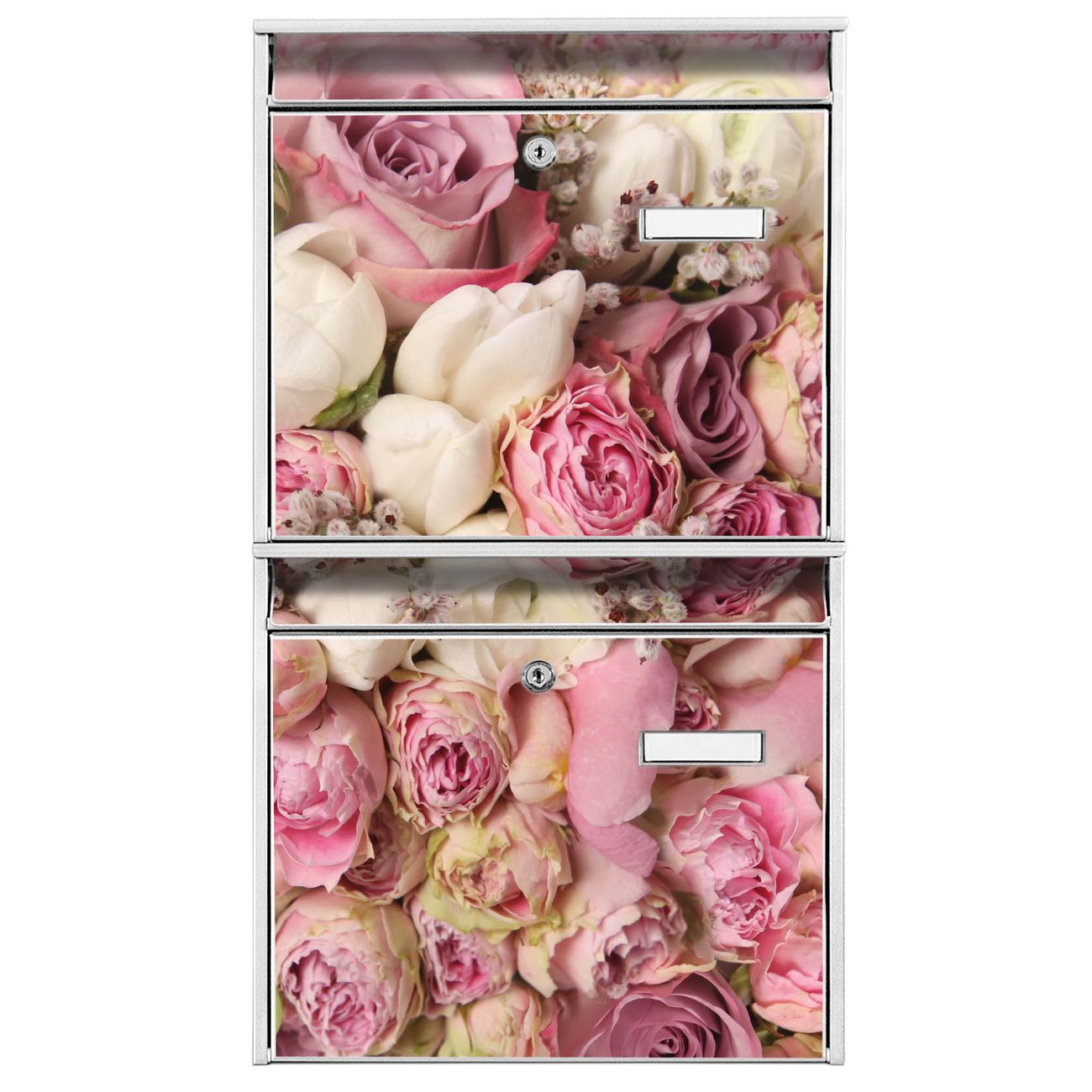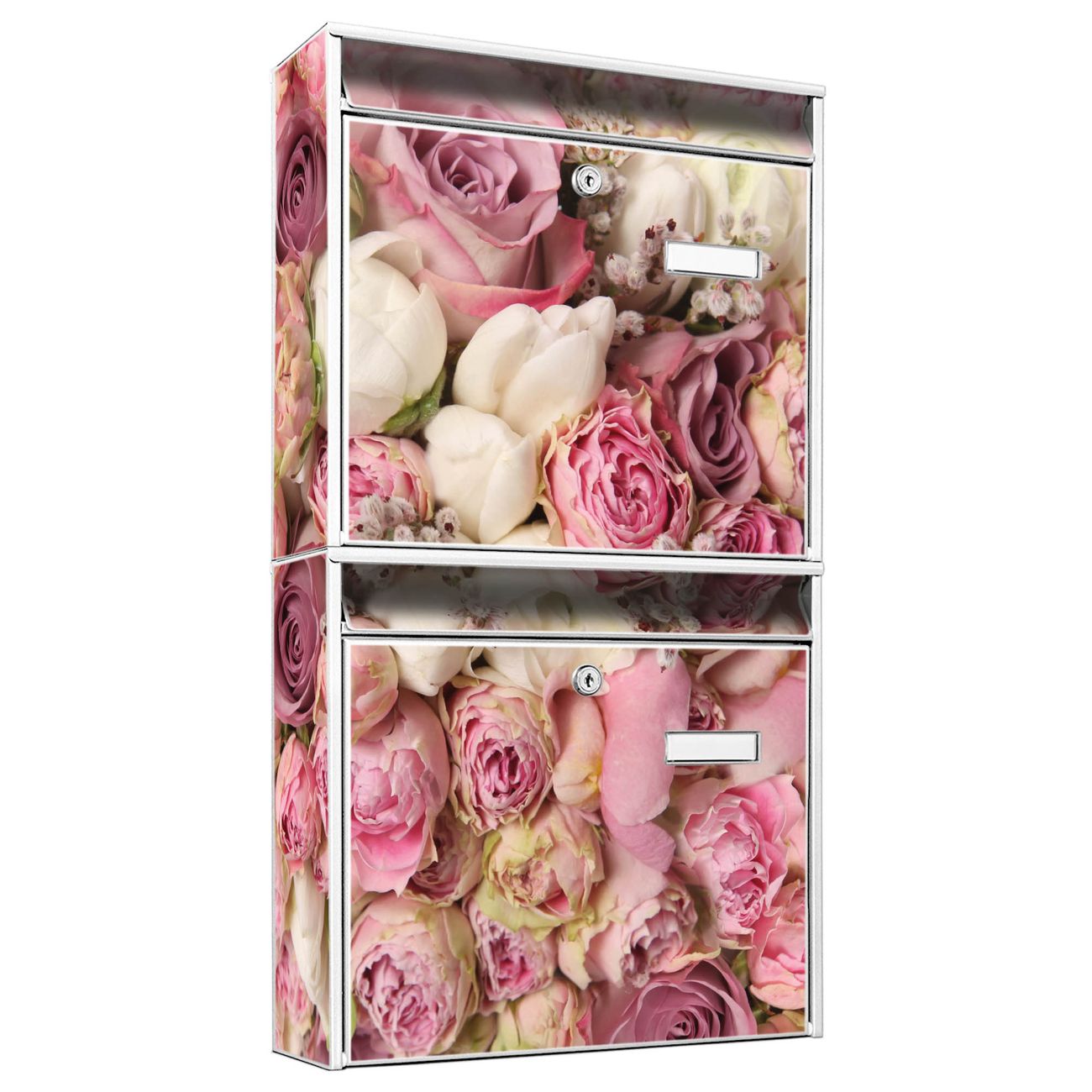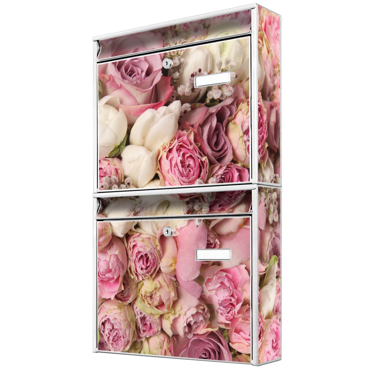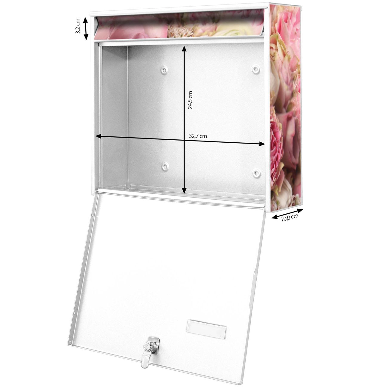 FUNKTION: Die Burg-Wächter Briefkastenanlage mit Motiv Strauss Rosen bietet Ihnen ausreichend Fassungsvermögen um auch A4 und C4 Sendungen zu empfangen. Das integrierte Namensschild lässt sich individuell beschriften. Wählen Sie aus den Grundfarben weiß, silber und schwarz. DESIGN: Die 2 Briefkästen haben ein ansprechendes und zeitloses Design, ohne dabei auf Funktionalität zu verzichten. Das Material ist sehr stabil, wetterfest und rostfrei. Durch das Motiv Strauss Rosen werden die Postkästen zu einem Blickfang. DETAILS: Die Postkästen bestehen aus verzinktem Stahl der zusätzlich mit Klarlack versiegelt wurde. Die Kästen sind gesamt 64,5cm hoch, 36,2cm breit und 10cm tief. Das Motiv besteht aus einer wetter- und UV-festen Folie, die Ihren Briefkasten zusätzlich vor Kratzern schützt. Die Postkästen werden mit Montagematerial, je einem Namensschild und je zwei Schlüsseln geliefert. NUTZEN: Das Briefkastenset eignet sich für die Wandmontage, die Größe bietet genügend Platz für Sendungen aller Art. Das zeitlose Design sowie die stabile Bauart bieten Ihnen einen treuen Begleiter für Ihre Post. BANJADO: