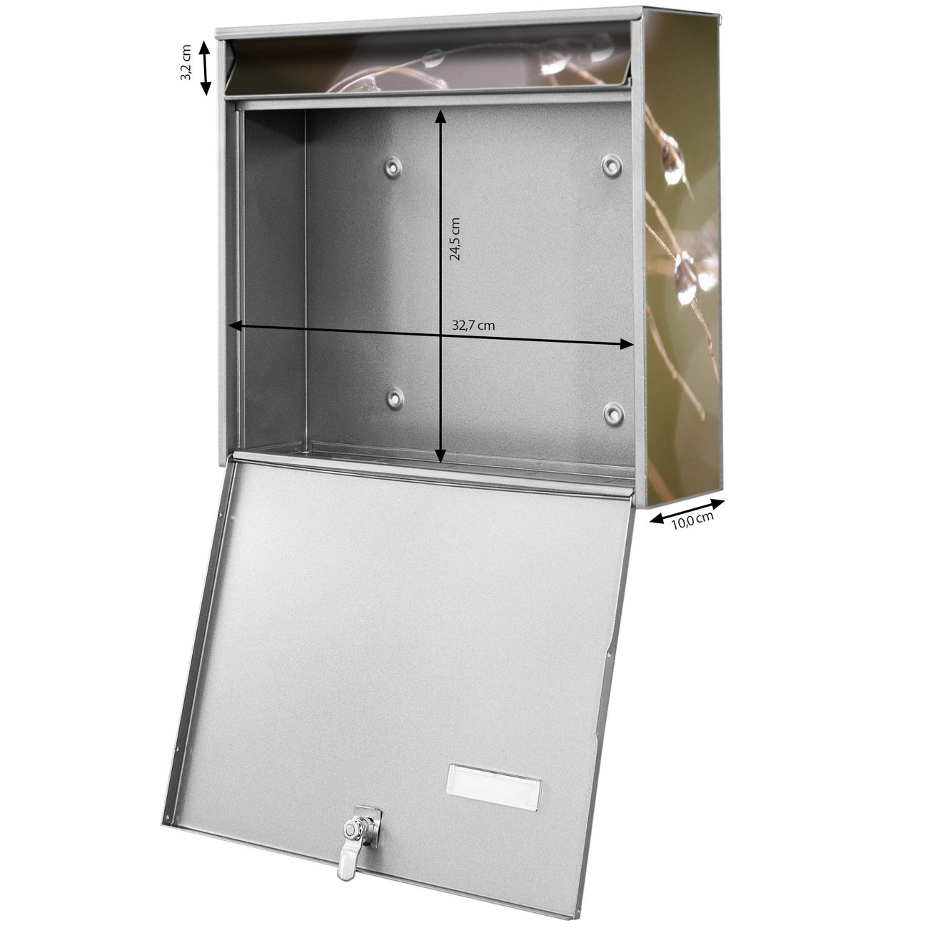 FUNKTION: Die Burg-Wächter Briefkastenanlage mit Motiv Tau Auf Zweigen bietet Ihnen ausreichend Fassungsvermögen um auch A4 und C4 Sendungen zu empfangen. Das integrierte Namensschild lässt sich individuell beschriften. Wählen Sie aus den Grundfarben weiß, silber und schwarz. DESIGN: Die 2 Briefkästen haben ein ansprechendes und zeitloses Design, ohne dabei auf Funktionalität zu verzichten. Das Material ist sehr stabil, wetterfest und rostfrei. Durch das Motiv Tau Auf Zweigen werden die Postkästen zu einem Blickfang. DETAILS: Die Postkästen bestehen aus verzinktem Stahl der zusätzlich mit Klarlack versiegelt wurde. Die Kästen sind gesamt 64,5cm hoch, 36,2cm breit und 10cm tief. Das Motiv besteht aus einer wetter- und UV-festen Folie, die Ihren Briefkasten zusätzlich vor Kratzern schützt. Die Postkästen werden mit Montagematerial, je einem Namensschild und je zwei Schlüsseln geliefert. NUTZEN: Das Briefkastenset eignet sich für die Wandmontage, die Größe bietet genügend Platz für Sendungen aller Art. Das zeitlose Design sowie die stabile Bauart bieten Ihnen einen treuen Begleiter für Ihre Post. BANJADO: