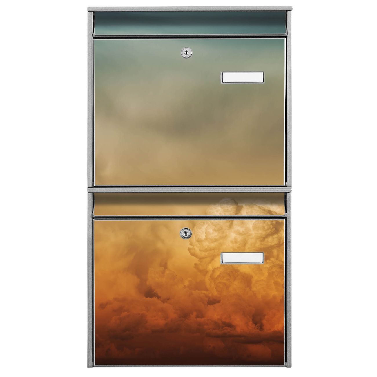 FUNKTION: Die Burg-Wächter Briefkastenanlage mit Motiv Wolken in der Dämmerung bietet Ihnen ausreichend Fassungsvermögen um auch A4 und C4 Sendungen zu empfangen. Das integrierte Namensschild lässt sich individuell beschriften. Wählen Sie aus den Grundfarben weiß, silber und schwarz. DESIGN: Die 2 Briefkästen haben ein ansprechendes und zeitloses Design, ohne dabei auf Funktionalität zu verzichten. Das Material ist sehr stabil, wetterfest und rostfrei. Durch das Motiv Wolken in der Dämmerung werden die Postkästen zu einem Blickfang. DETAILS: Die Postkästen bestehen aus verzinktem Stahl der zusätzlich mit Klarlack versiegelt wurde. Die Kästen sind gesamt 64,5cm hoch, 36,2cm breit und 10cm tief. Das Motiv besteht aus einer wetter- und UV-festen Folie, die Ihren Briefkasten zusätzlich vor Kratzern schützt. Die Postkästen werden mit Montagematerial, je einem Namensschild und je zwei Schlüsseln geliefert. NUTZEN: Das Briefkastenset eignet sich für die Wandmontage, die Größe bietet genügend Platz für Sendungen aller Art. Das zeitlose Design sowie die stabile Bauart bieten Ihnen einen treuen Begleiter für Ihre Post. BANJADO: