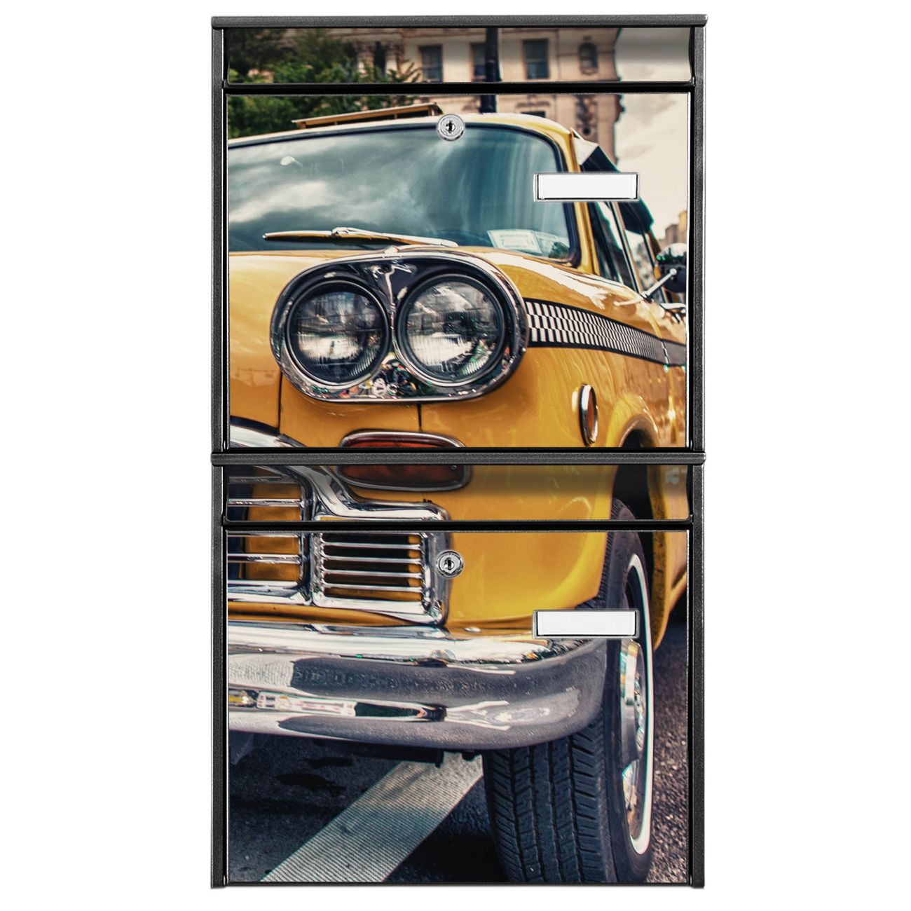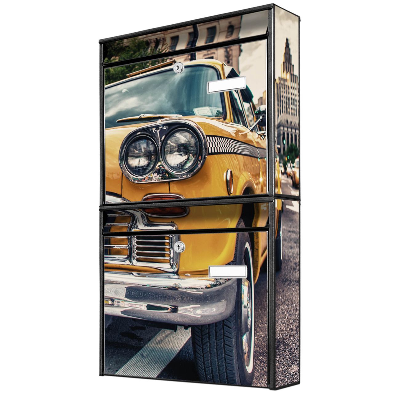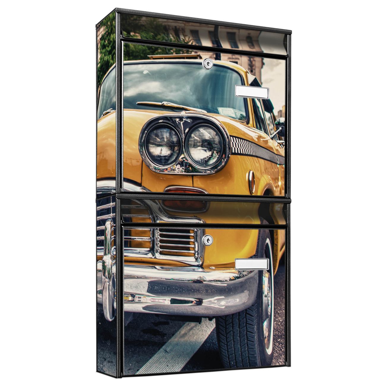 FUNKTION: Die Burg-Wächter Briefkastenanlage mit Motiv Yellow Cab bietet Ihnen ausreichend Fassungsvermögen um auch A4 und C4 Sendungen zu empfangen. Das integrierte Namensschild lässt sich individuell beschriften. Wählen Sie aus den Grundfarben weiß, silber und schwarz. DESIGN: Die 2 Briefkästen haben ein ansprechendes und zeitloses Design, ohne dabei auf Funktionalität zu verzichten. Das Material ist sehr stabil, wetterfest und rostfrei. Durch das Motiv Yellow Cab werden die Postkästen zu einem Blickfang. DETAILS: Die Postkästen bestehen aus verzinktem Stahl der zusätzlich mit Klarlack versiegelt wurde. Die Kästen sind gesamt 64,5cm hoch, 36,2cm breit und 10cm tief. Das Motiv besteht aus einer wetter- und UV-festen Folie, die Ihren Briefkasten zusätzlich vor Kratzern schützt. Die Postkästen werden mit Montagematerial, je einem Namensschild und je zwei Schlüsseln geliefert. NUTZEN: Das Briefkastenset eignet sich für die Wandmontage, die Größe bietet genügend Platz für Sendungen aller Art. Das zeitlose Design sowie die stabile Bauart bieten Ihnen einen treuen Begleiter für Ihre Post. BANJADO: