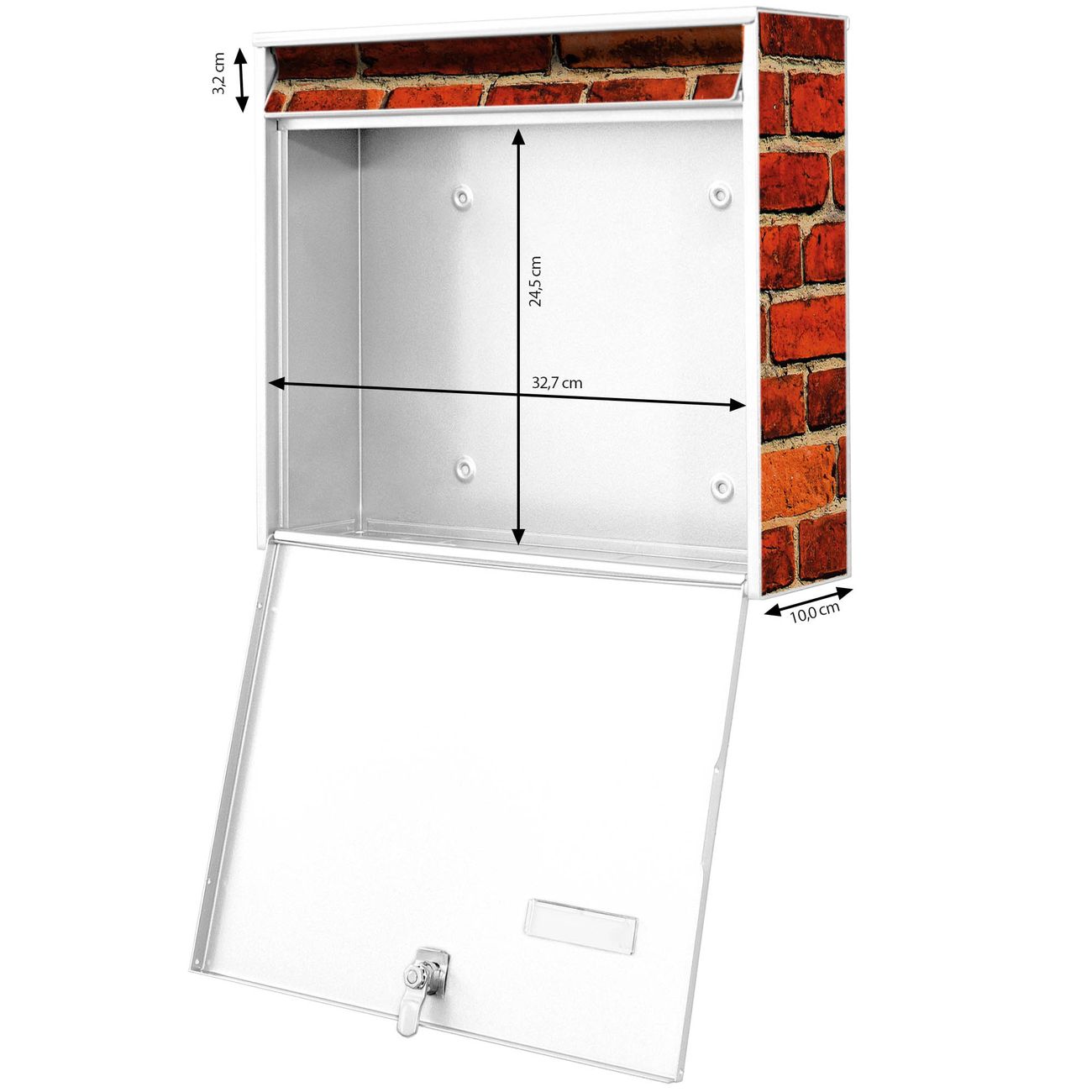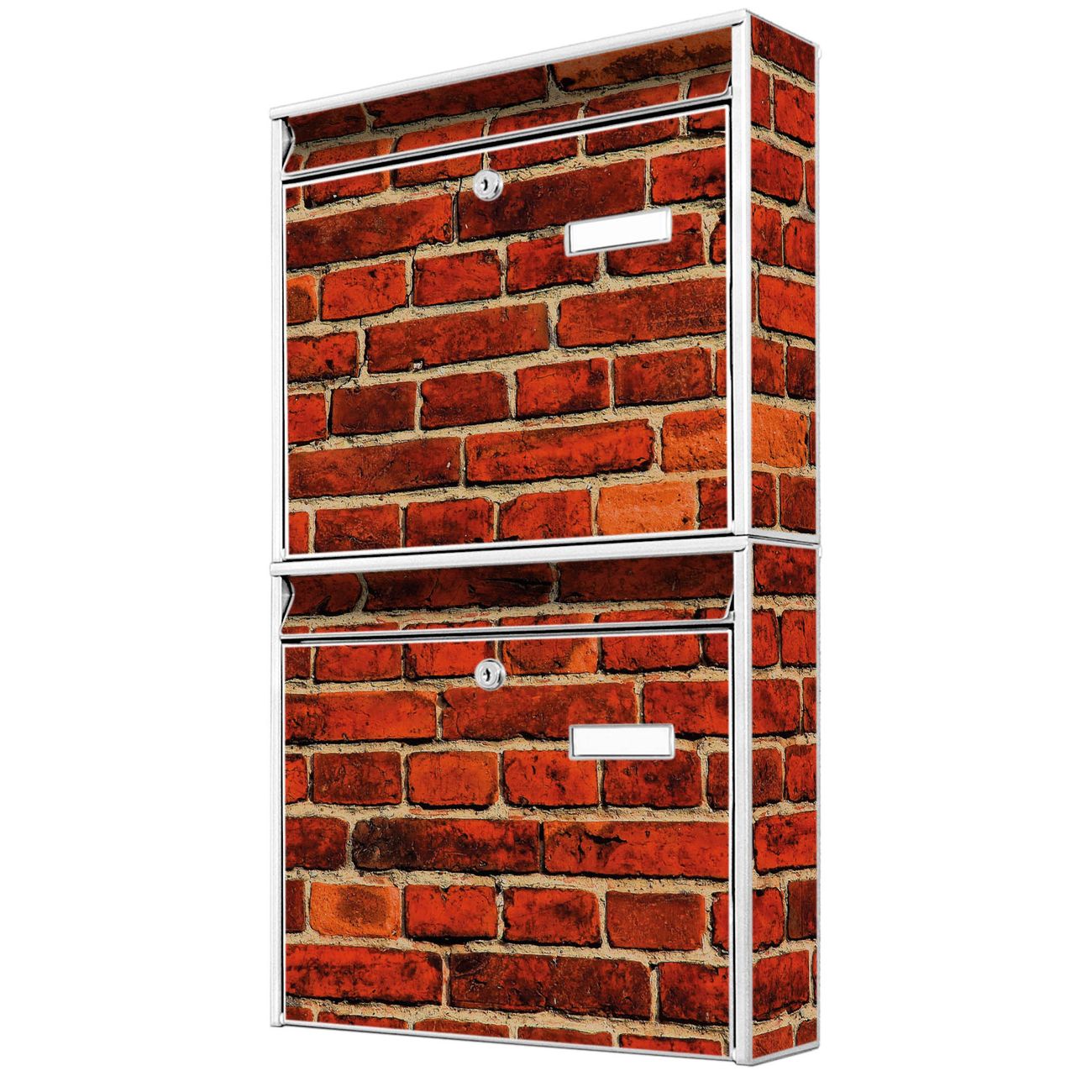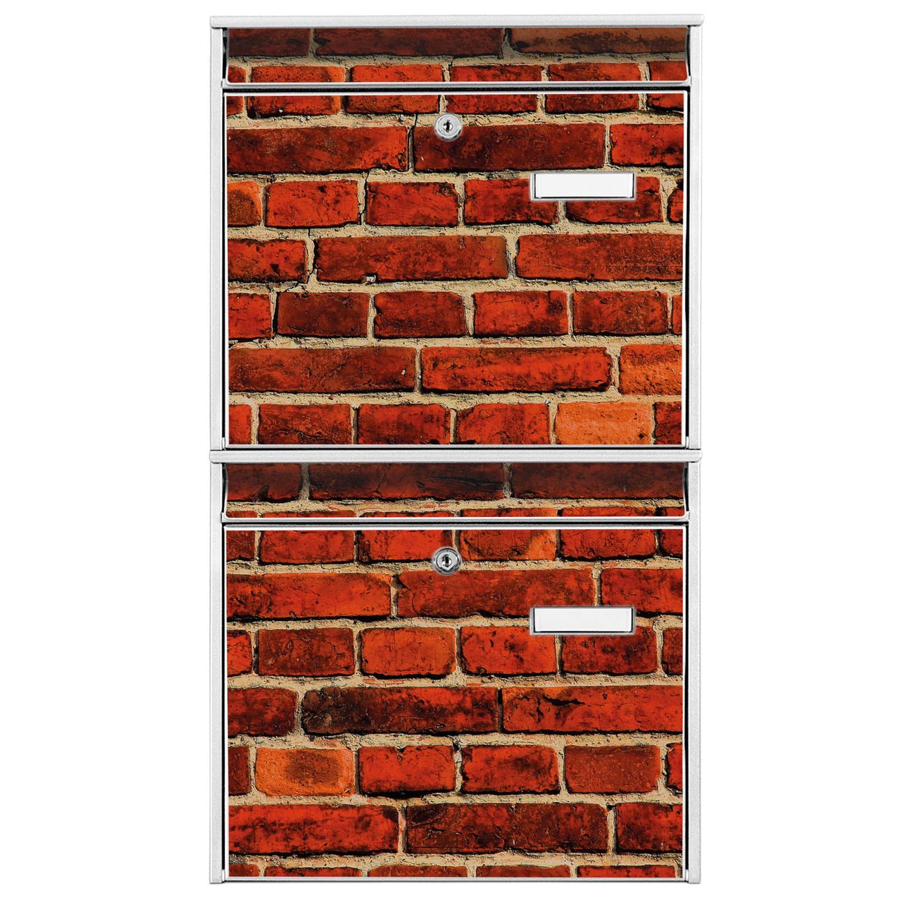 FUNKTION: Die Burg-Wächter Briefkastenanlage mit Motiv Ziegelwand bietet Ihnen ausreichend Fassungsvermögen um auch A4 und C4 Sendungen zu empfangen. Das integrierte Namensschild lässt sich individuell beschriften. Wählen Sie aus den Grundfarben weiß, silber und schwarz. DESIGN: Die 2 Briefkästen haben ein ansprechendes und zeitloses Design, ohne dabei auf Funktionalität zu verzichten. Das Material ist sehr stabil, wetterfest und rostfrei. Durch das Motiv Ziegelwand werden die Postkästen zu einem Blickfang. DETAILS: Die Postkästen bestehen aus verzinktem Stahl der zusätzlich mit Klarlack versiegelt wurde. Die Kästen sind gesamt 64,5cm hoch, 36,2cm breit und 10cm tief. Das Motiv besteht aus einer wetter- und UV-festen Folie, die Ihren Briefkasten zusätzlich vor Kratzern schützt. Die Postkästen werden mit Montagematerial, je einem Namensschild und je zwei Schlüsseln geliefert. NUTZEN: Das Briefkastenset eignet sich für die Wandmontage, die Größe bietet genügend Platz für Sendungen aller Art. Das zeitlose Design sowie die stabile Bauart bieten Ihnen einen treuen Begleiter für Ihre Post. BANJADO: