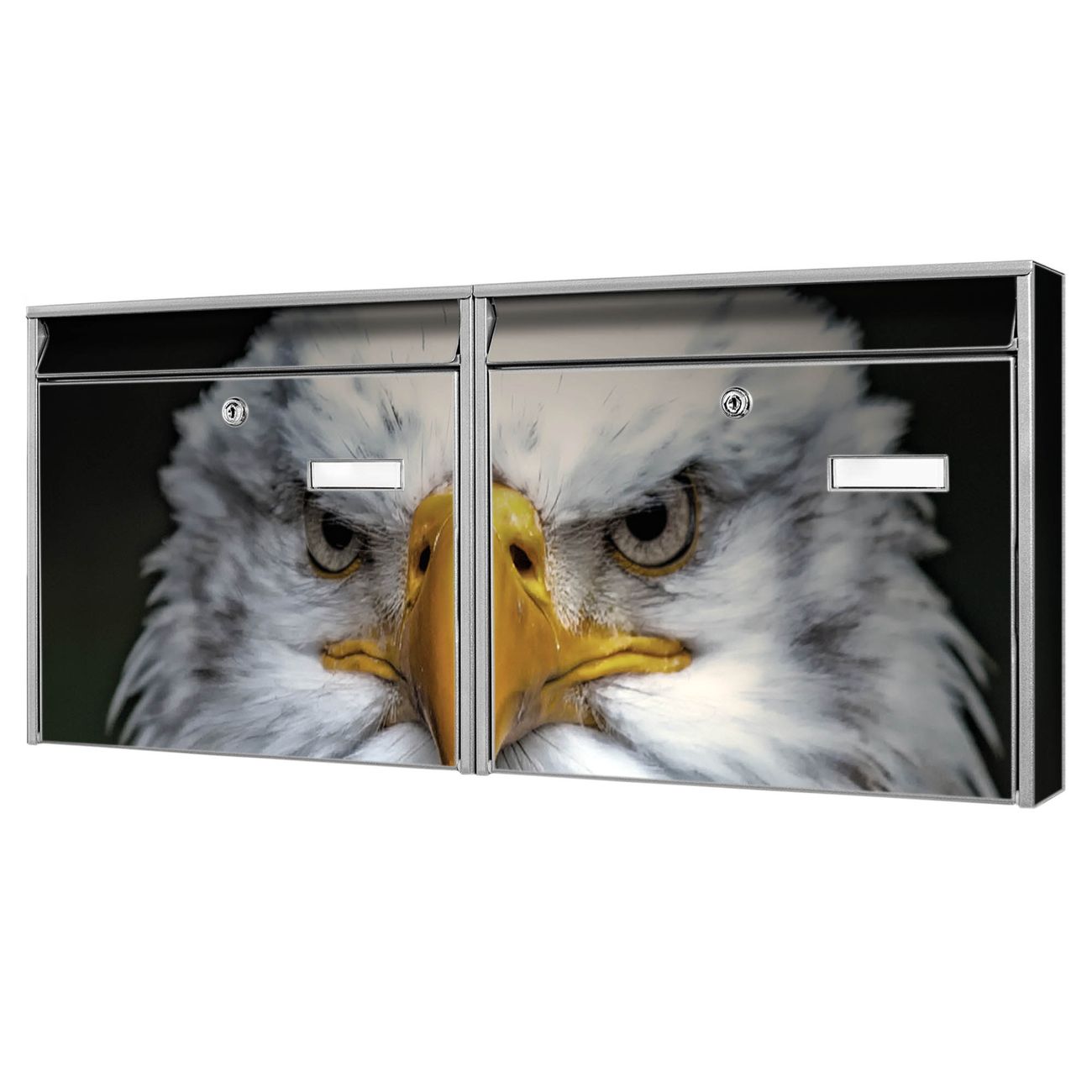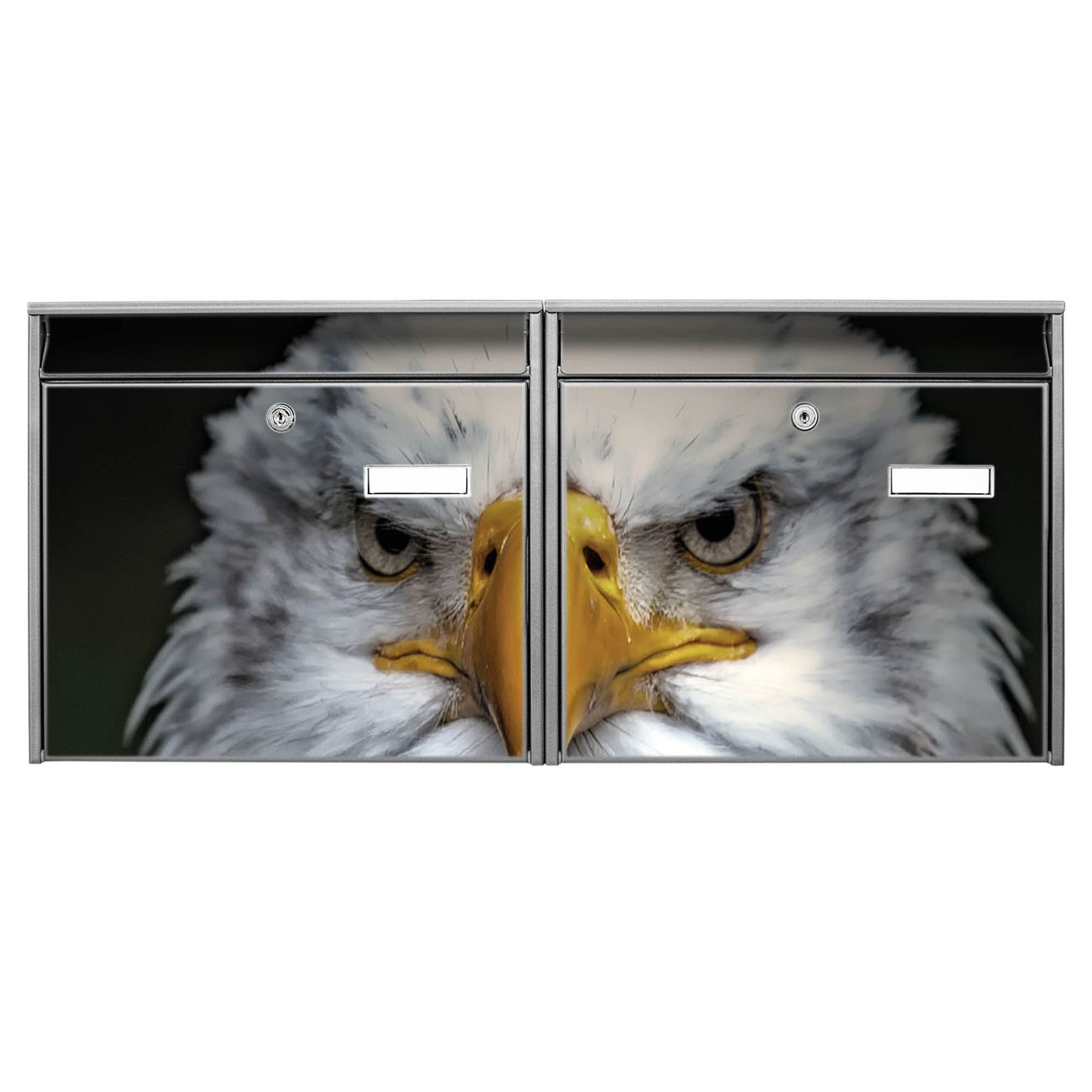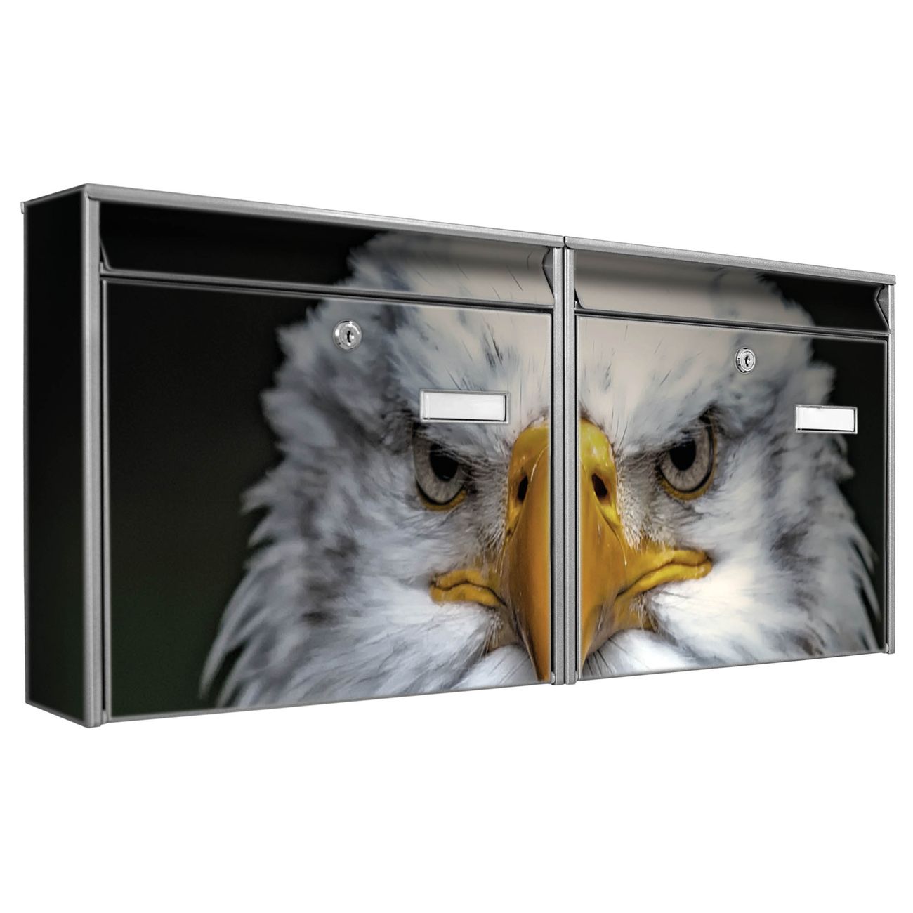 FUNKTION: Die Burg Wächter doppel Briefkastenanlage mit Motiv Adler bietet Ihnen ein großes Fassungsvermögen, sodass auch A4 Sendungen eingeworfen werden können. Das Namensschild lässt sich individuell beschriften. DESIGN: Die 2 Briefkästen mit Adler Motiv haben ein sehr ansprechendes und zeitloses Design. Heben Sie Sich von der tristen grauen Masse ab, ohne auf Funktionalität zu verzichten. Sie erhalten 2 Schlüssel sowie das Montagematerial. DETAILS: Der Doppelbriefkasten besteht aus verzinktem Stahl weiß. Er ist 72,5cm x 32,2cm x 10cm groß. Das Motiv besteht aus einer wetter- und UV-festen Folie, die Ihren Briefkasten zusätzlich vor Kratzern schützt. NUTZEN: Die stabile Bauart sowie die Wetterfestigkeit machen diese doppel Briefkästen zu einem zuverlässigen Begleiter im Alltag. Effektvoll in Reihe gehangen schmückt die Anlage jede Hauswand. BANJADO: Ihr Briefkasten wird in Sachsen in einer kleinen Manufaktur von Hand veredelt. Die Motivfolie ist lösungsmittelfrei und schutzlaminiert für einen langen Halt. Wir legen großen Wert auf die Verbindung von Funktionalität und Design. Sie erhalten Handarbeit aus Sachsen.