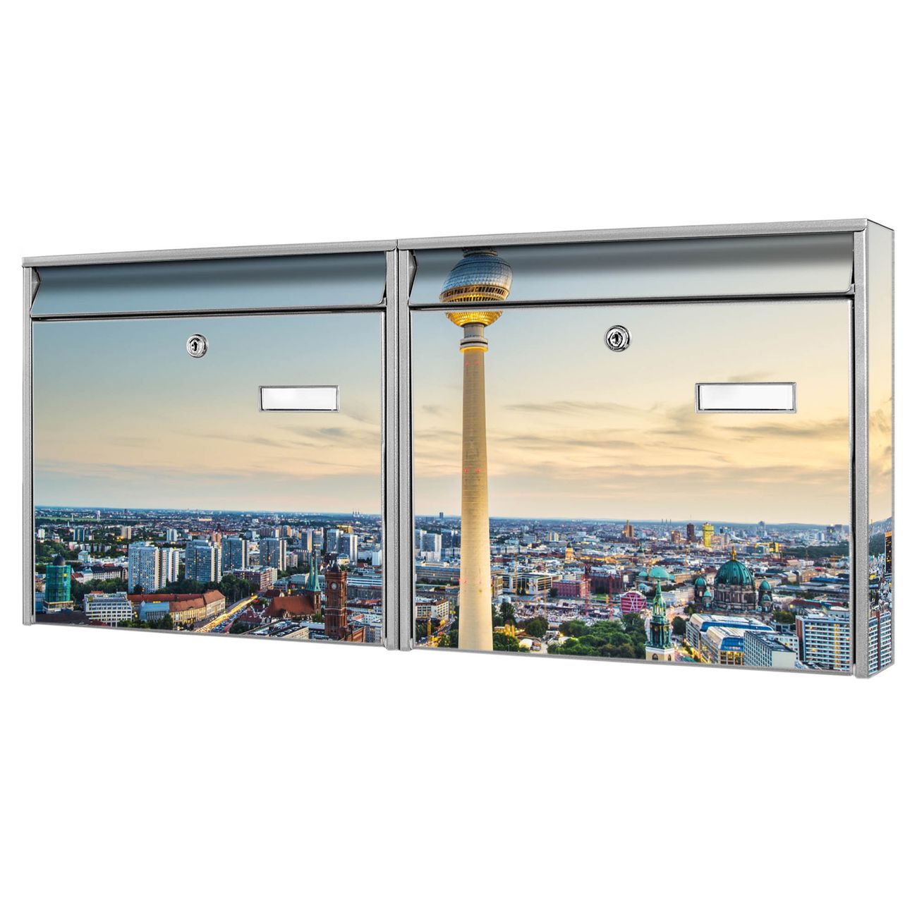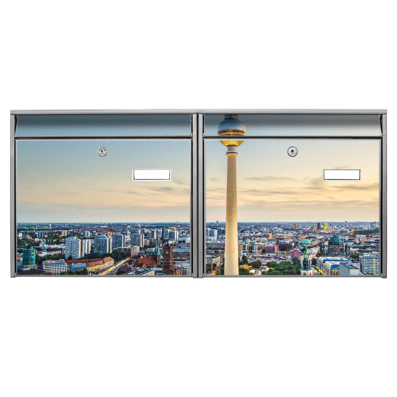 FUNKTION: Die Burg Wächter doppel Briefkastenanlage mit Motiv Alexanderplatz bietet Ihnen ein großes Fassungsvermögen, sodass auch A4 Sendungen eingeworfen werden können. Das Namensschild lässt sich individuell beschriften. DESIGN: Die 2 Briefkästen mit Alexanderplatz Motiv haben ein sehr ansprechendes und zeitloses Design. Heben Sie Sich von der tristen grauen Masse ab, ohne auf Funktionalität zu verzichten. Sie erhalten 2 Schlüssel sowie das Montagematerial. DETAILS: Der Doppelbriefkasten besteht aus verzinktem Stahl weiß. Er ist 72,5cm x 32,2cm x 10cm groß. Das Motiv besteht aus einer wetter- und UV-festen Folie, die Ihren Briefkasten zusätzlich vor Kratzern schützt. NUTZEN: Die stabile Bauart sowie die Wetterfestigkeit machen diese doppel Briefkästen zu einem zuverlässigen Begleiter im Alltag. Effektvoll in Reihe gehangen schmückt die Anlage jede Hauswand. BANJADO: Ihr Briefkasten wird in Sachsen in einer kleinen Manufaktur von Hand veredelt. Die Motivfolie ist lösungsmittelfrei und schutzlaminiert für einen langen Halt. Wir legen großen Wert auf die Verbindung von Funktionalität und Design. Sie erhalten Handarbeit aus Sachsen.